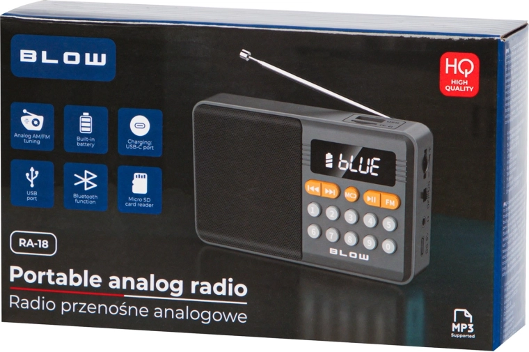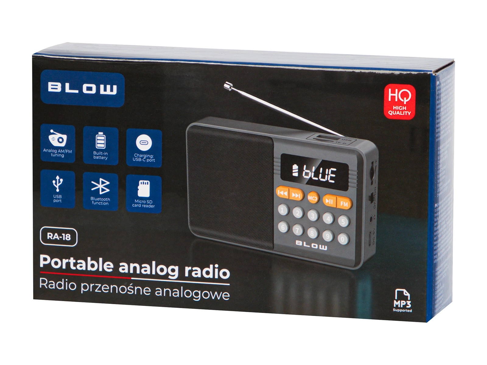 BLOW RA18 este un radio portabil practic, care îmbină recepția analogică AM/FM cu conectivitatea modernă. Ca boxă Bluetooth fără fir redă muzică de pe telefon, laptop sau tabletă și, în același timp, suportă MP3 de pe carduri microSD și stick‑uri USB. Datorită dimensiunilor compacte, curelei de mână și controlului intuitiv, este ideal pentru călătorii, birou și șantier.