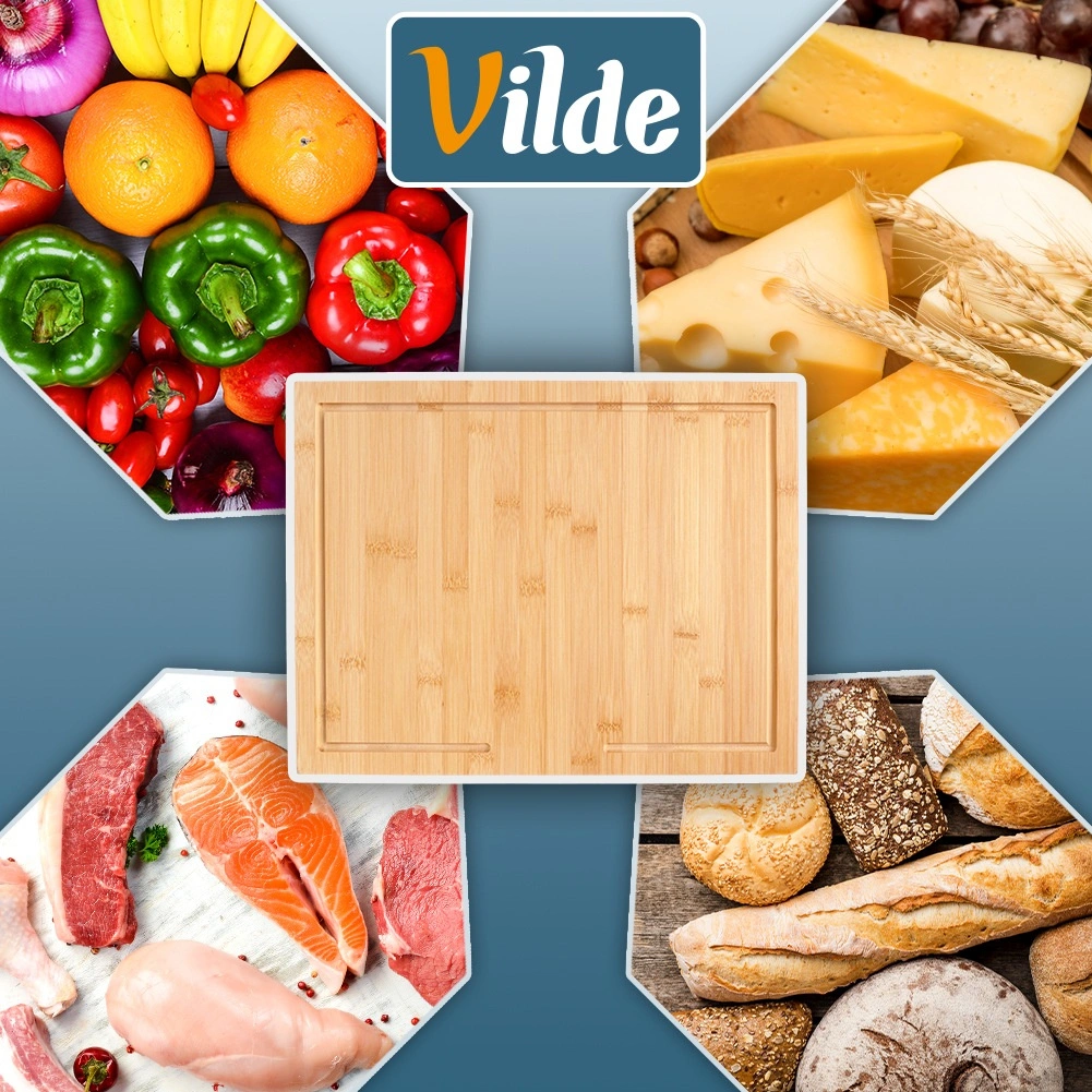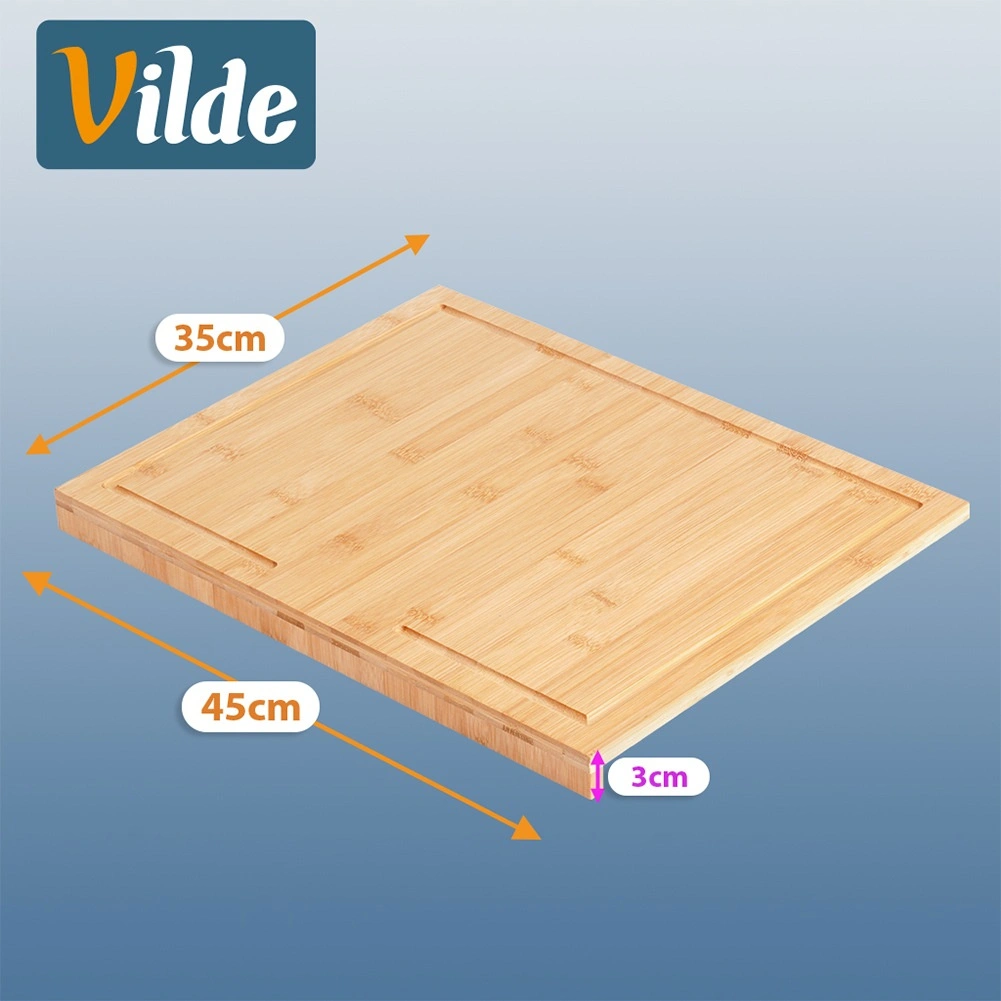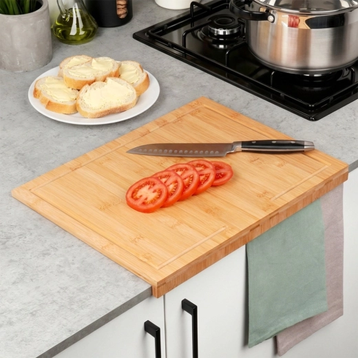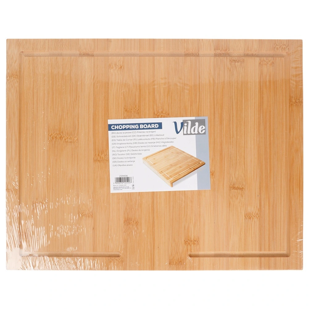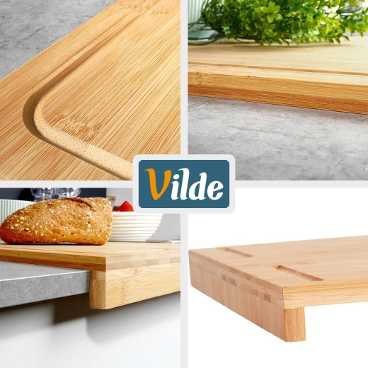 Tocătorul din bambus cu margine combină stabilitatea, igiena și versatilitatea. Marginea la 90° se sprijină pe blatul de bucătărie și împiedică alunecarea tocătorului în timpul utilizării. Suprafața generoasă de 45 × 35 cm este ideală pentru tăierea legumelor, cărnii și produselor de panificație și, totodată, servește excelent ca planșetă pentru pregătirea aluatului și a bunătăților de casă.
