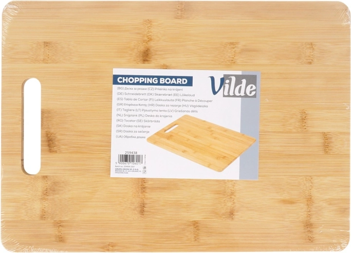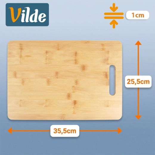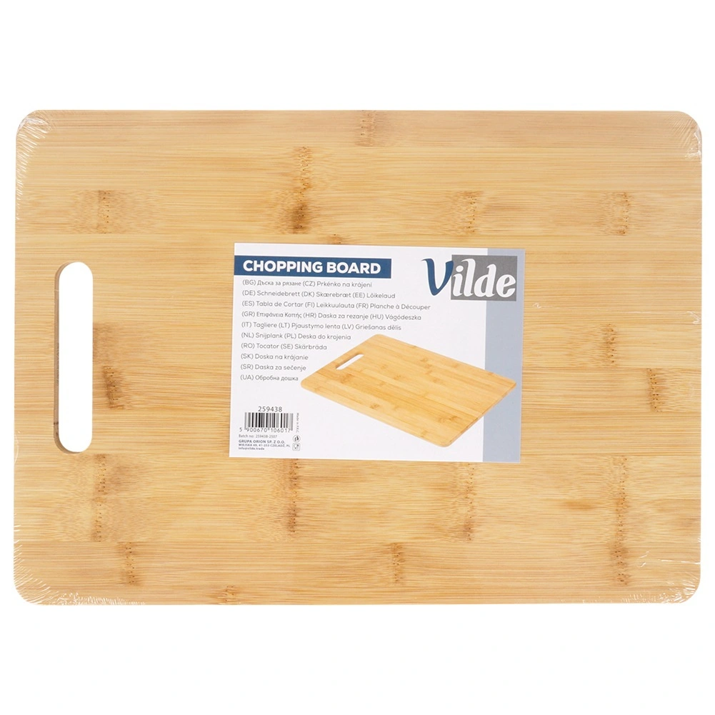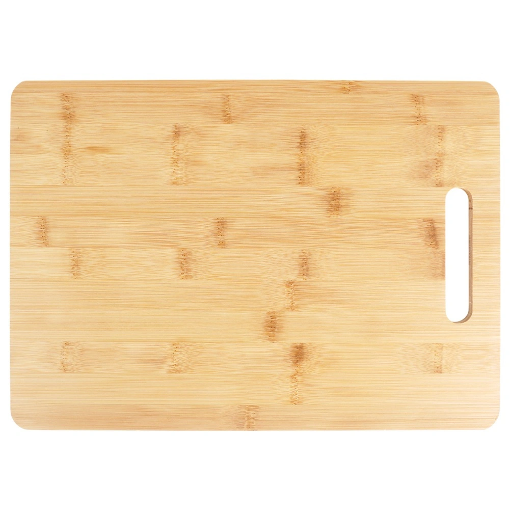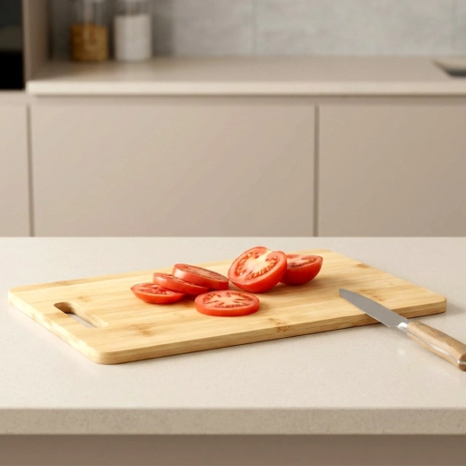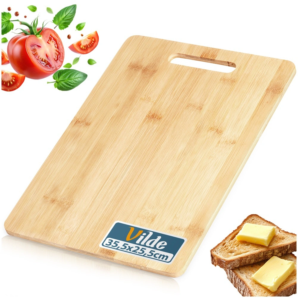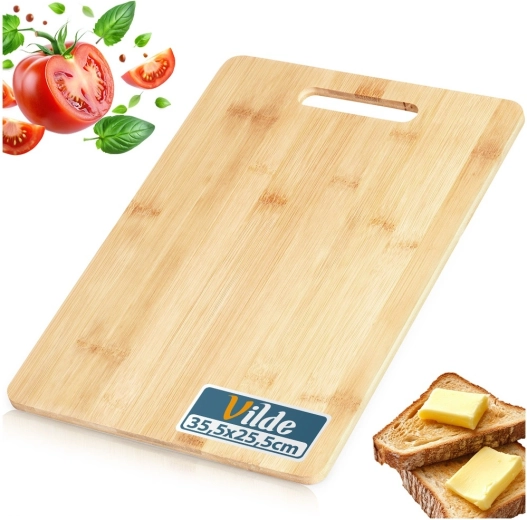 Tocător practic din bambus, cu dimensiunile 35,5 × 25,5 cm și grosime de 1 cm, ideal pentru tăierea zilnică și servirea cu stil. Datorită materialului natural, este rezistent la umiditate, se usucă rapid și este blând cu lamele cuțitelor. Mânerul ergonomic integrat facilitează transportul și agățarea, iar suprafața netedă cu fibre fine de lemn adaugă bucătăriei tale un aspect natural.