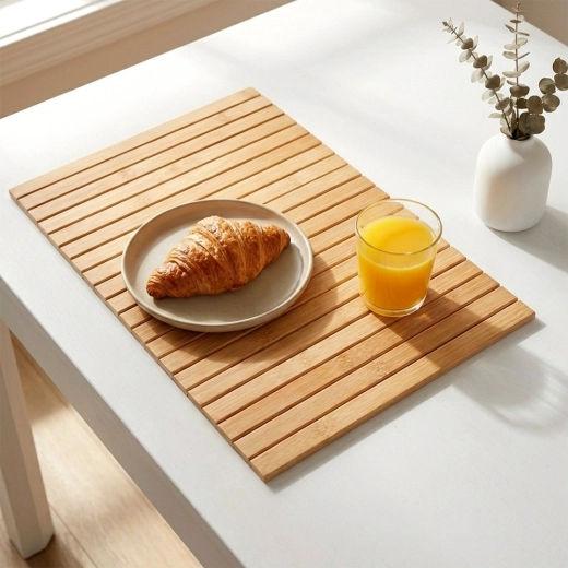 Acest suport din bambus cu dimensiunile 44 × 24 cm este un ajutor universal pentru bucătărie și living. Bambusul natural conferă interiorului un aspect aerisit și modern, în timp ce lamelele solide protejează fiabil suprafețele împotriva căldurii, umidității și zgârieturilor. Datorită execuției flexibile, îl adaptezi ușor diferitelor suprafețe.