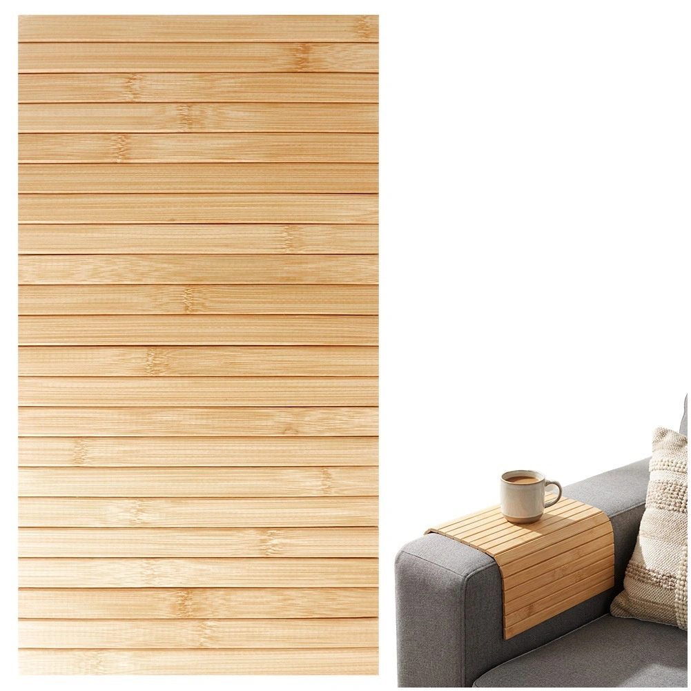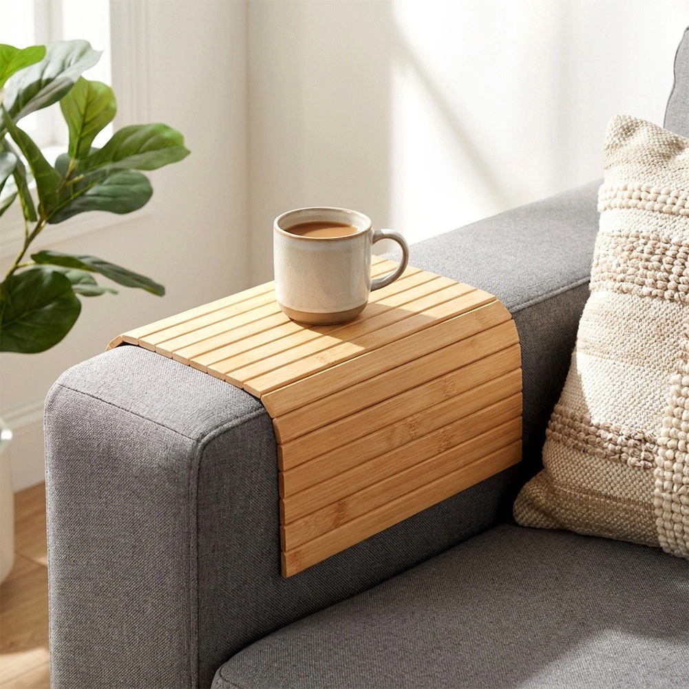 Lamelele se adaptează formei brațului și creează o suprafață plană pentru cană, pahar sau mărunțișuri – o soluție practică fără măsuță laterală.