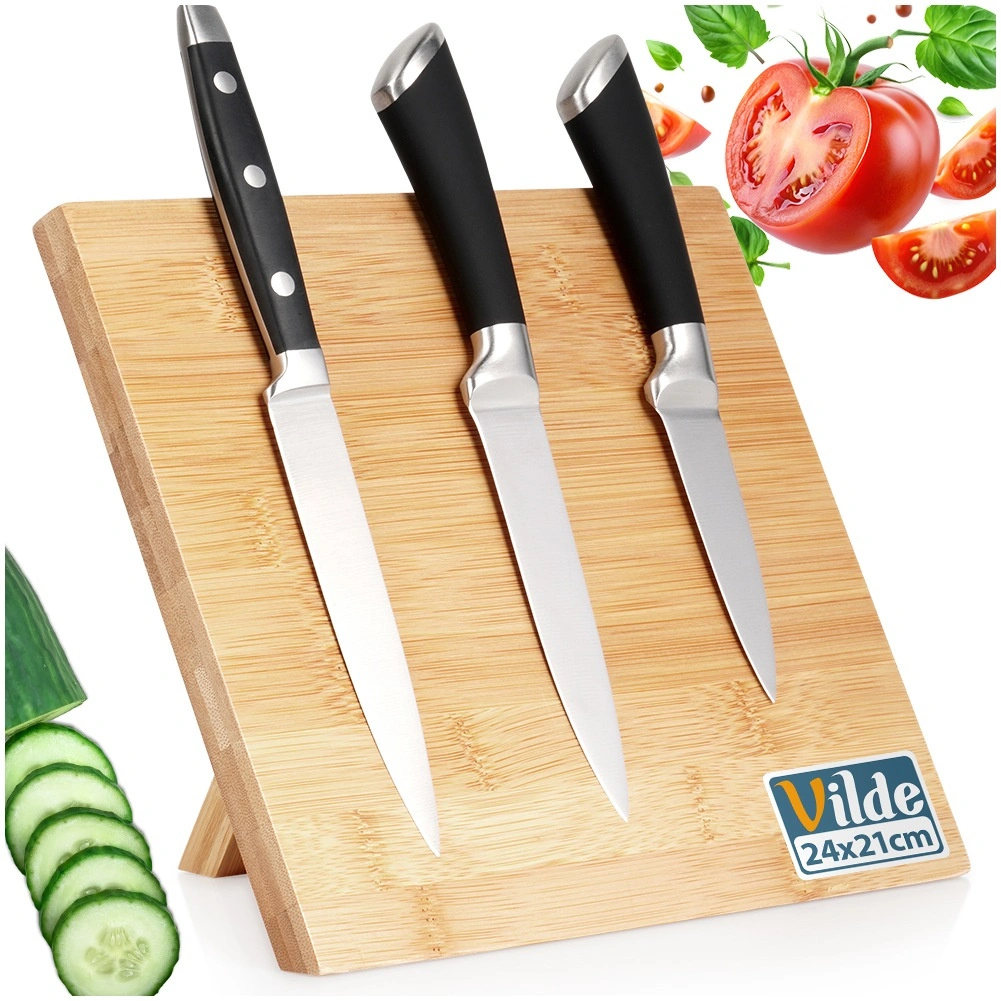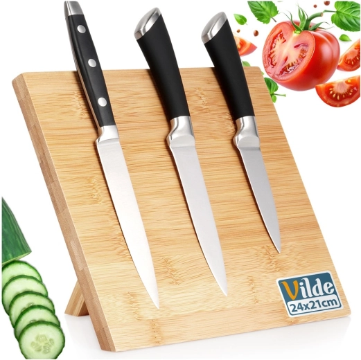 Suportul magnetic pentru cuțite din bambus natural este un accesoriu practic și decorativ pentru orice bucătărie. Datorită magneților puternici integrați, este suficient să apropii cuțitele – fără a le introduce în fante, ceea ce minimizează contactul tăișului cu suprafețele și le prelungește durata de viață.