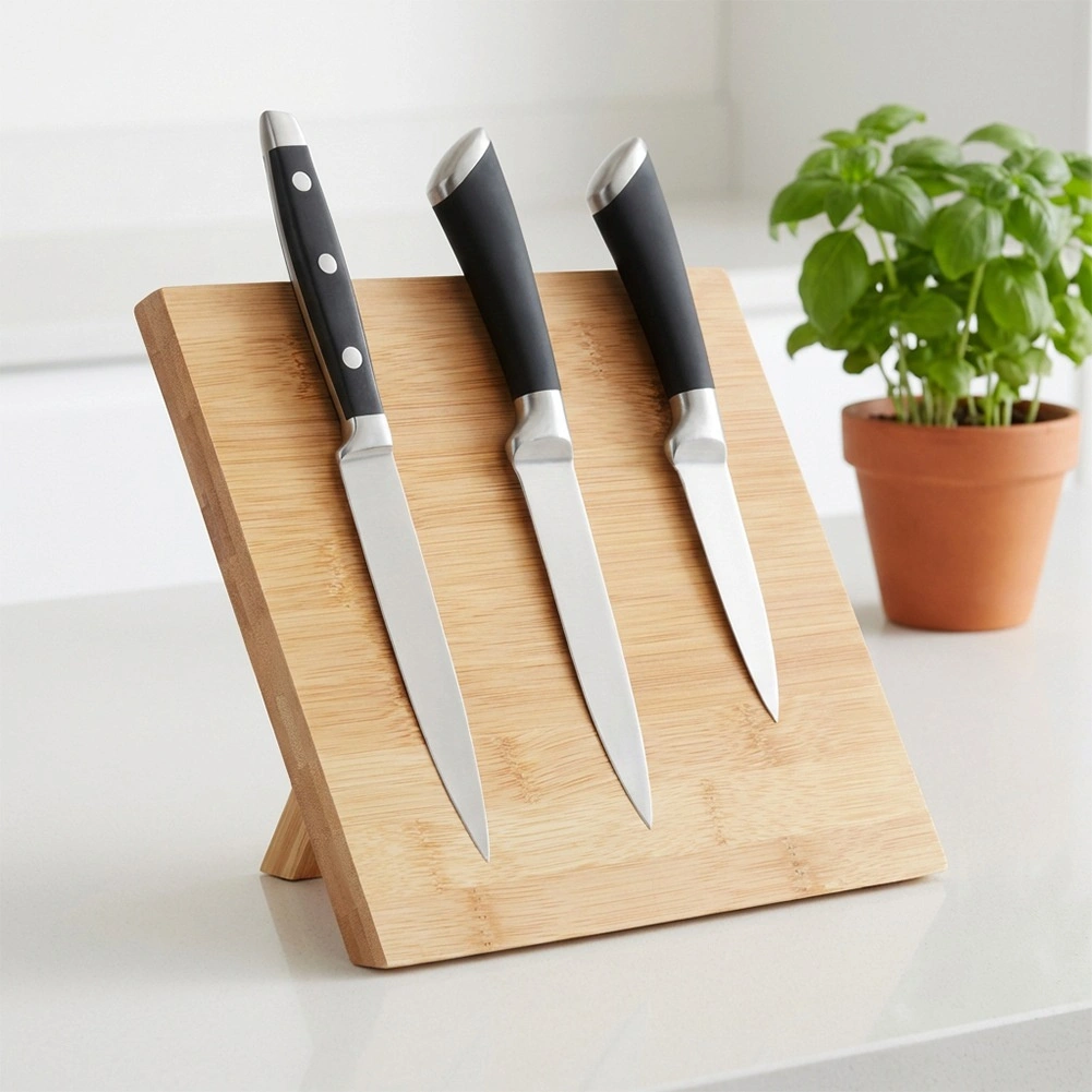 Magnetii integrați fixează fiabil cuțitele și ustensilele metalice fără a fi nevoie de fante – tăișul rămâne protejat și mereu la îndemână.