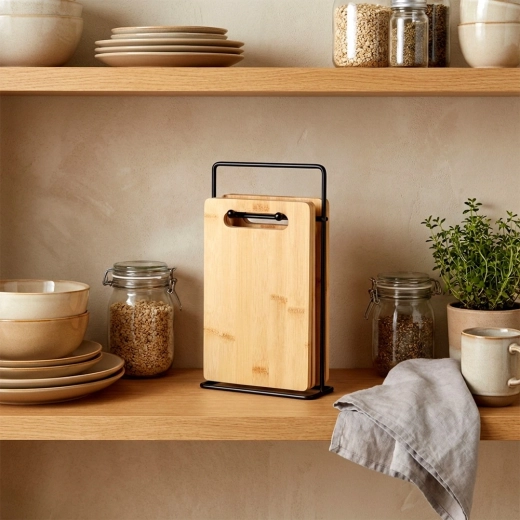 Setul de tocătoare din bambus este ideal pentru tăierea zilnică a legumelor, fructelor, produselor de panificație și cărnii. Datorită dimensiunilor compacte, nu ocupă inutil spațiu pe blatul de lucru, iar suportul asigură că tocătoarele sunt mereu la îndemână și aerisite igienic. Aspectul natural, atemporal, se potrivește în orice bucătărie.