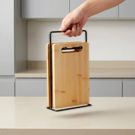 Suportul metalic negru menține tocătoarele în poziție verticală, economisește spațiu pe blat și asigură depozitare ordonată și uscare rapidă.