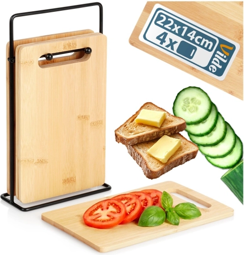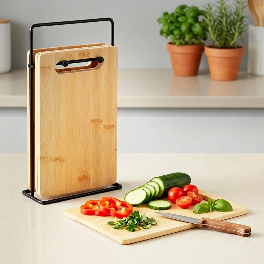 Tocătoarele de 22 × 14 × 0,7 cm se potrivesc bine în mână și sunt ideale pentru legume, fructe, produse de panificație și porții mici de carne. Suportul păstrează totul la un loc.