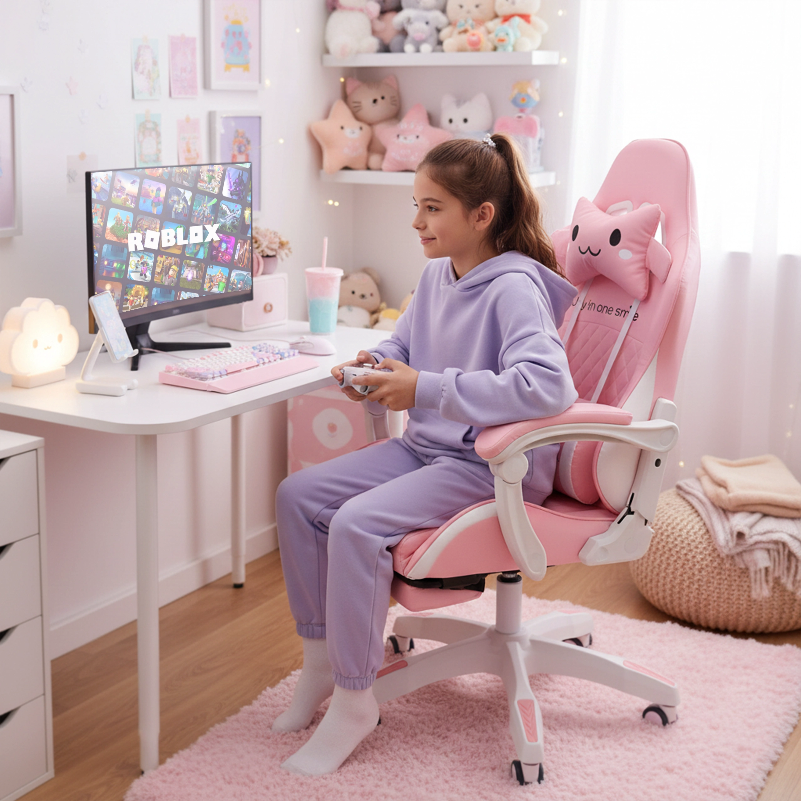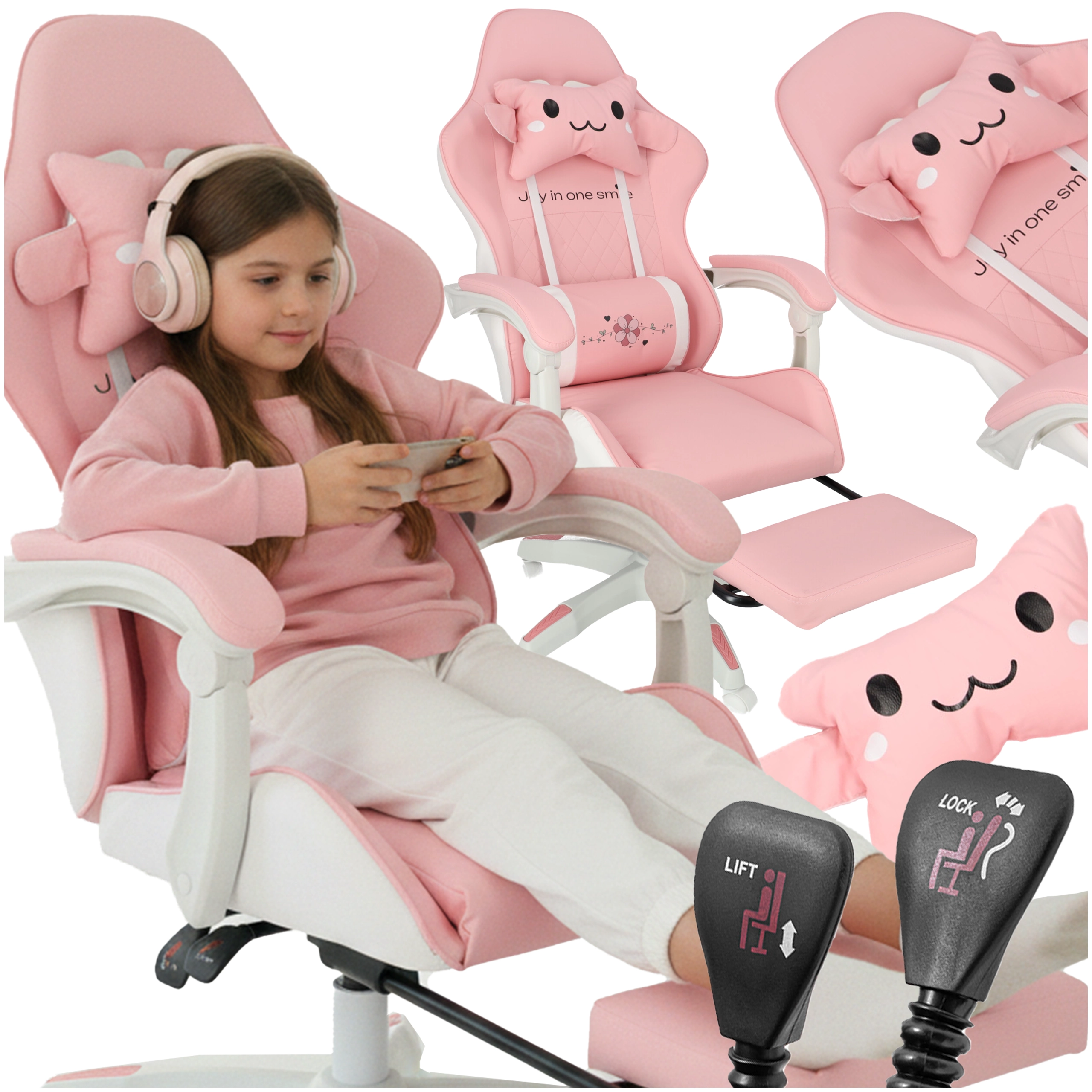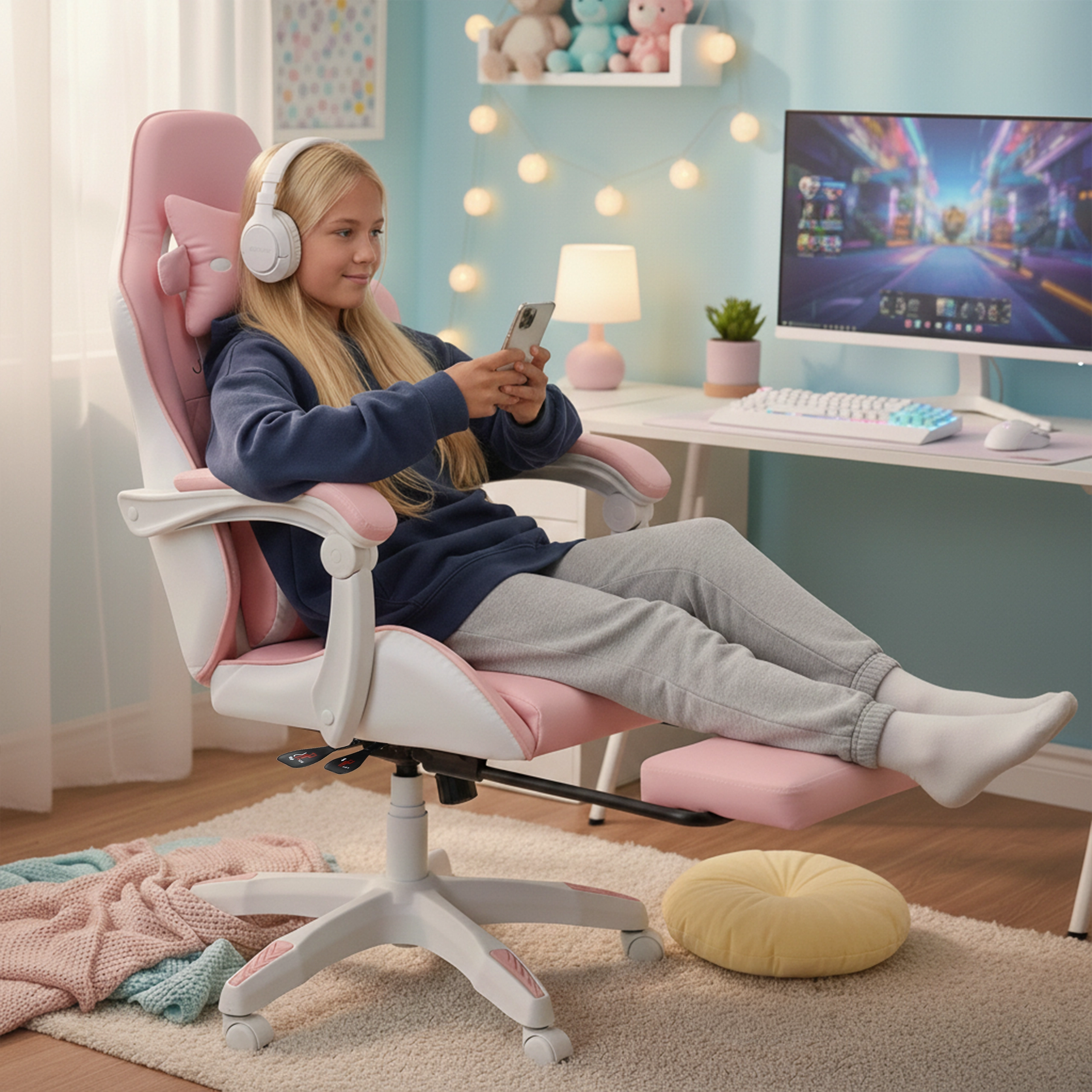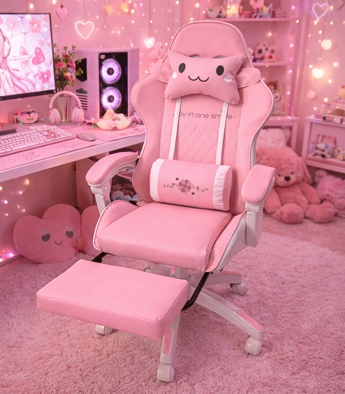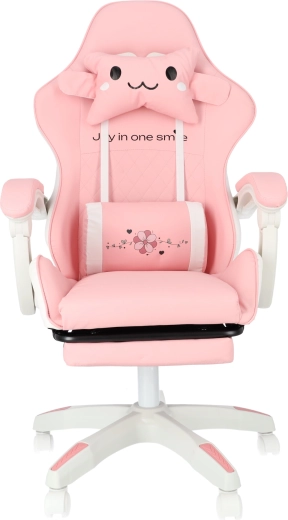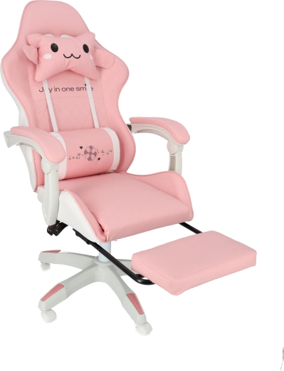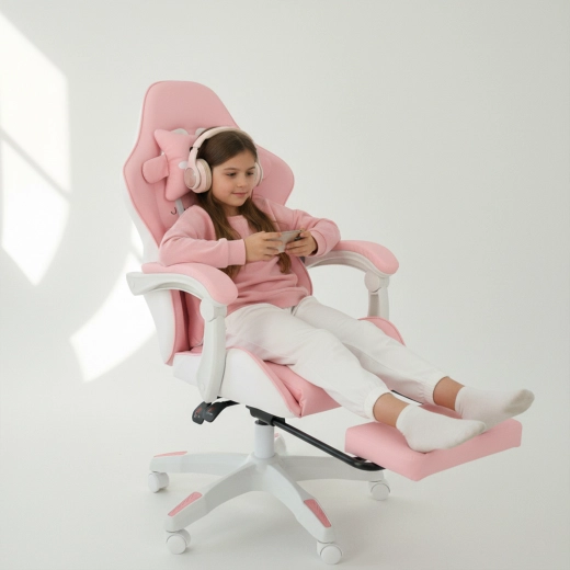 Scaunul roz pentru copii, de gaming și birou, combină confort ergonomic, înălțime reglabilă și suport de picioare extensibil pentru odihnă rapidă. Scaunul tip bucket oferă susținere stabilă pentru spate, cotiere moi cu spumă și rotire lină la 360° cu roți, ușurând atât învățatul, cât și joaca. Include pernuțe pentru gât și zona lombară pentru o ședere mai sănătoasă în camera copilului.