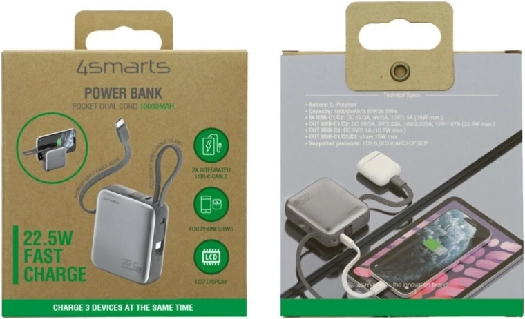 Powerbank compactă și performantă 4smarts Pocket Dual Cord oferă o capacitate de 10000 mAh, încărcare rapidă de 22,5 W și cablu USB‑C (15 cm) integrat. Datorită porturilor USB‑C și USB‑A, poate încărca simultan două dispozitive și suportă cele mai răspândite standarde PD, QC 3.0, SCP/FCP și AFC. Un ecran LED clar afișează nivelul bateriei, iar protecțiile avansate asigură o funcționare în siguranță.