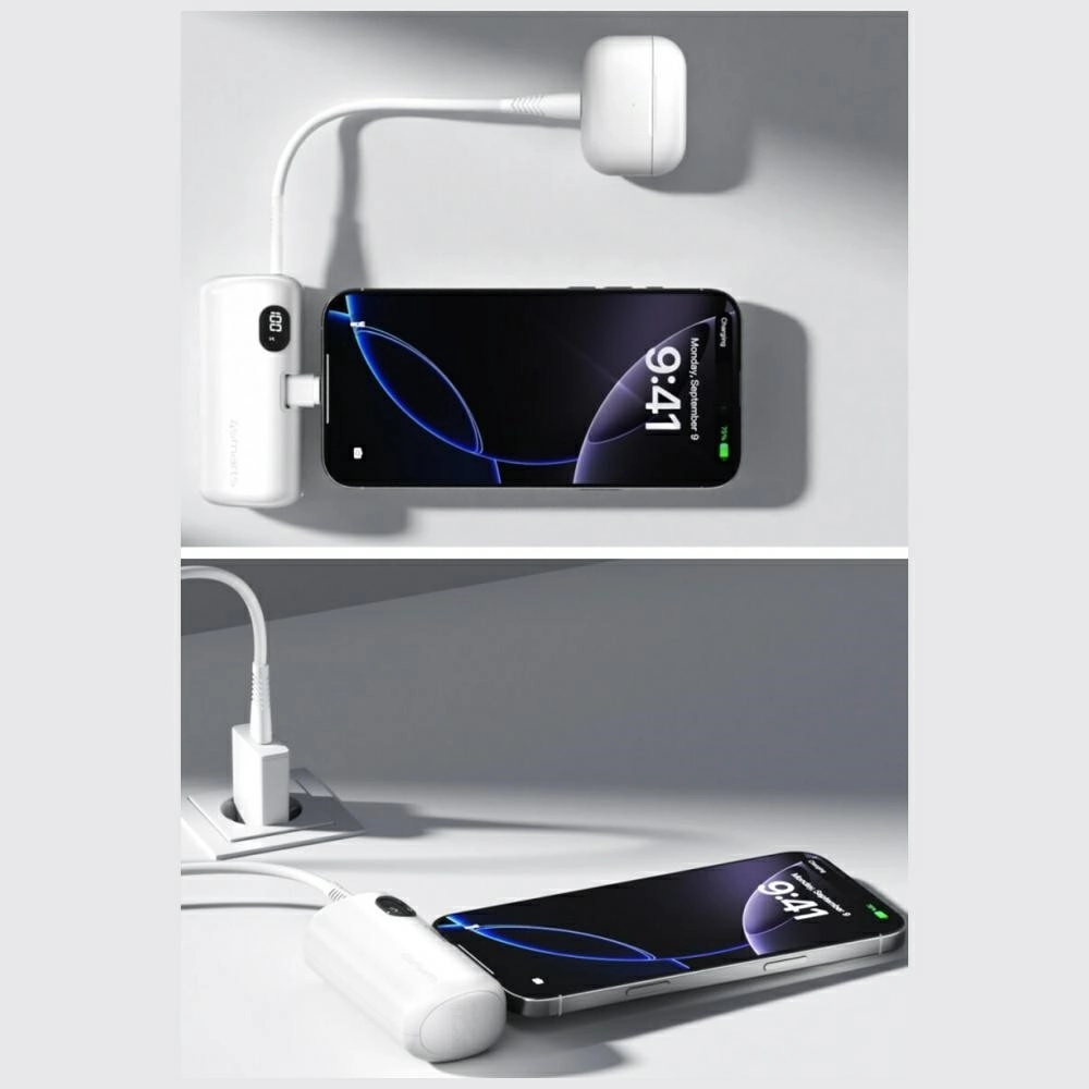 Datorită construcției pliabile, de buzunar, o puteți pune cu ușurință în buzunar, geantă sau rucsac. Cablurile integrate (USB‑C, Lightning sau Micro USB, în funcție de versiune) economisesc spațiu și timp – nu mai trebuie să vă ocupați de cabluri suplimentare. Finisajul mat robust este rezistent la zgârieturi și arată excelent chiar și la utilizare zilnică.