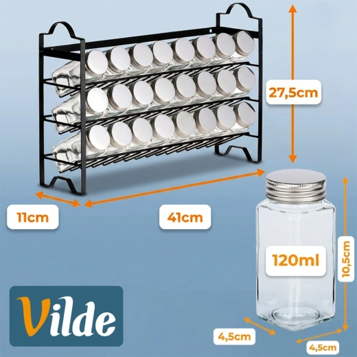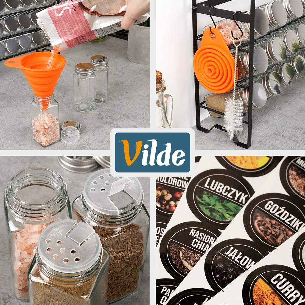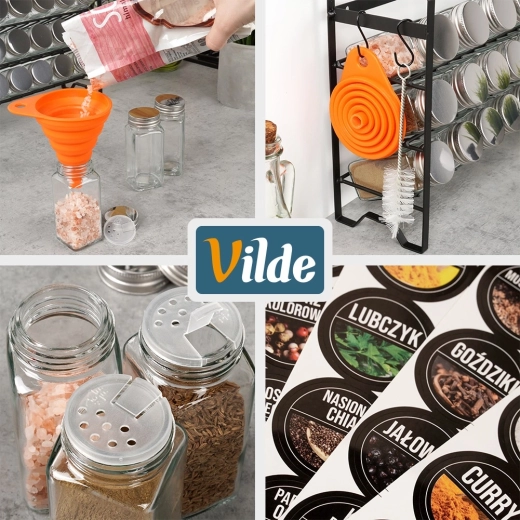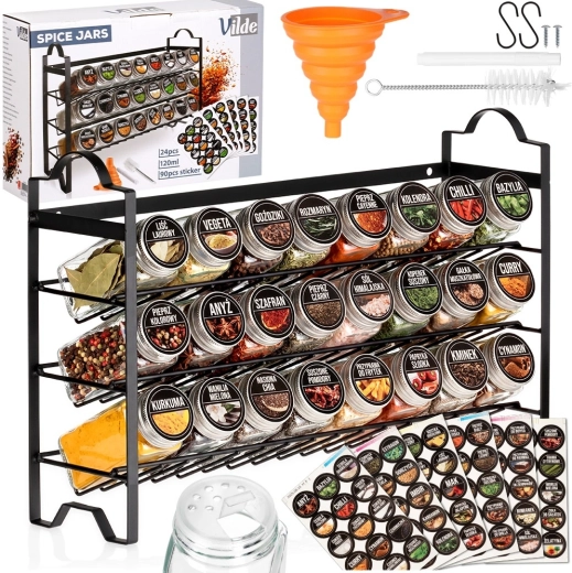 În pachet găsiți totul pentru o organizare rapidă: 90 de etichete autoadezive pentru marcarea tipurilor de condimente, pâlnie pliabilă din silicon pentru turnare ușoară, perie pentru curățarea gâtului și 2 agățători pentru suspendarea accesoriilor mici. Etajera poate fi plasată pe blatul de bucătărie sau pe masă și, datorită aspectului industrial, se potrivește atât în interioare moderne, cât și clasice.