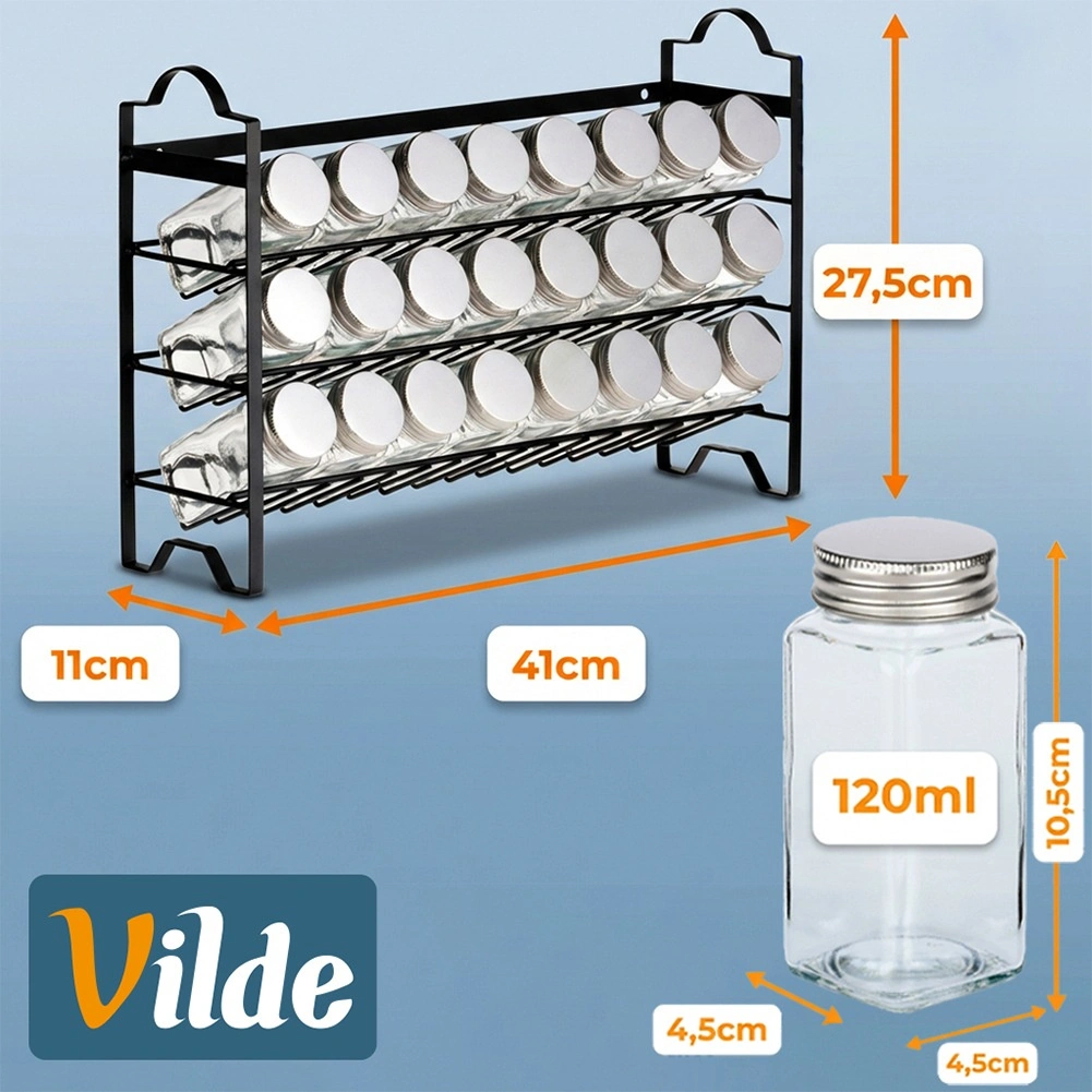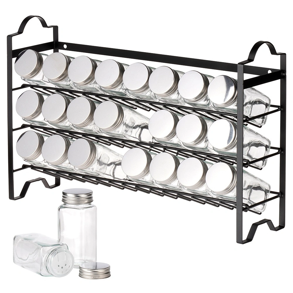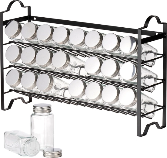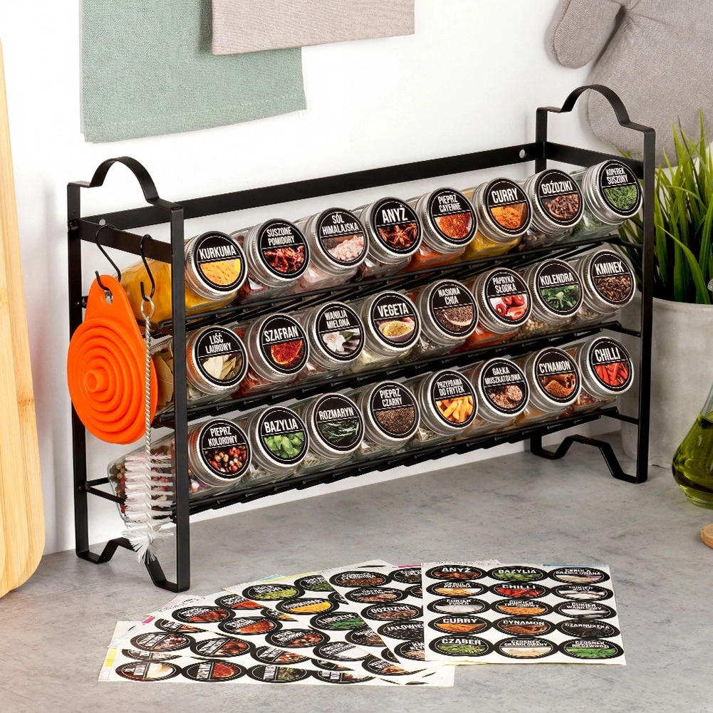 Organizare stilată și funcțională a condimentelor pentru gătitul de zi cu zi. Etagera metalică neagră cu trei etaje oferă depozitare clară pentru condimente, ierburi și mici accesorii de bucătărie. Borcanele de sticlă cu site transparente facilitează dozarea, iar capacele etanșe protejează de umiditate pentru a păstra aroma condimentelor mai mult timp.