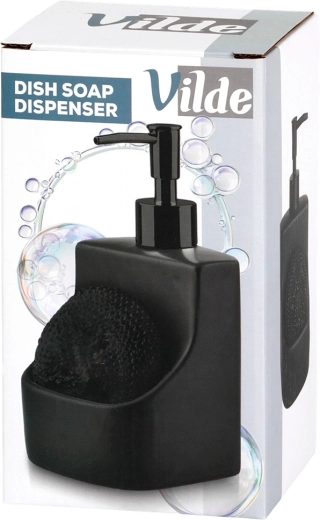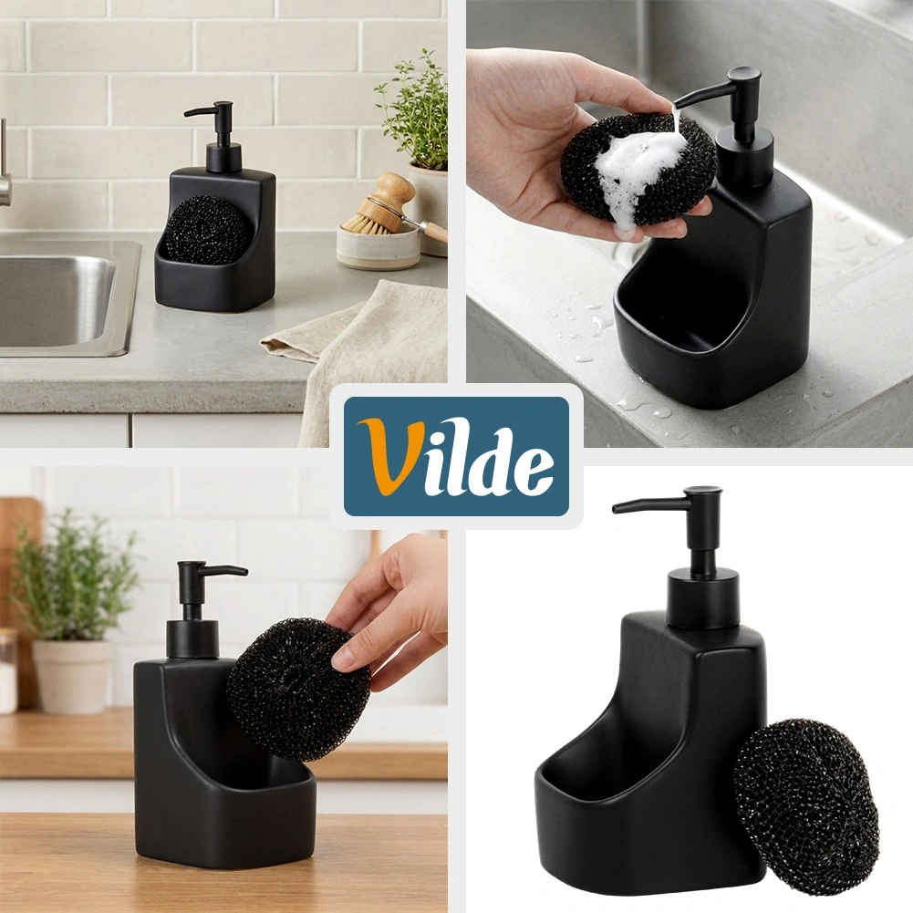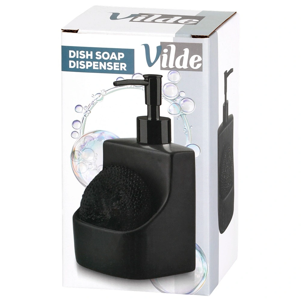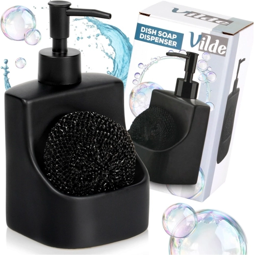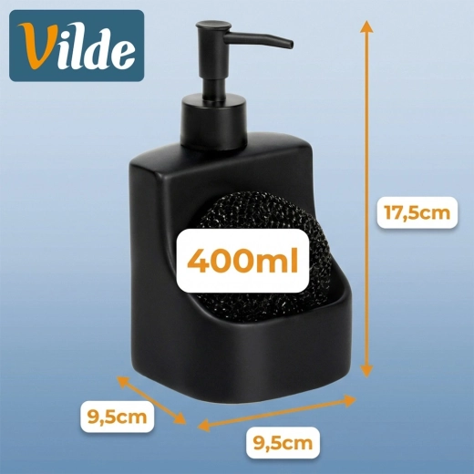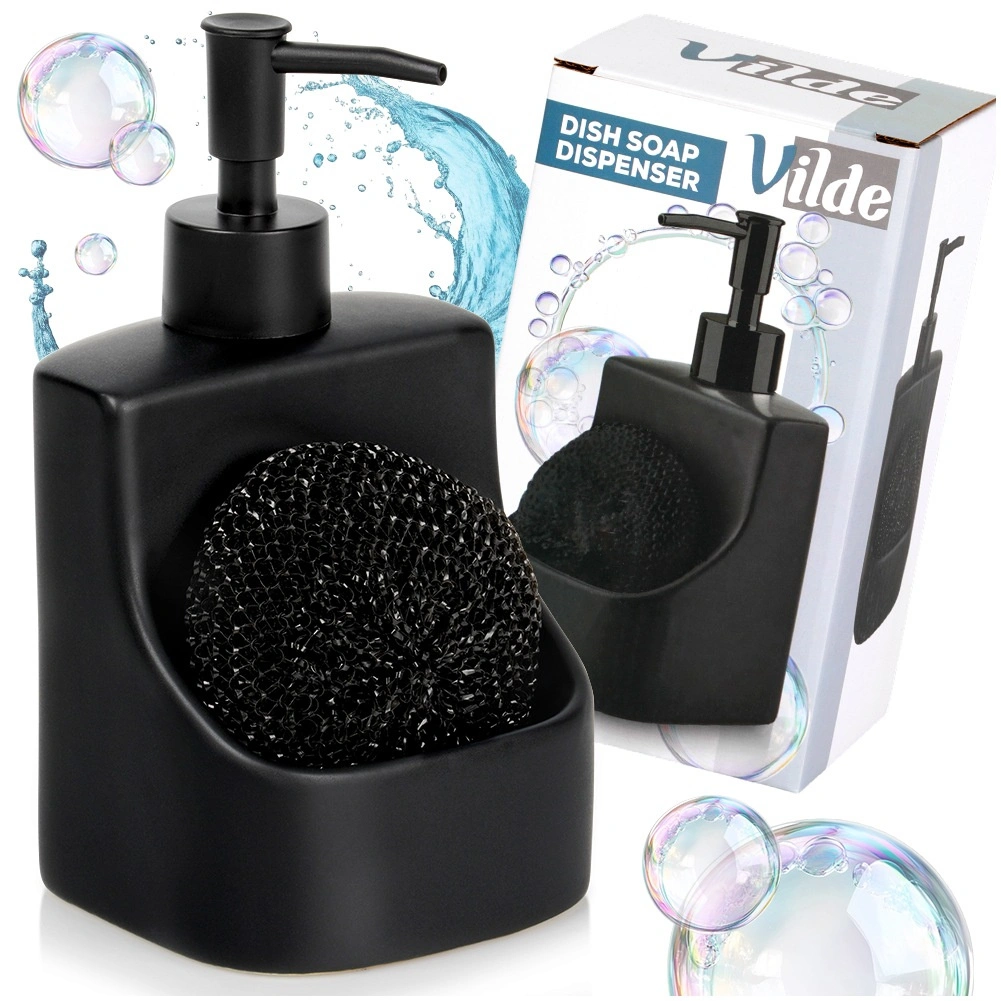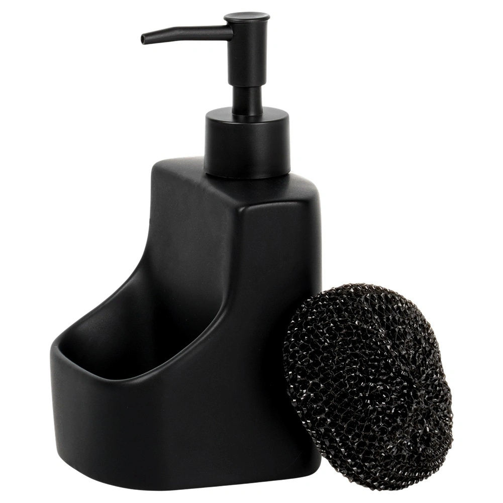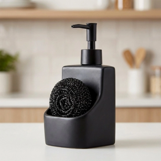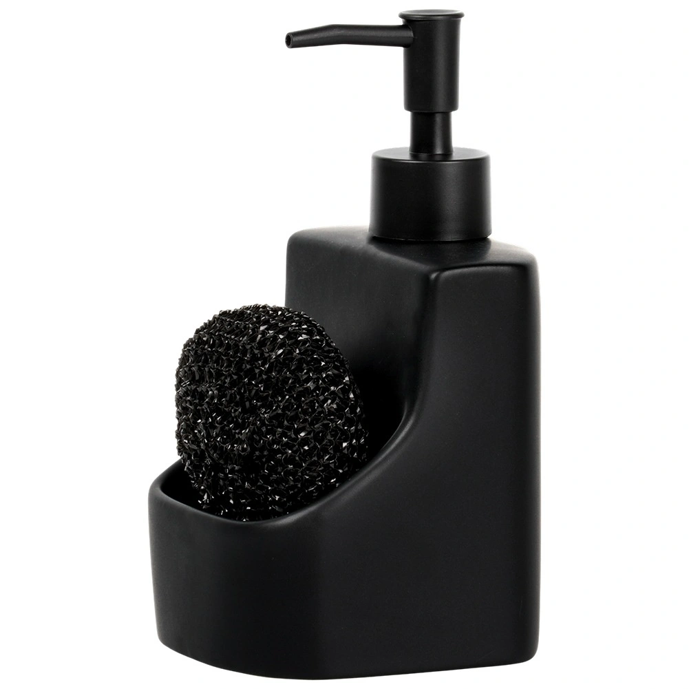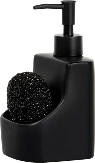 Dozator ceramic elegant pentru vase, cu compartiment integrat și burete negru, cu un volum de 400 ml. Finisaj negru mat, buzunar practic pentru burete și reumplere ușoară care îl transformă într-un accesoriu stilat și funcțional pentru orice bucătărie sau baie.