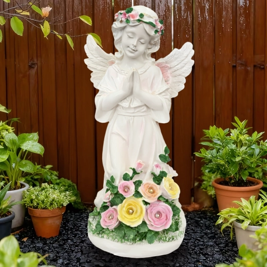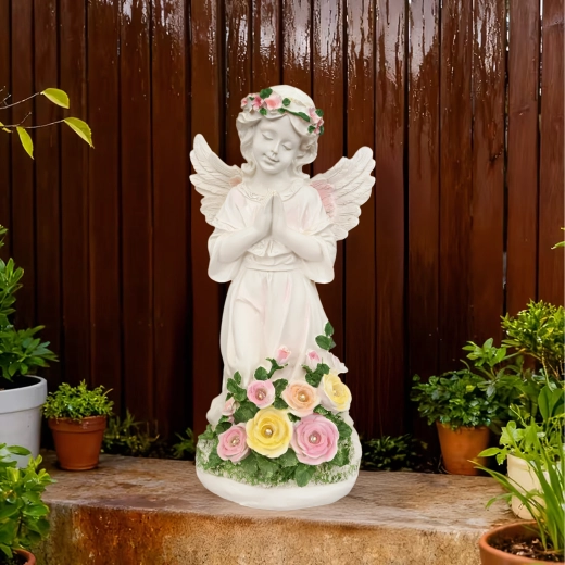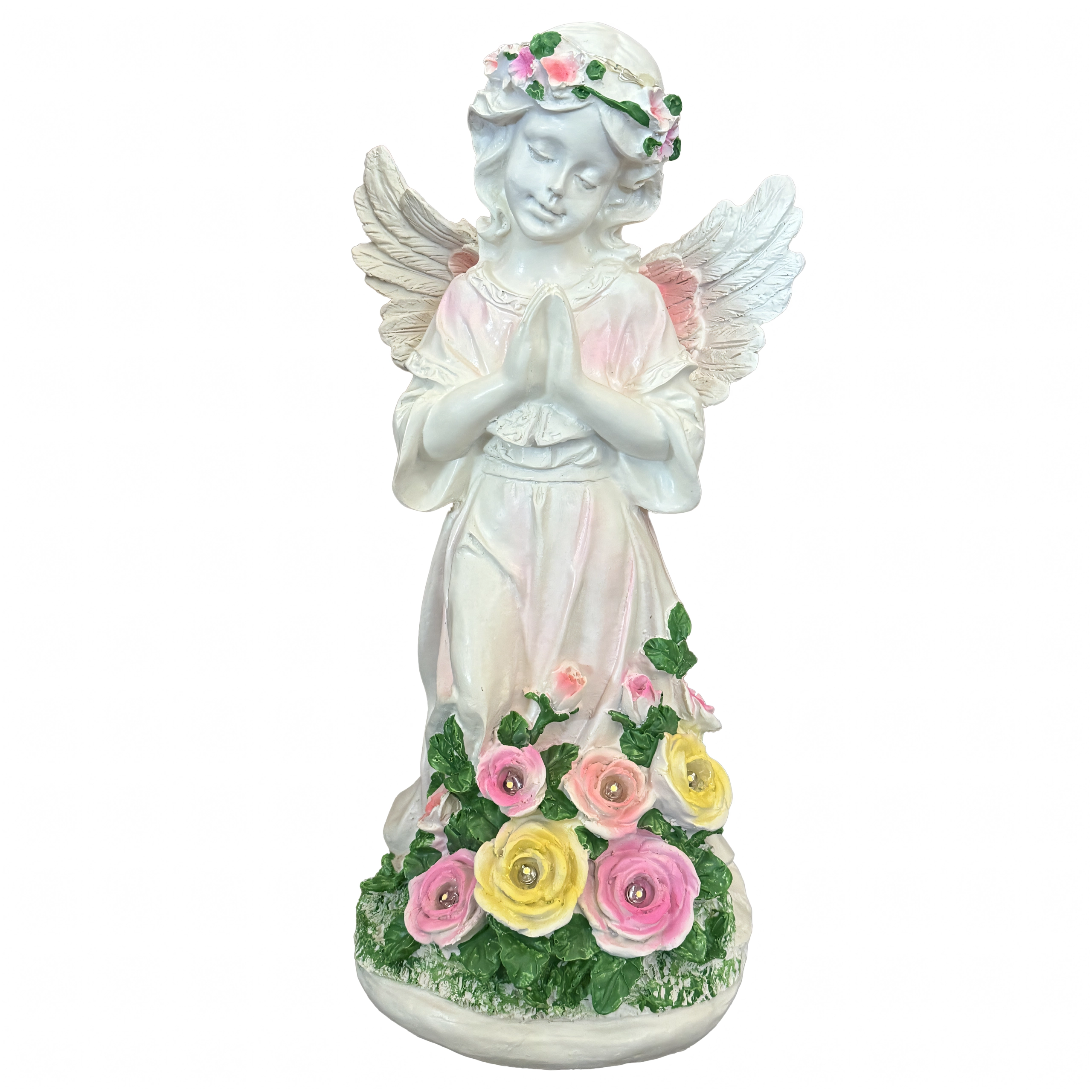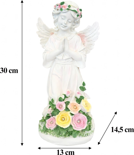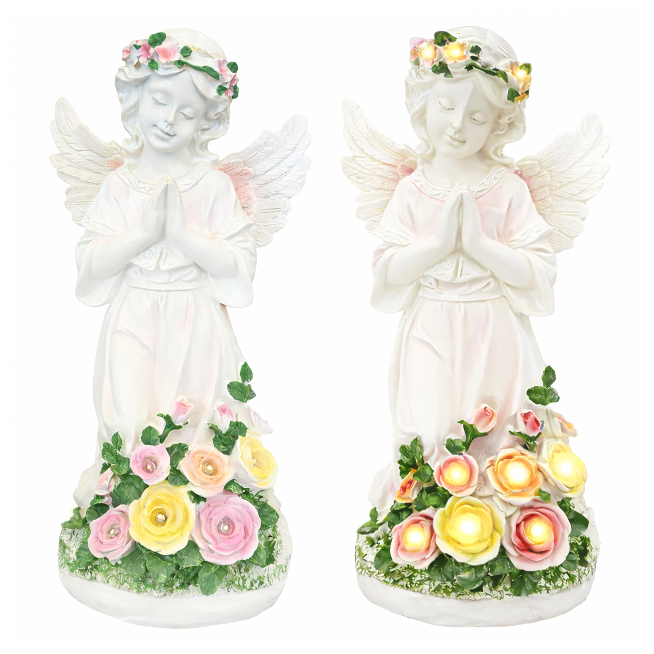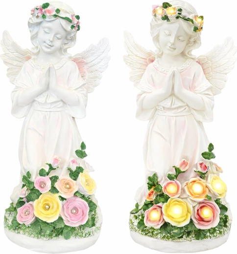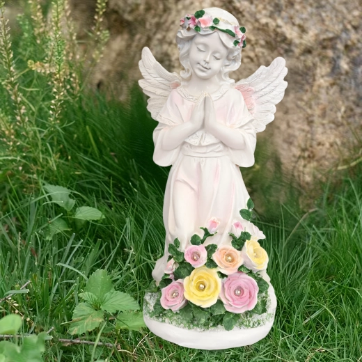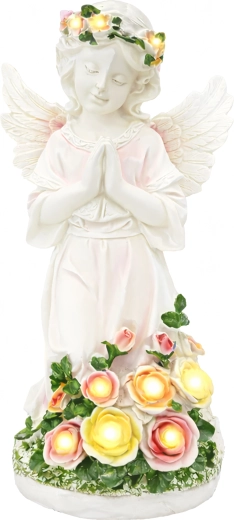 Această statuetă decorativă de înger în rugăciune impresionează prin execuția precisă, expresia fină și aripile bogat modelate. Coroana de flori și soclul decorat cu trandafiri sunt parțial iluminate de LED-urile integrate, care, după lăsarea serii, scaldă decorațiunea într-o lumină caldă. Ideală ca lumină solară de grădină, decorațiune stilată la intrarea în casă sau pentru un loc de reculegere.
