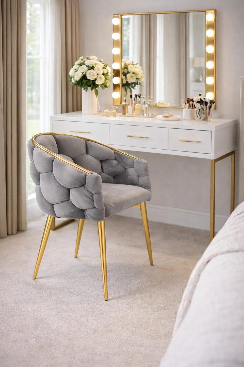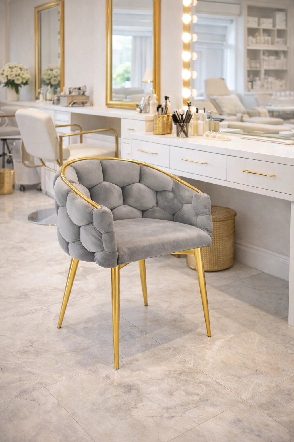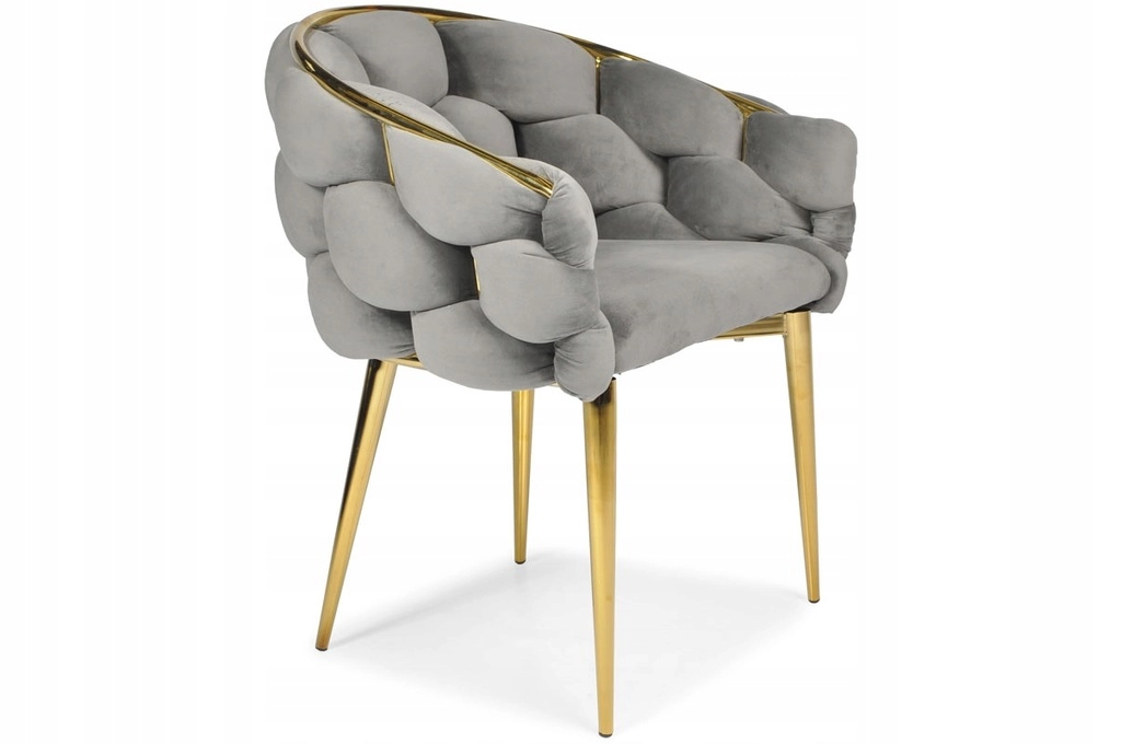 Picioarele metalice suple și conturul auriu oferă un accent luxos interiorului și se asortează perfect cu catifeaua gri.