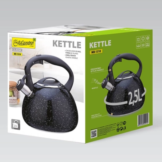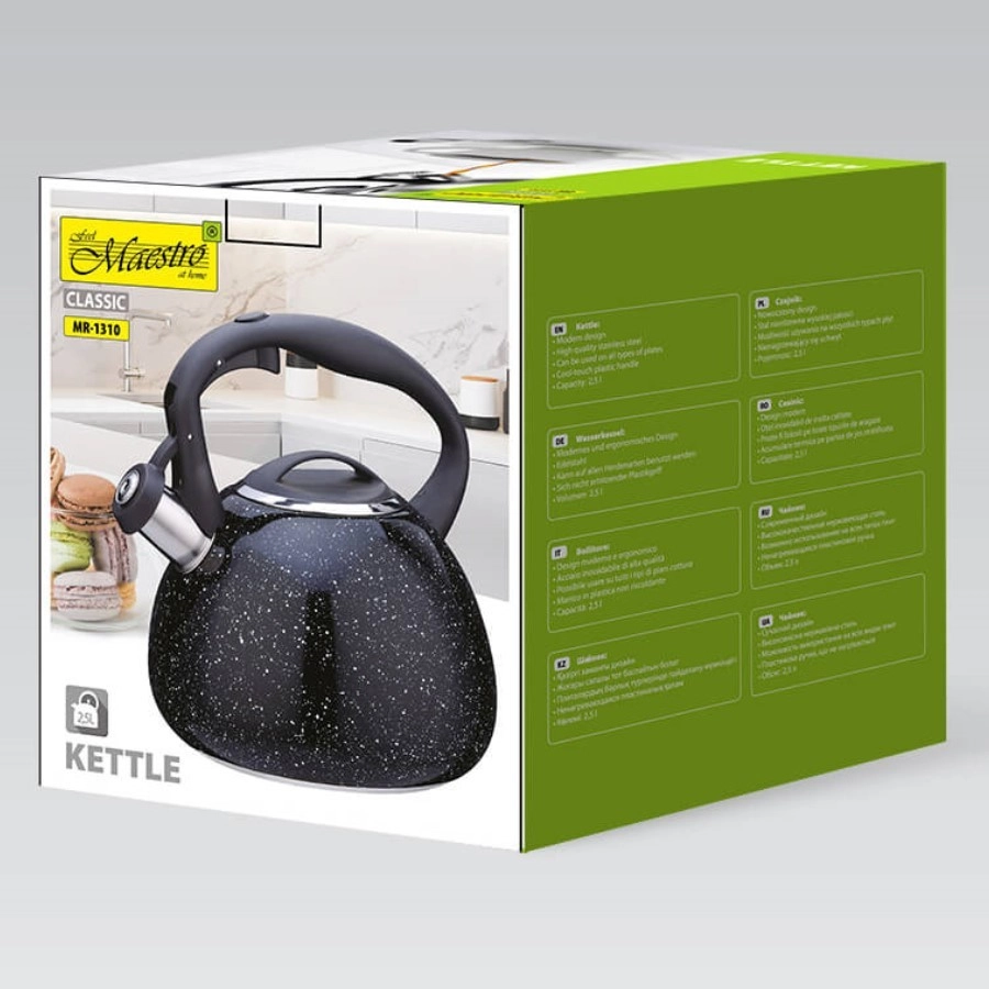 Căutați un ceainic de aragaz fiabil și elegant? Ceainicul din inox MAESTRO 2,5 l îmbină designul modern cu funcții practice. Baza largă oferă stabilitate și transfer eficient de căldură, iar capacul fluierător de pe cioc vă anunță când apa este gata. Datorită capacului detașabil, umplerea și întreținerea sunt extrem de comode.