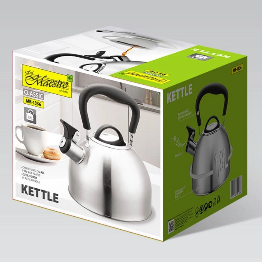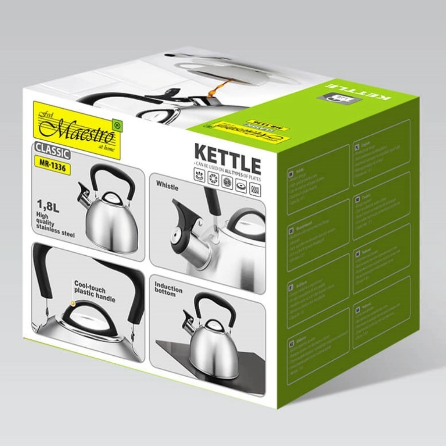 Ceainicul tradițional MAESTRO cu capacitate de 1,8 l este ideal pentru iubitorii de ceai și cafea. Este fabricat din oțel inoxidabil de înaltă calitate pentru durabilitate îndelungată, are mâner ergonomic, rezistent la căldură pentru turnare în siguranță și fluier pentru semnalizarea fierberii. Potrivit pentru toate tipurile de plite, inclusiv cu inducție.