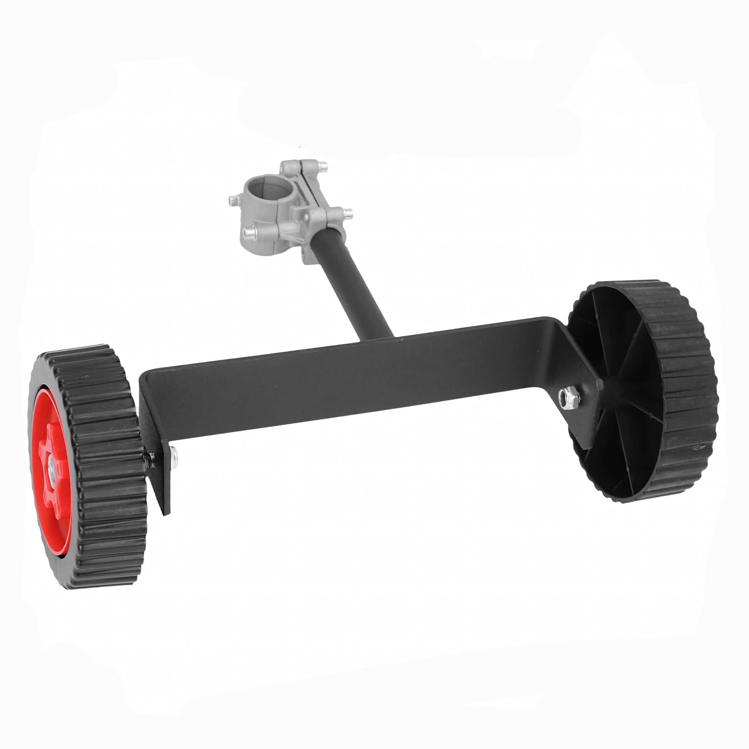 Suportul metalic masiv cu clemă reglabilă pentru țevi cu diametrul de 26–28 mm și perechea de roți rezistente, cu profil accentuat, asigură stabilitate pe diferite suprafețe. Montajul este rapid și nu necesită unelte speciale – este suficient să fixați clema pe țeavă și să setați unghiul ideal.