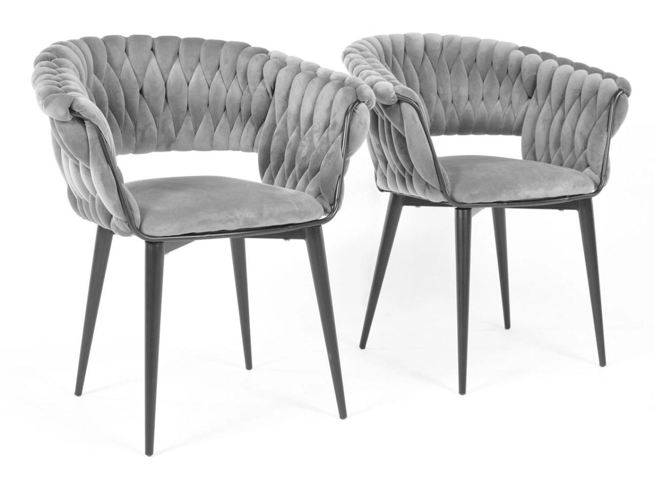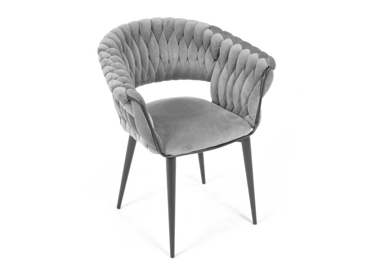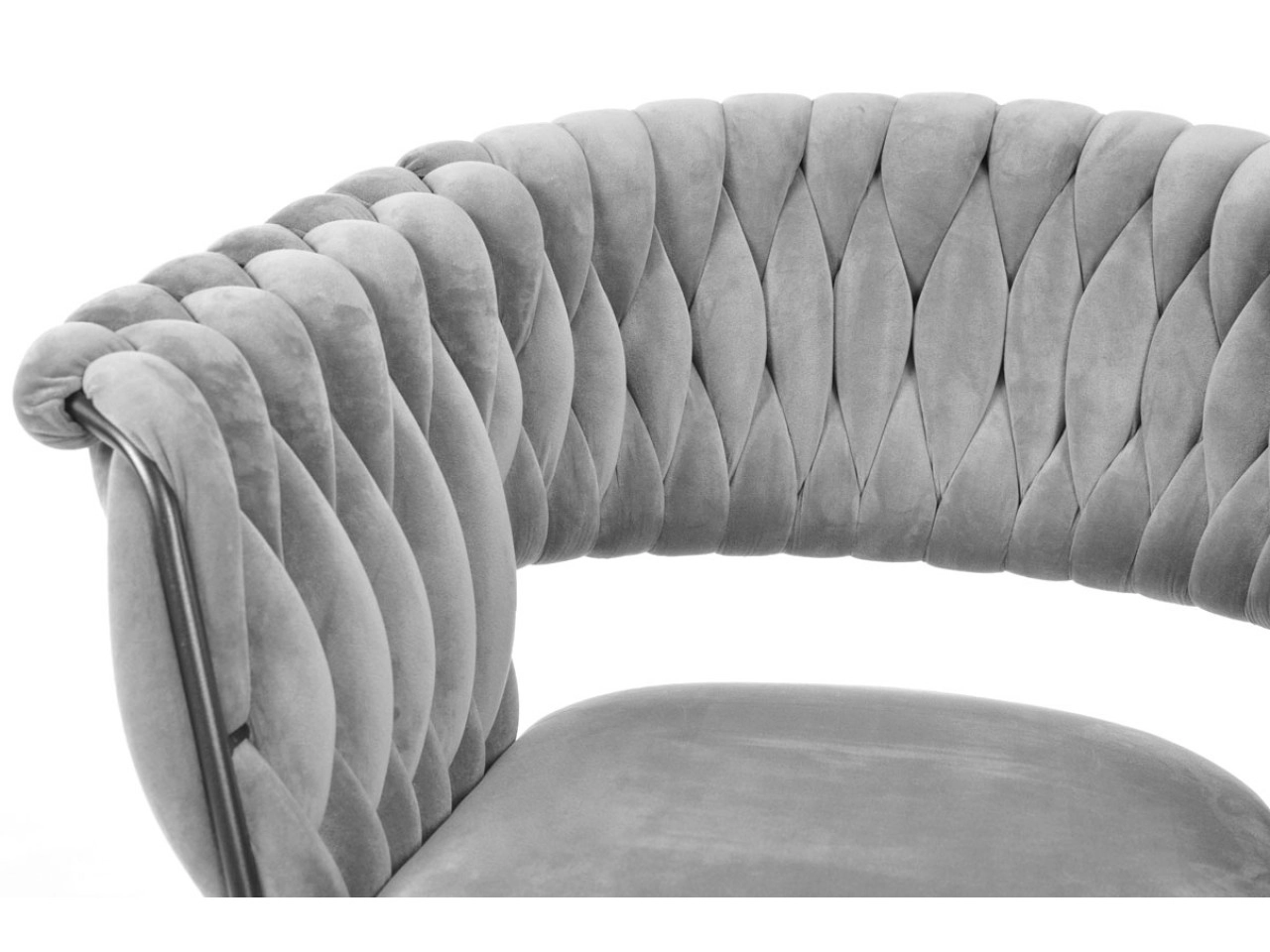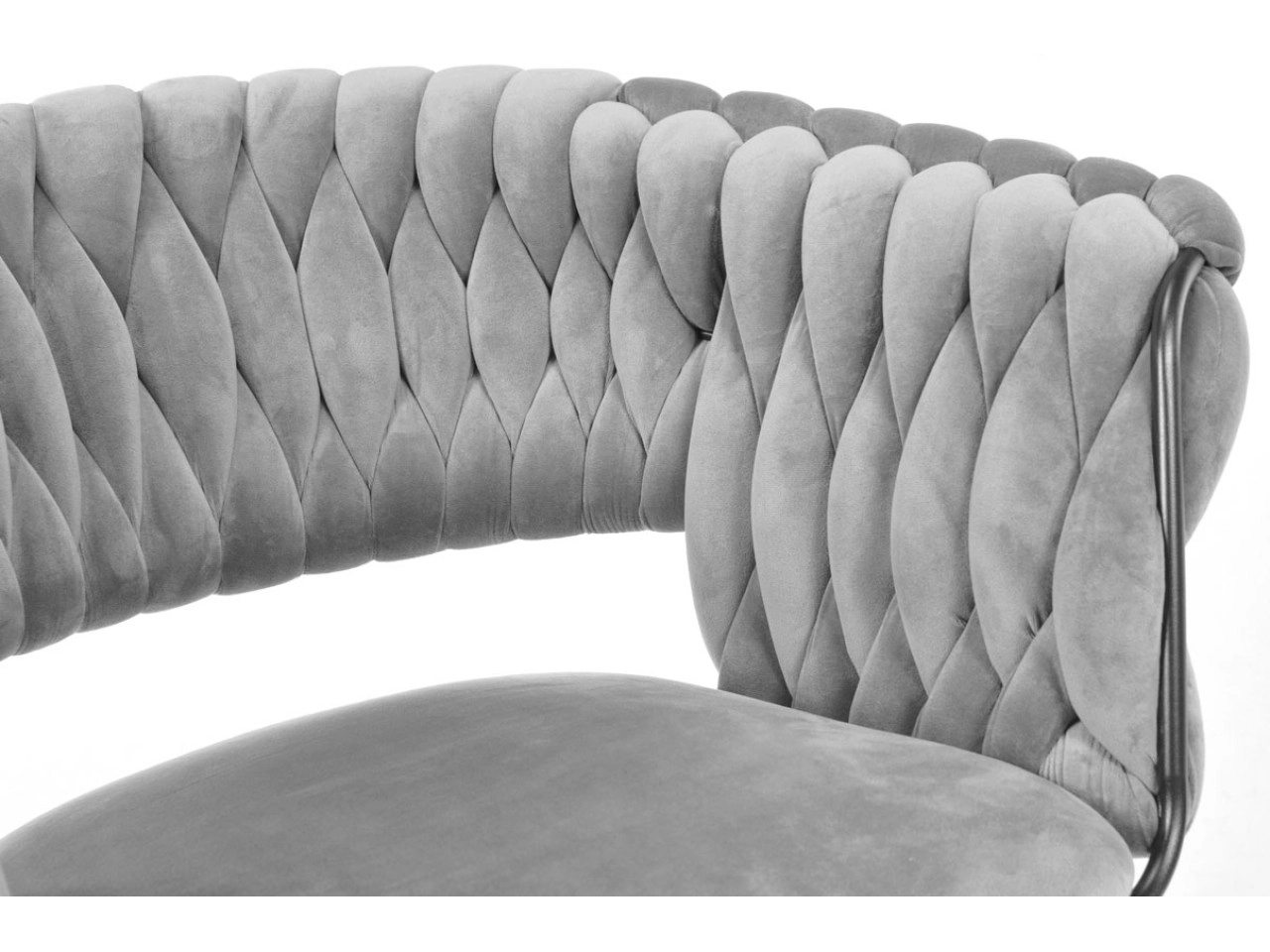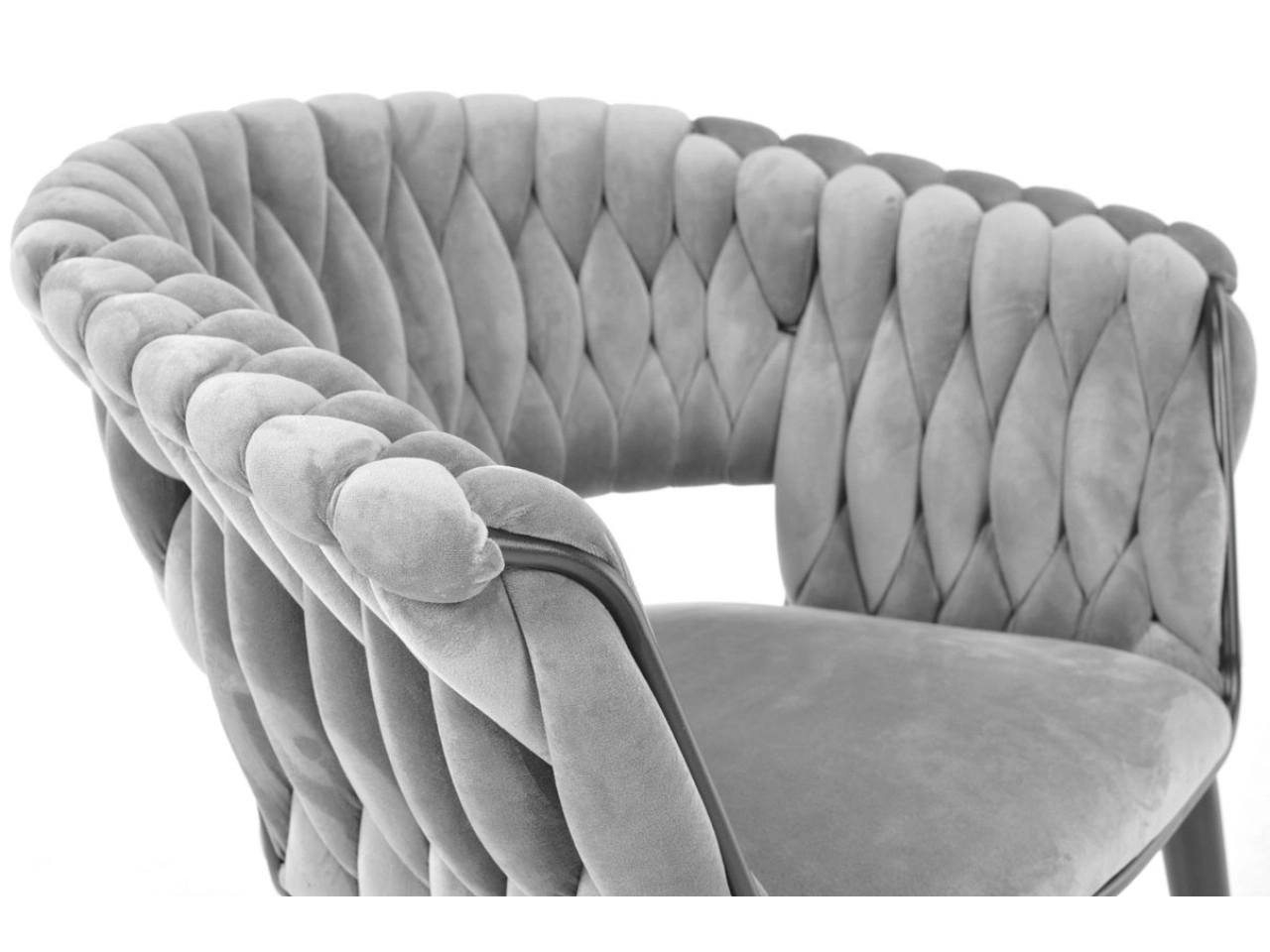 Creați acasă un colț primitor, cu o notă de lux. Catifeaua gri cu luciu discret are un aspect premium, reflectă plăcut lumina și, în combinație cu picioarele negre, formează un contrast modern, atemporal. Caracteristica tapițeriei împletite a spătarului oferă fotoliului un accent de design și, totodată, un sprijin confortabil.