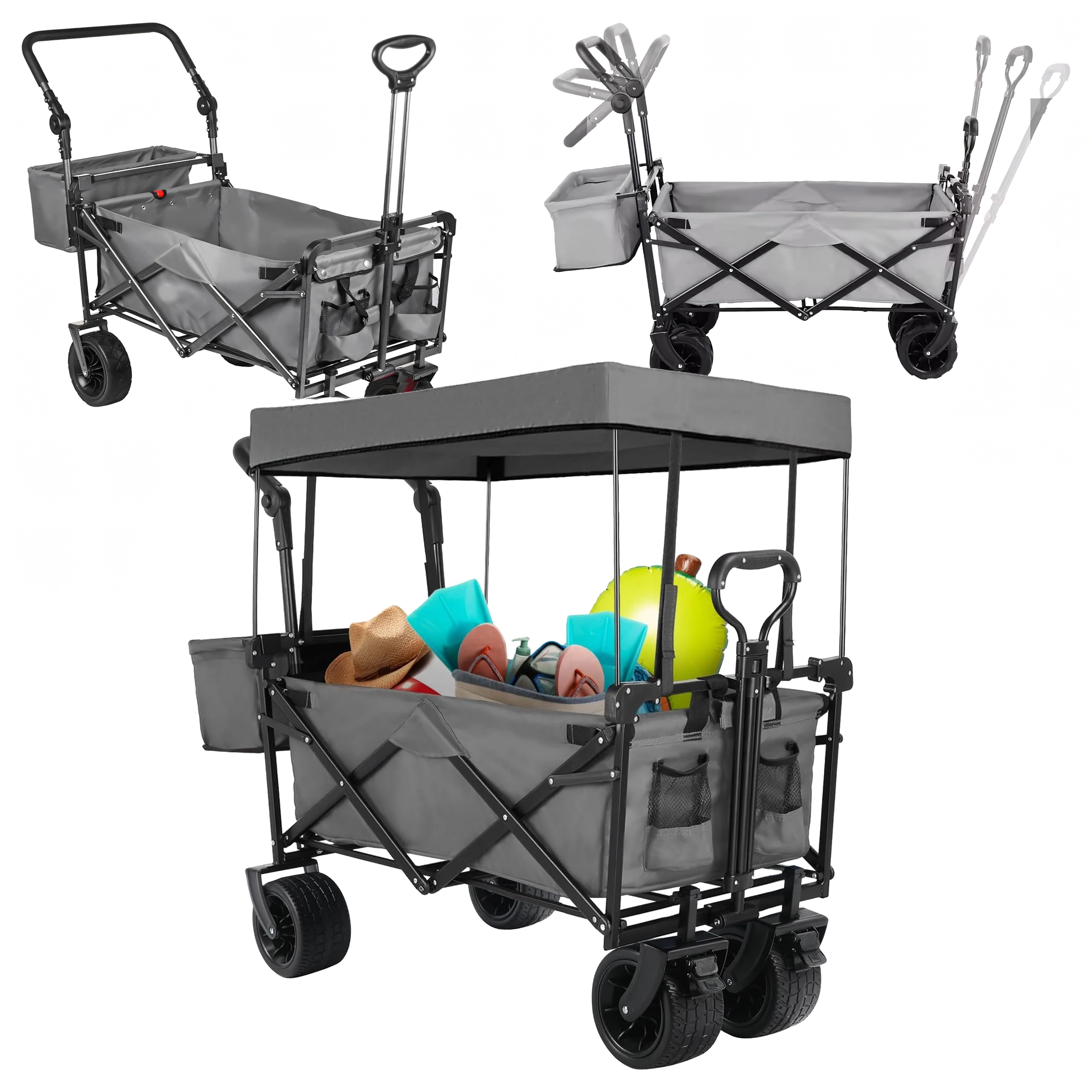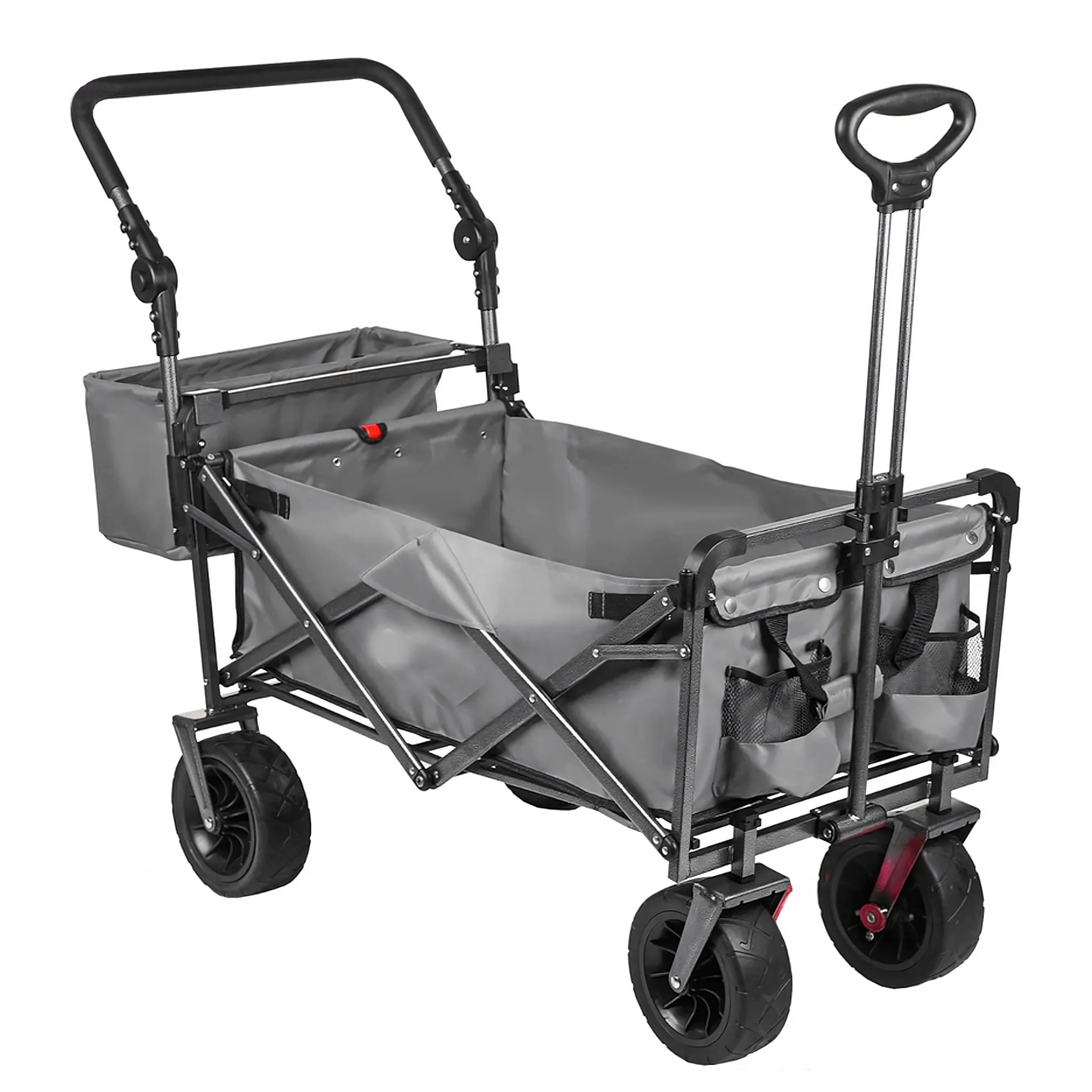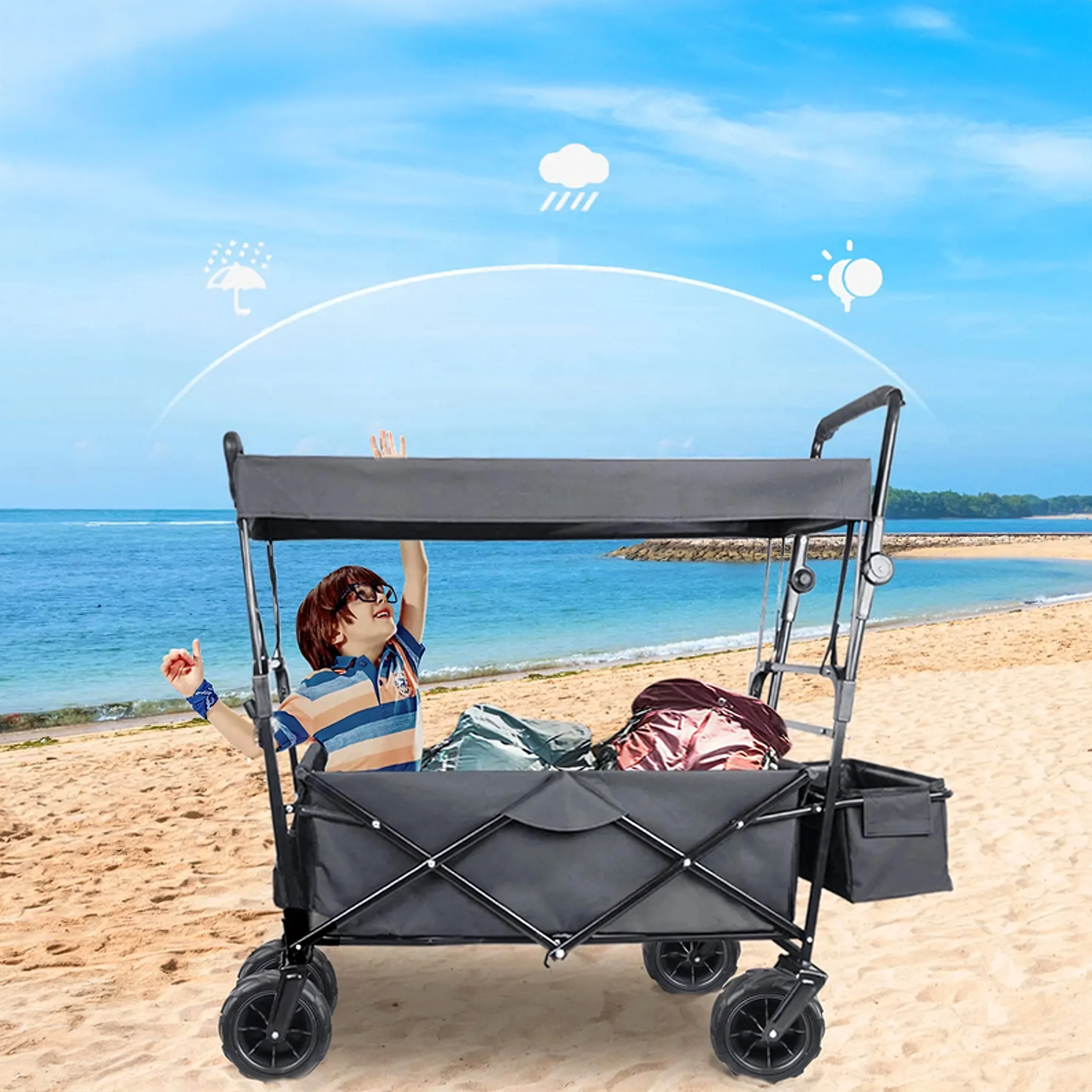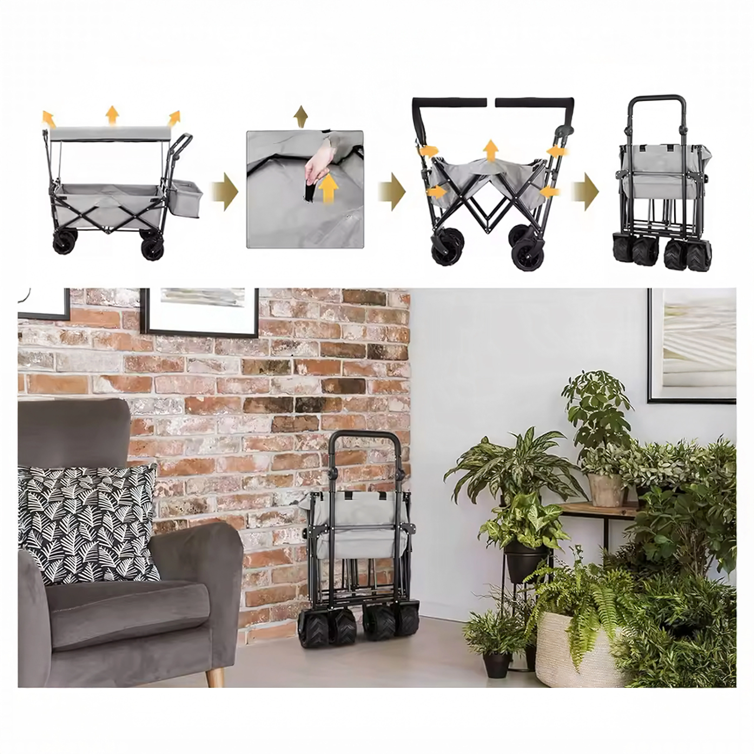 Cărucior pliabil practic pentru grădină, plajă și pescuit, cu cadru rezistent din oțel, benă spațioasă și roți mari XL pentru teren variat. Oferă copertină de soare pentru protecția încărcăturii sau a copiilor, mâner telescopic pentru tracțiune ușoară și pliere rapidă la dimensiuni compacte pentru depozitare economică.