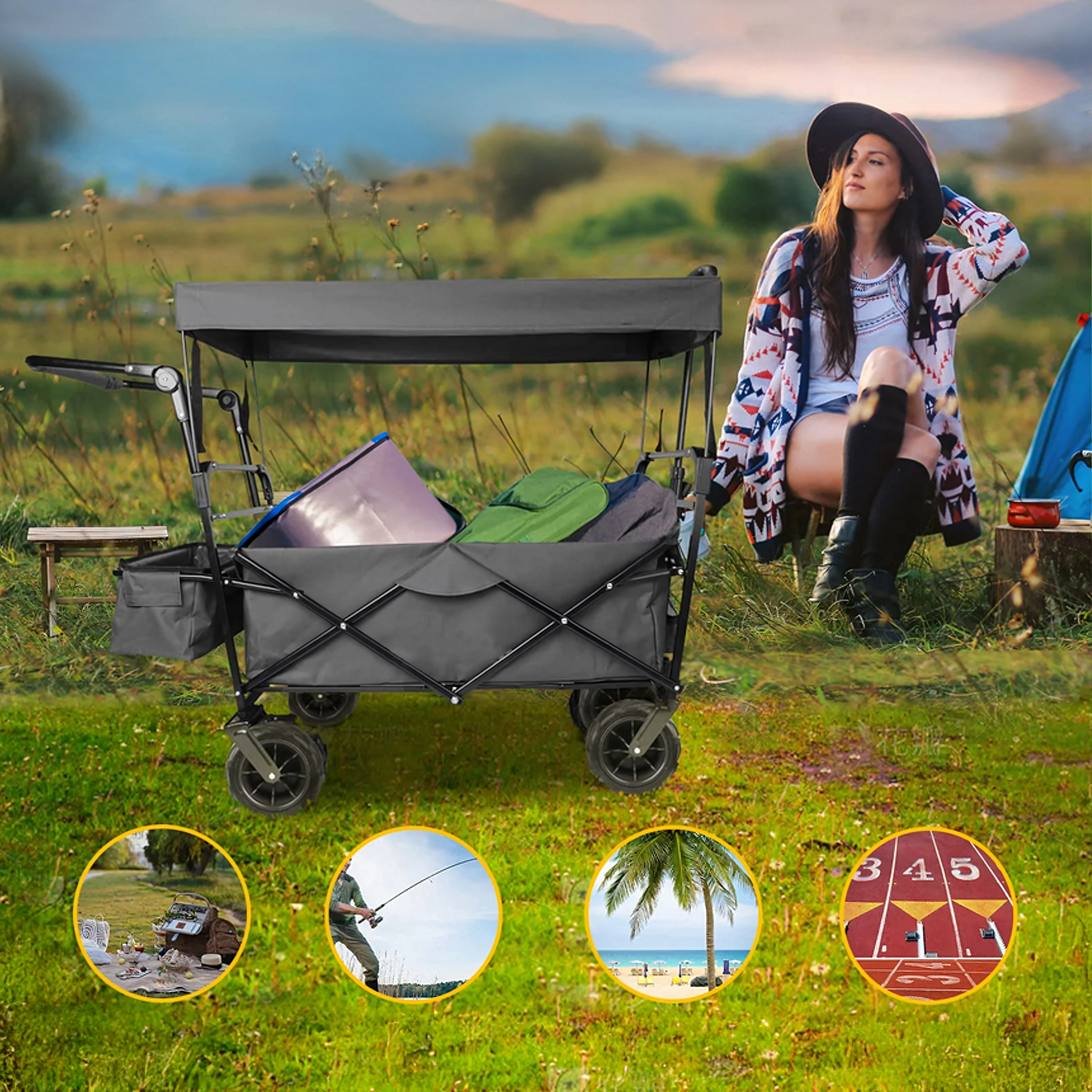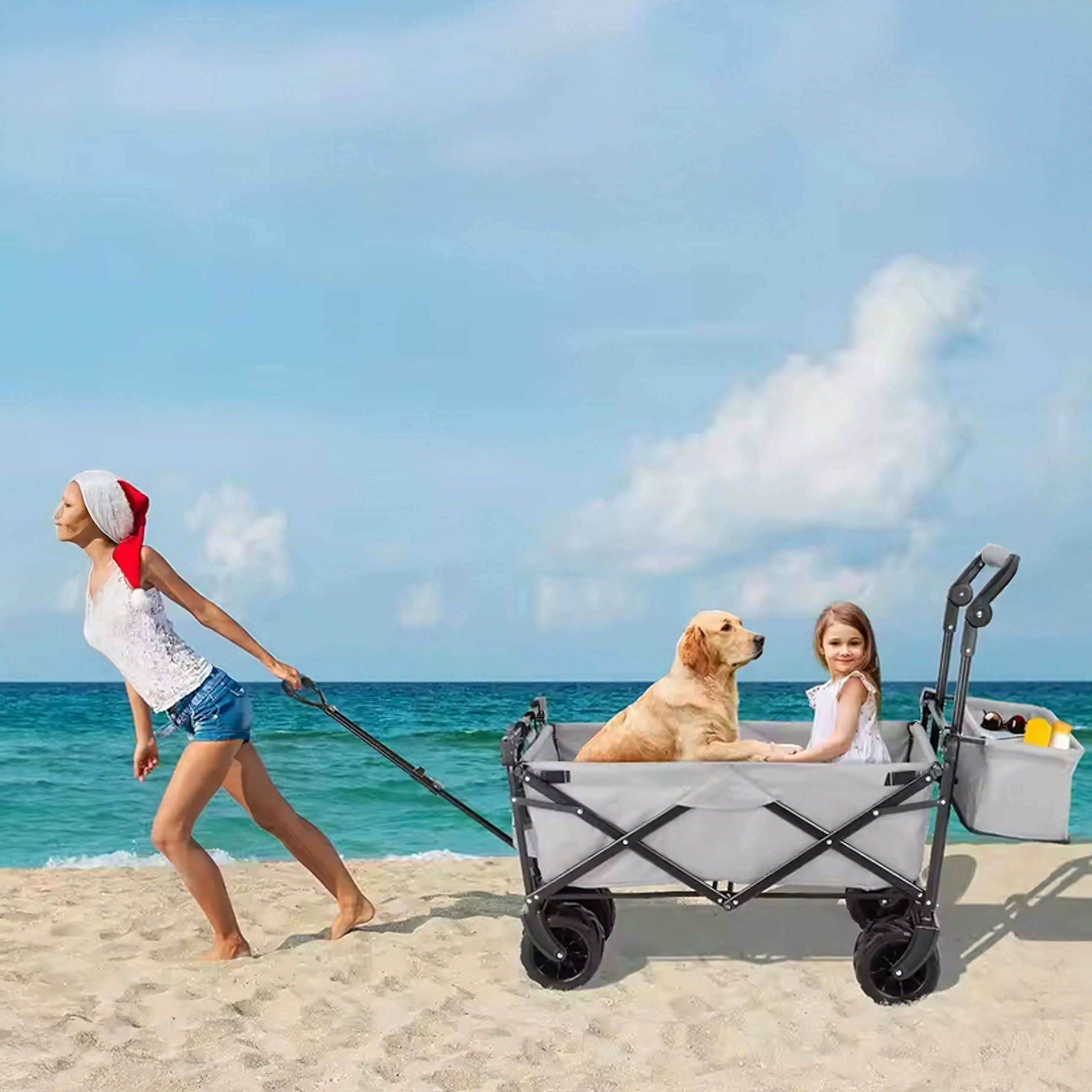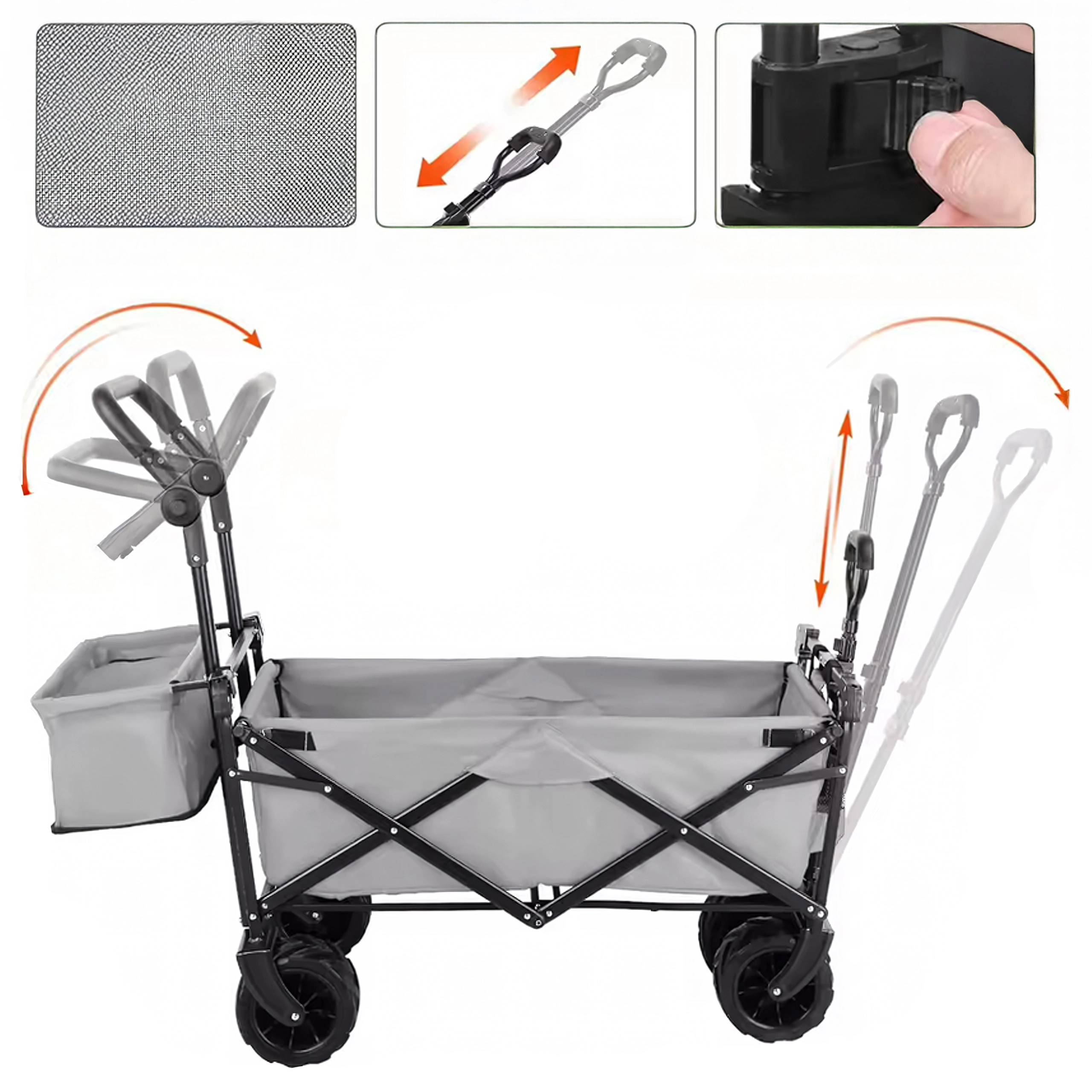 Cărucior pliabil practic pentru grădină, plajă și pescuit, cu cadru rezistent din oțel, benă spațioasă și roți mari XL pentru teren variat. Oferă copertină de soare pentru protecția încărcăturii sau a copiilor, mâner telescopic pentru tracțiune ușoară și pliere rapidă la dimensiuni compacte pentru depozitare economică.