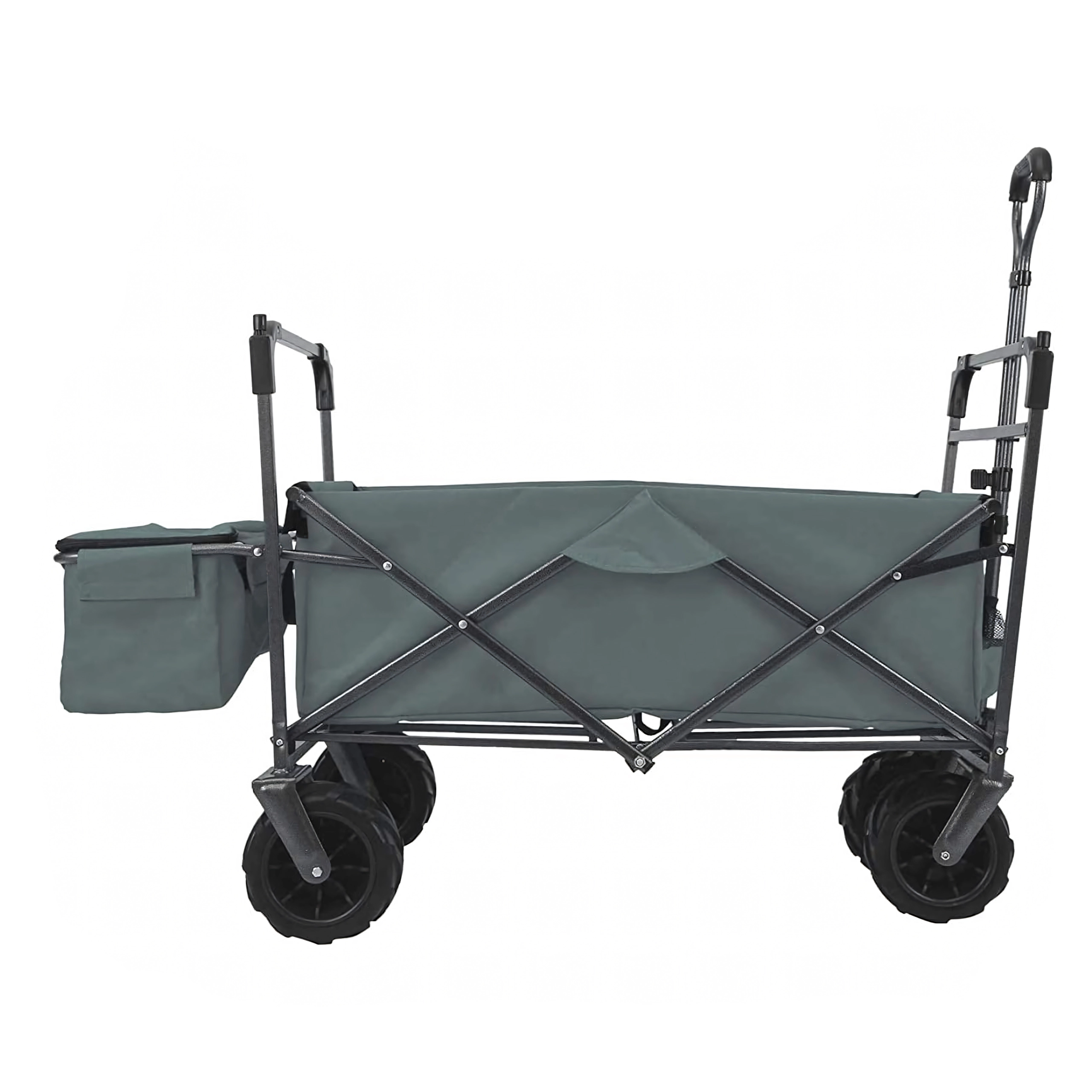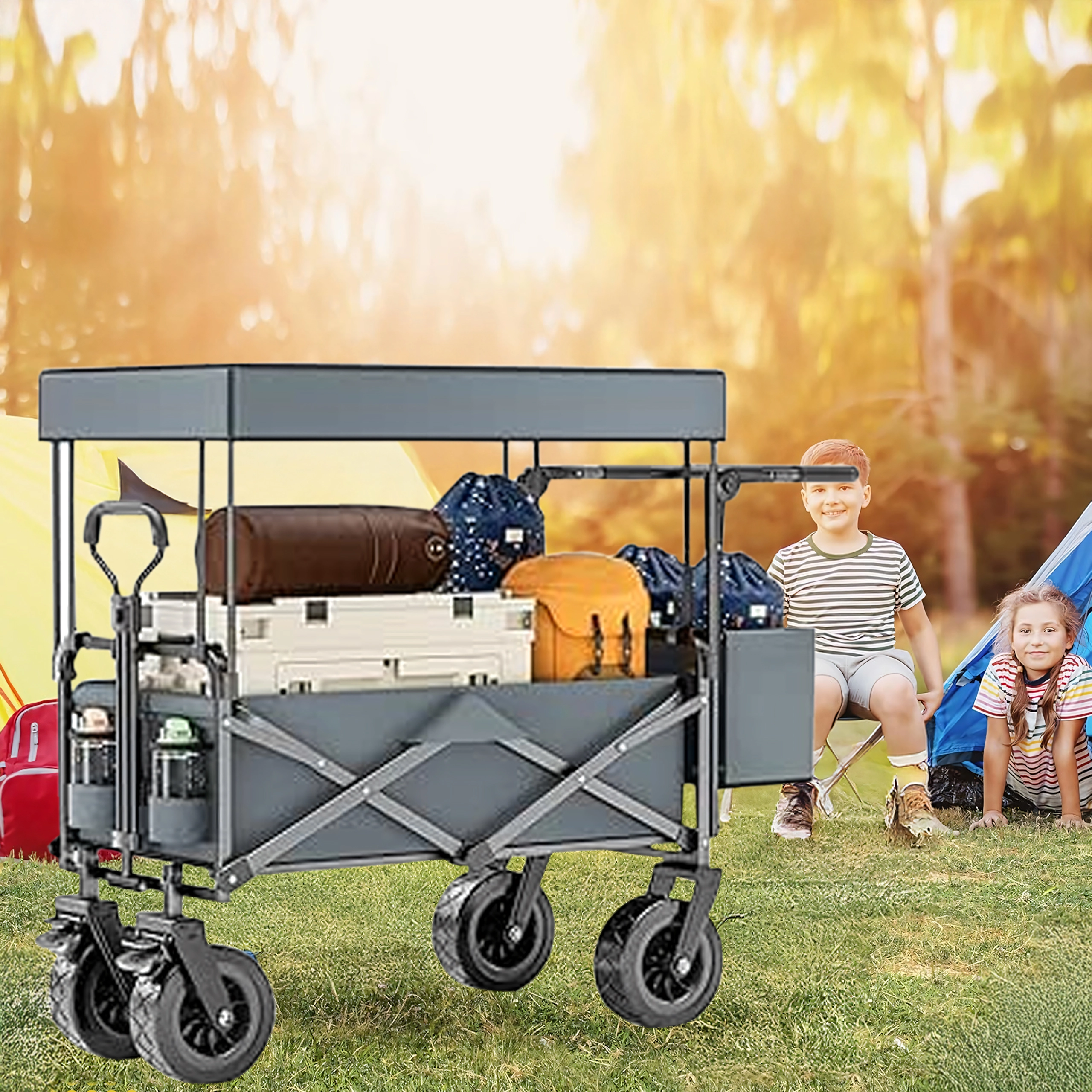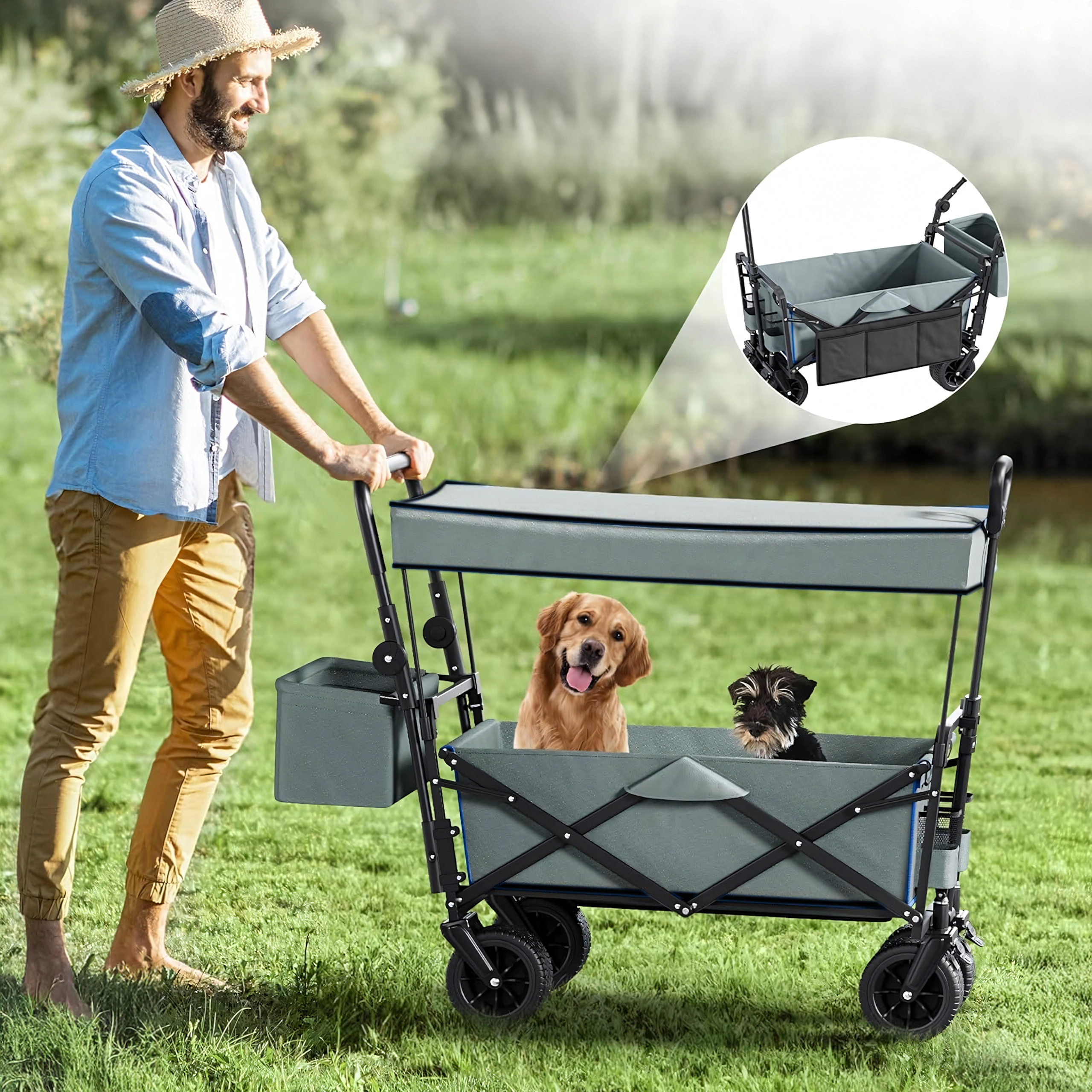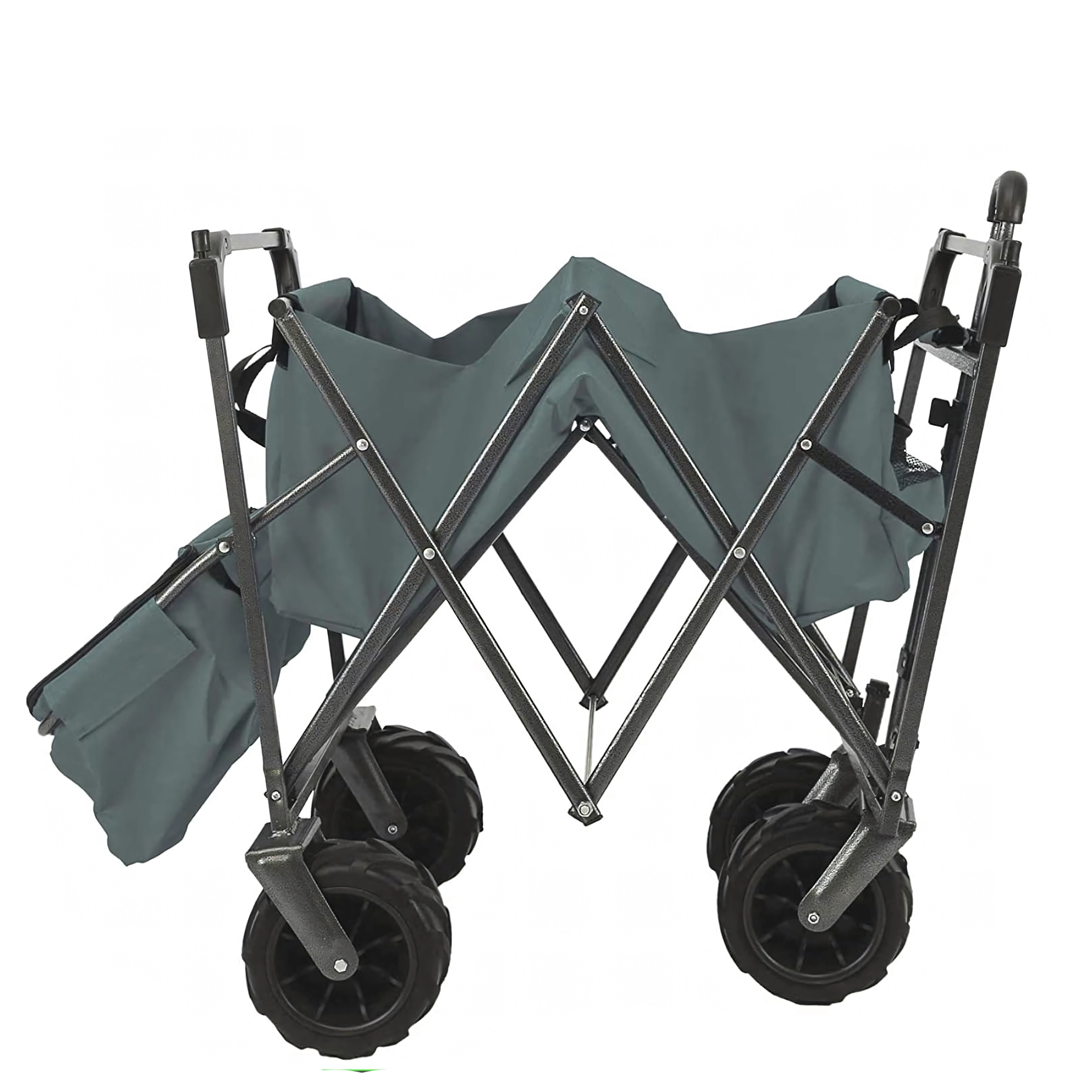 Cărucior pliabil practic pentru grădină, plajă și pescuit, cu cadru rezistent din oțel, benă spațioasă și roți mari XL pentru teren variat. Oferă copertină de soare pentru protecția încărcăturii sau a copiilor, mâner telescopic pentru tracțiune ușoară și pliere rapidă la dimensiuni compacte pentru depozitare economică.