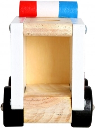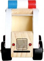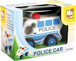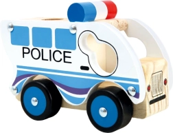 Această mașinuță de poliție din lemn, în alb și albastru, este primul vehicul ideal pentru copiii de la 1 an. Datorită execuției solide din placaj gros și lemn masiv, rezistă jocului zilnic, în timp ce roțile pivotante asigură o rulare lină pe covor și pe podea.
