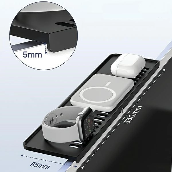- Gestionare inteligentă a cablurilor – decupaje posterioare pentru trecerea elegantă a cablurilor de încărcare către telefon, căști sau ceasuri.