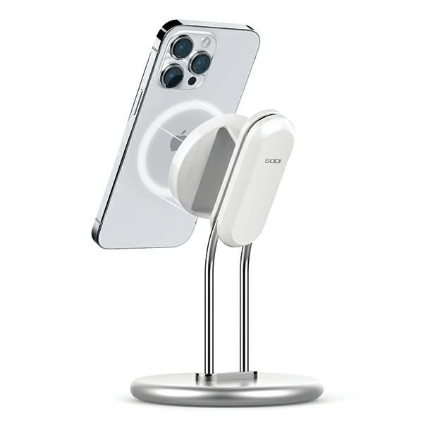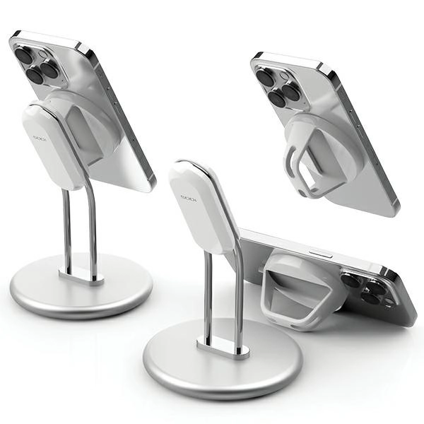 Elegantul suport magnetic din aliaj de aluminiu, cu suport detașabil, oferă stabilitate fermă, compatibilitate cu MagSafe și vizionare hands‑free comodă pentru videoclipuri, jocuri și apeluri video. Pernele moi din silicon protejează masa, unghiul reglabil asigură unghiuri excelente de vizualizare, iar plăcuța magnetică interschimbabilă permite inserarea încărcătorului wireless MagSafe original (nu este inclus în pachet).
