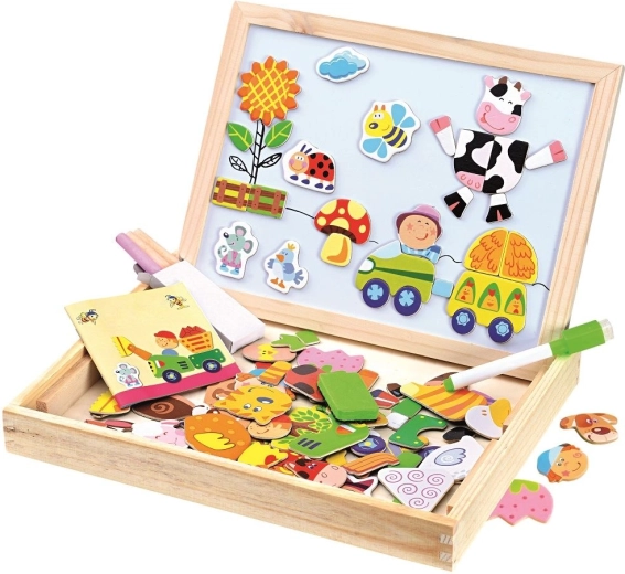 Tablă magnetică interactivă și educativă pentru copii, cu un design atractiv al unei ferme. Această tablă este un partener excelent în activitățile creative ale copiilor, fiind versatilă și multifuncțională.