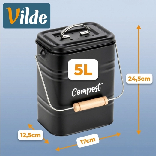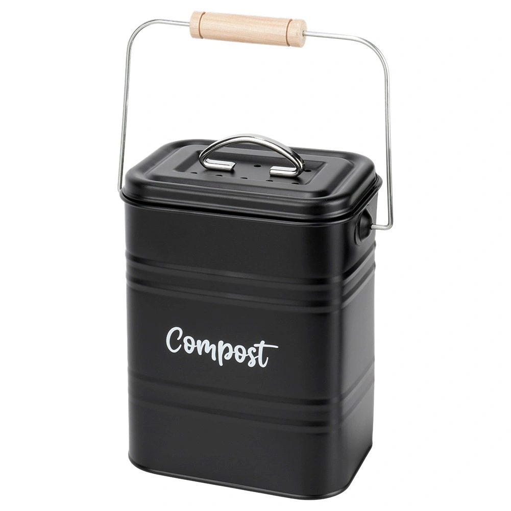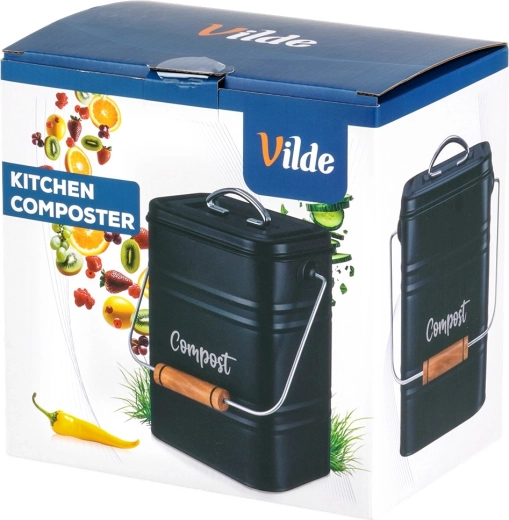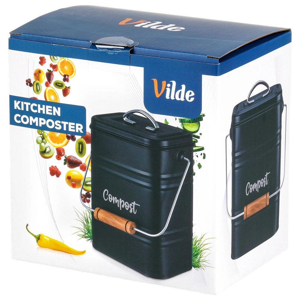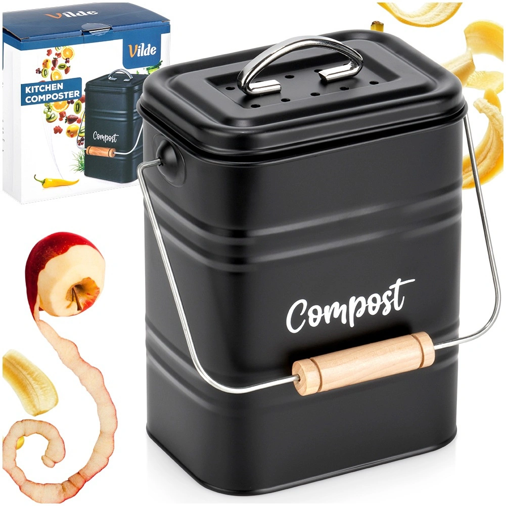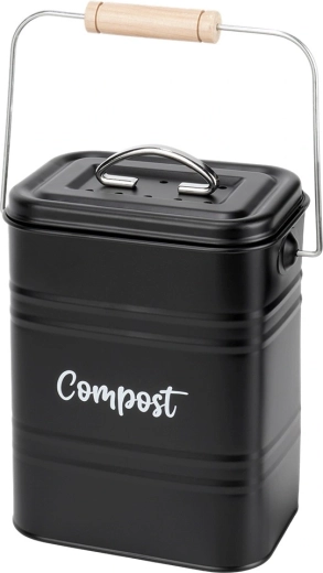 Compostor de bucătărie stilat, cu volum de 5 l, din metal rezistent, de culoare neagră, ideal pentru sortarea zilnică a bio-deșeurilor direct pe blatul de lucru. Datorită filtrului activ de carbon din capac, absoarbe eficient mirosurile, în timp ce dimensiunile compacte și mânerul practic cu prindere din lemn facilitează transportul. Curățare ușoară și design atemporal cu inscripția „Compost” care se potrivește perfect în orice bucătărie.