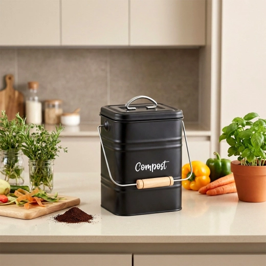 Compostorul de bucătărie metalic, cu volum de 5 litri, este o soluție practică pentru colectarea zilnică a cojilor, zațului de cafea și a altor resturi organice. Capacul cu filtru de carbon înlocuibil asigură neutralizarea eficientă a mirosurilor, astfel încât poți folosi recipientul fără griji și în interior.