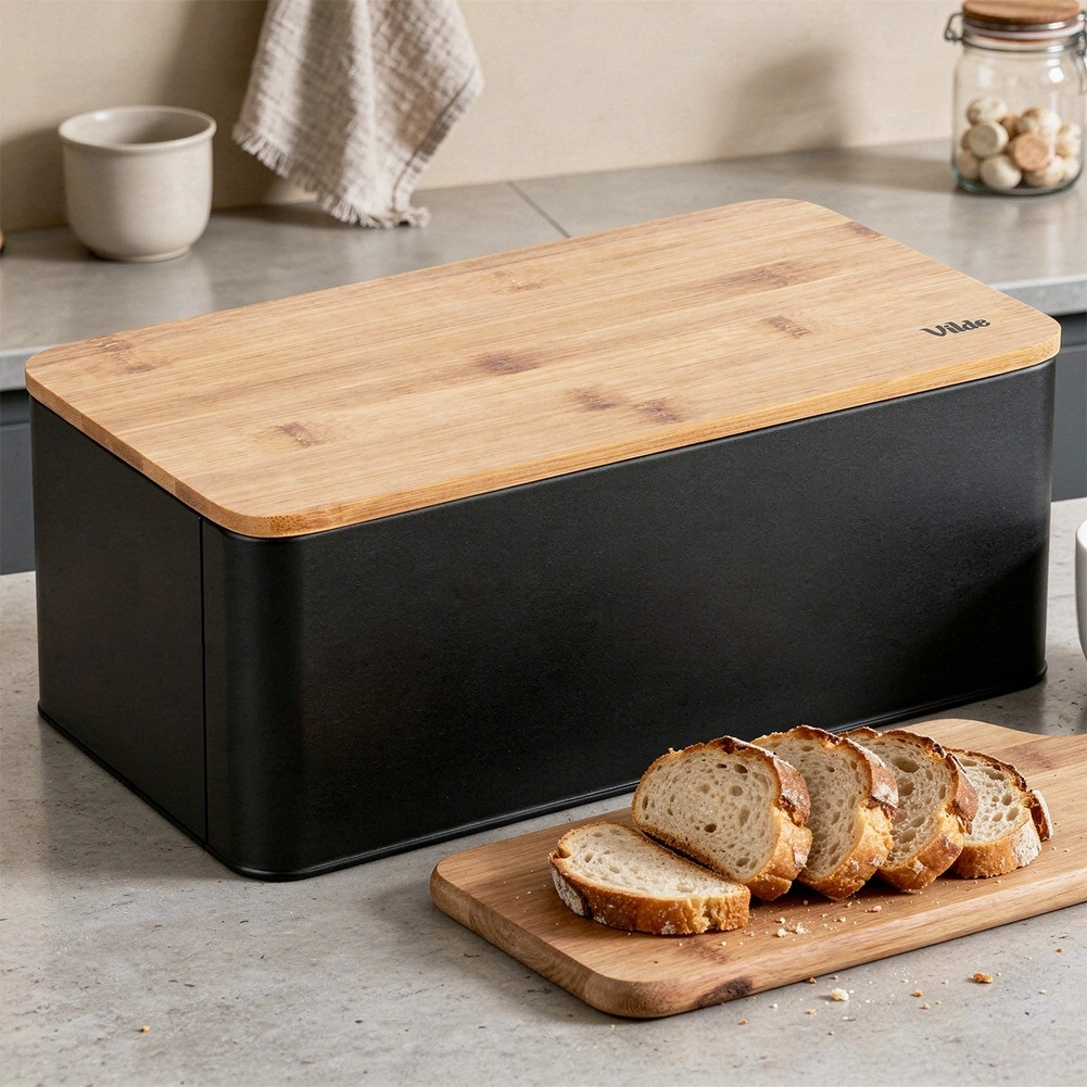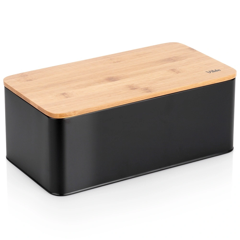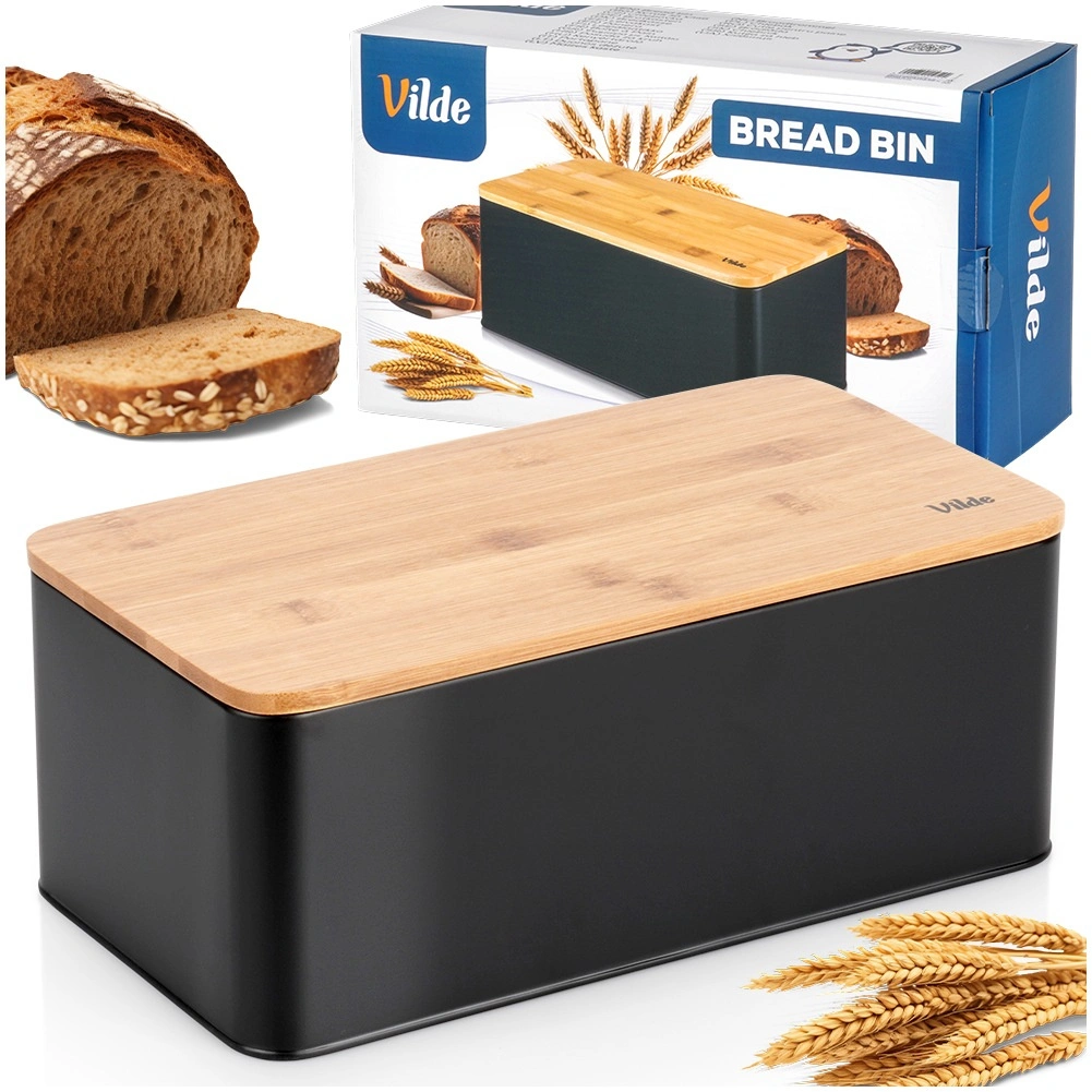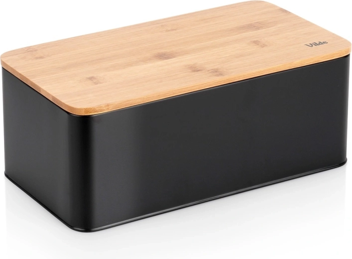Cutia de pâine spațioasă, în finisaj modern negru, îmbină corpul metalic rezistent cu capacul din bambus natural, care servește și ca tocător. Dimensiunile de 33 × 18 × 13 cm oferă suficient spațiu pentru pâine, baghete și chifle, în timp ce construcția solidă protejează produsele de panificație împotriva deformării.