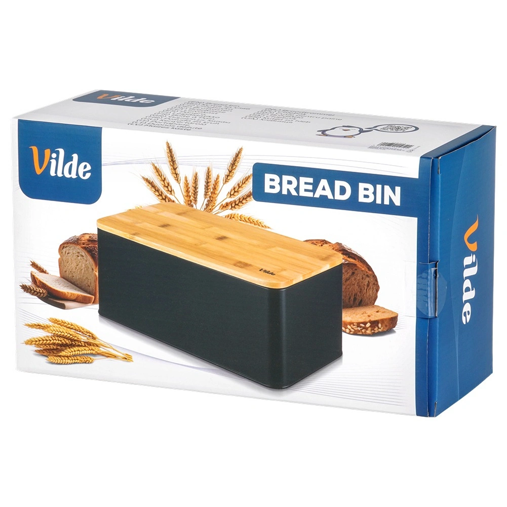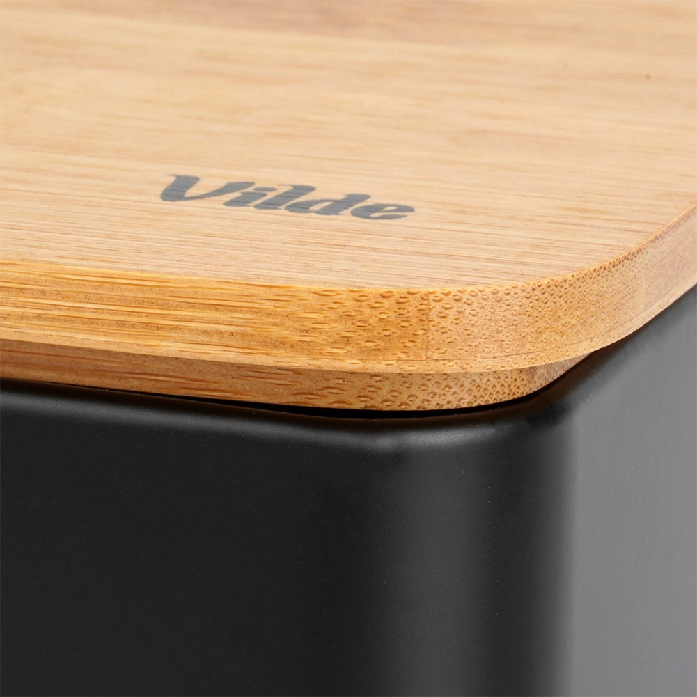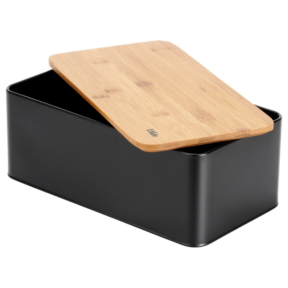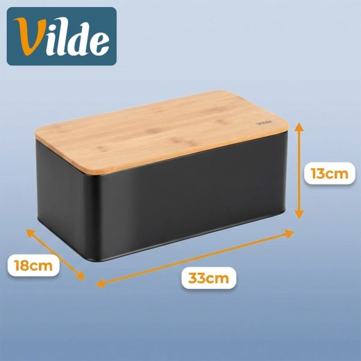 Cutia de pâine spațioasă, în finisaj modern negru, îmbină corpul metalic rezistent cu capacul din bambus natural, care servește și ca tocător. Dimensiunile de 33 × 18 × 13 cm oferă suficient spațiu pentru pâine, baghete și chifle, în timp ce construcția solidă protejează produsele de panificație împotriva deformării.