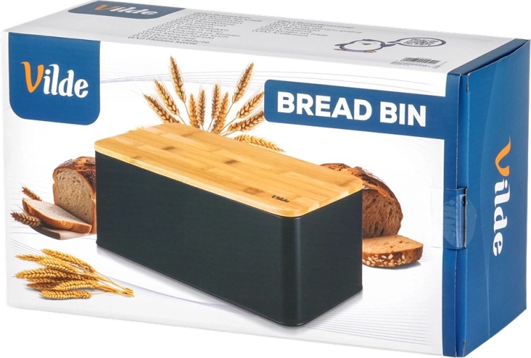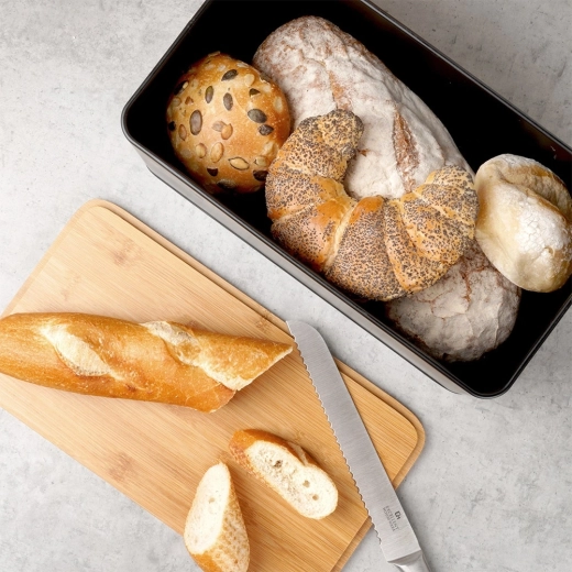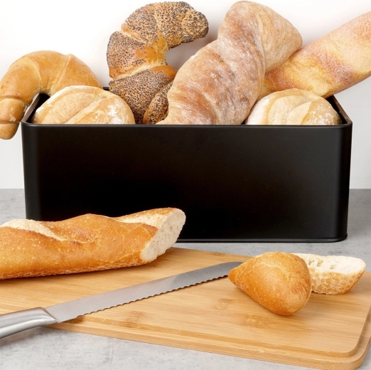 Corpul din metal mat și capacul perfect etanș limitează pătrunderea aerului și previn uscarea produselor de panificație.