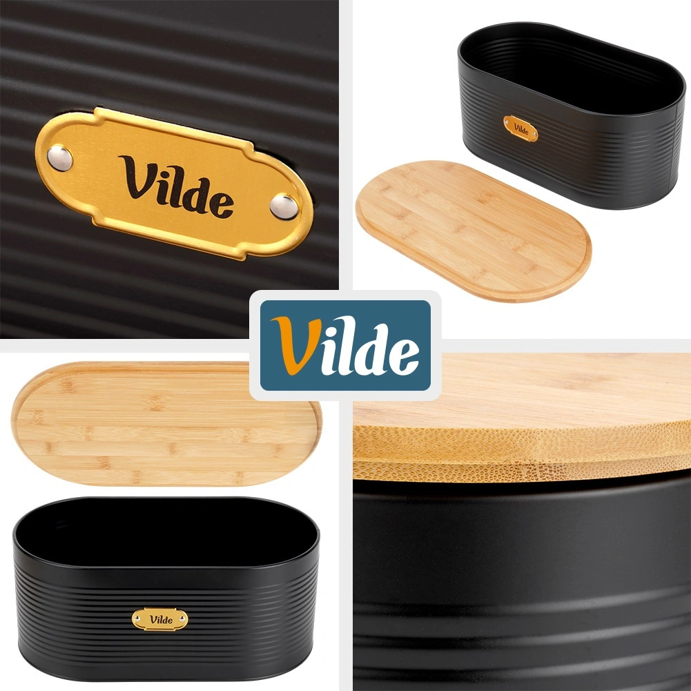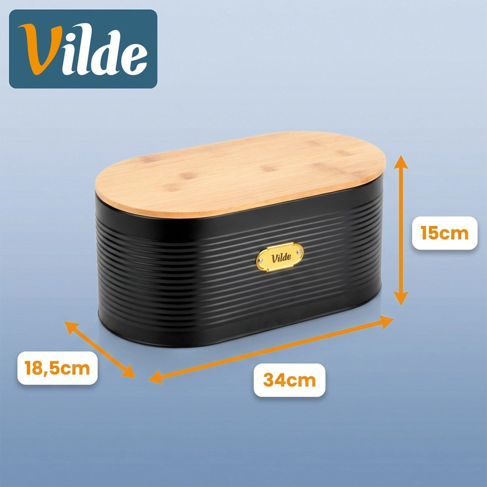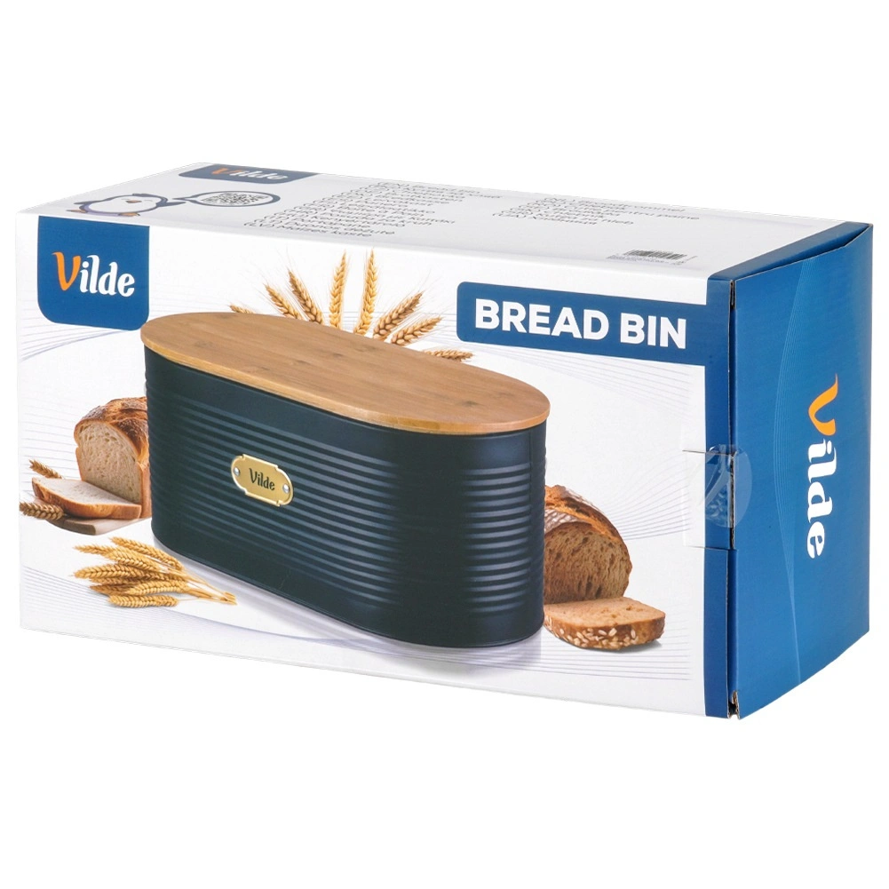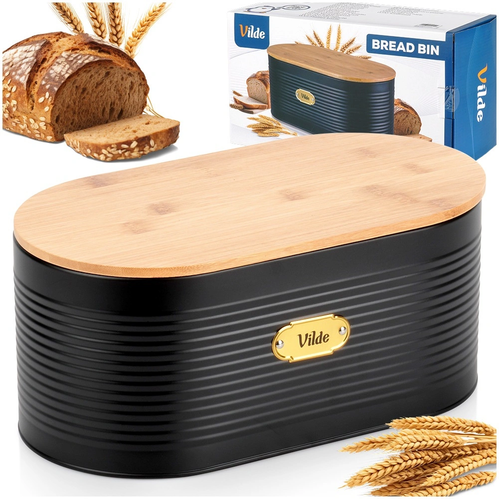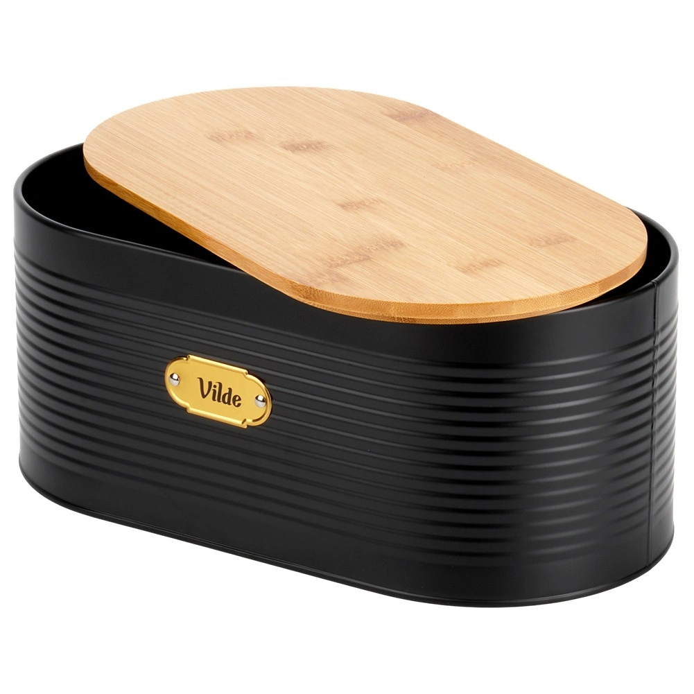Cutia de pâine cu design îmbină metalul lăcuit rezistent cu bambusul natural pentru prospețime de durată a produselor de panificație și ordine pe blatul din bucătărie. Datorită formei ovale și dimensiunilor 34 × 18,5 × 15 cm, este suficient de încăpătoare pentru pâine, cornuri, chifle și alte produse.
