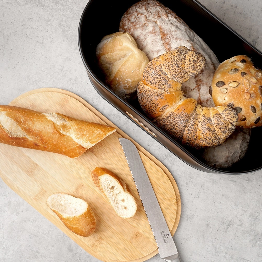 Capacul practic din lemn de bambus servește și ca tocător – este suficient să îl îndepărtați pentru a felia confortabil pâinea și produsele de panificație.