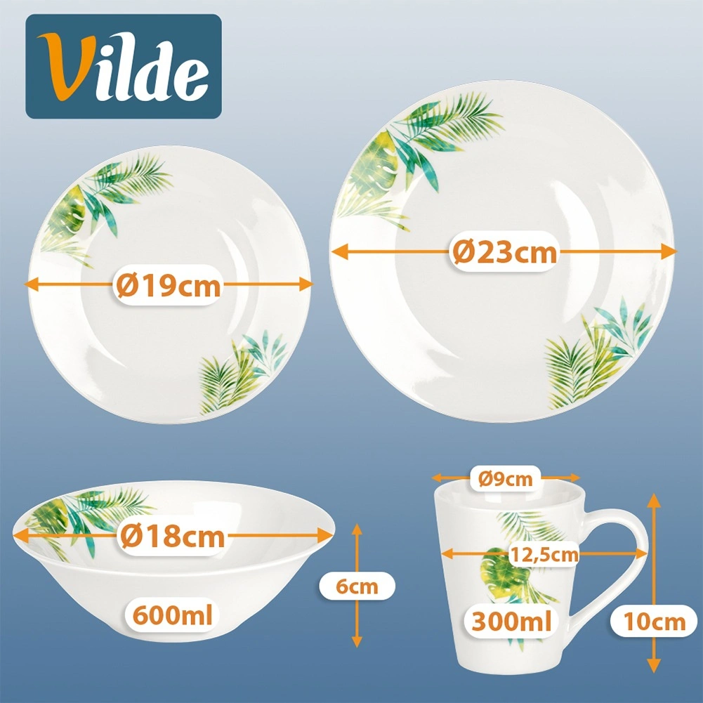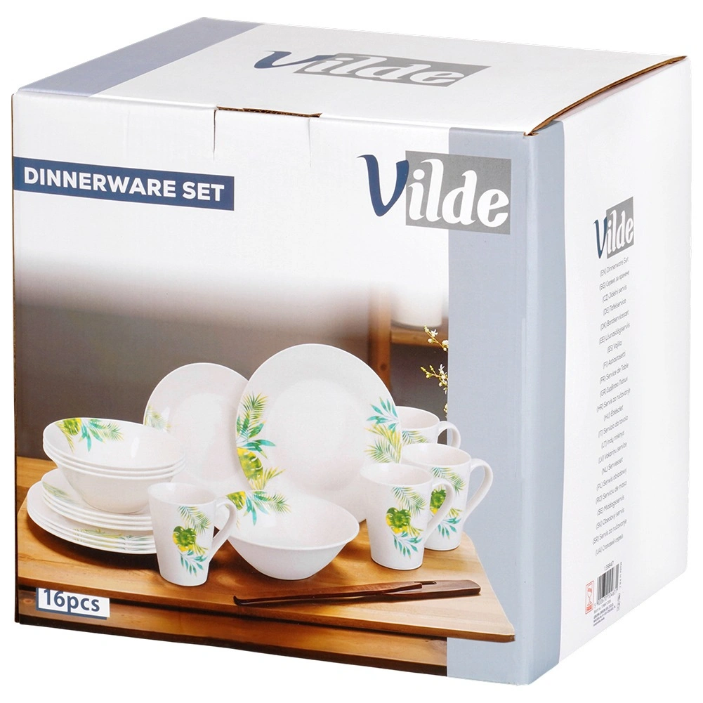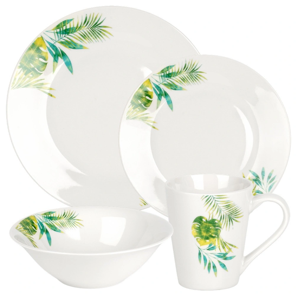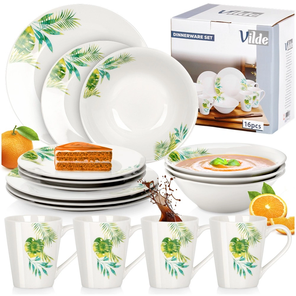 Elegant set de masă din porțelan pentru 4 persoane, cu glazură albă și motiv vegetal tropical. Conține 16 piese: farfurii întinse și de desert, boluri de 600 ml și cănI de 300 ml. Potrivit pentru mașina de spălat vase și cuptorul cu microunde, ideal pentru mesele zilnice și momentele festive. Design atemporal ușor de asortat cu orice dotare a bucătăriei.
