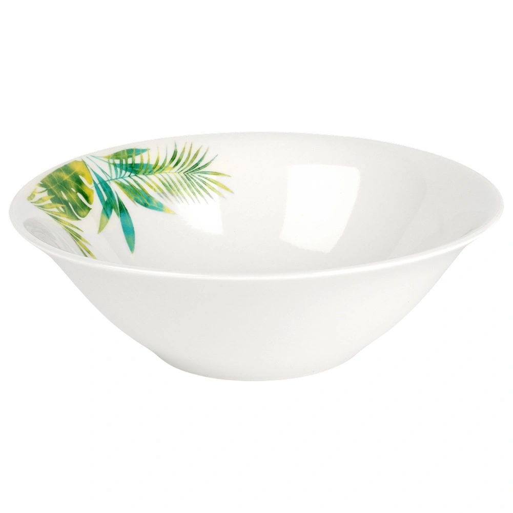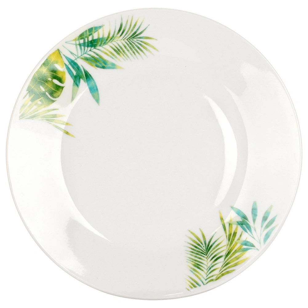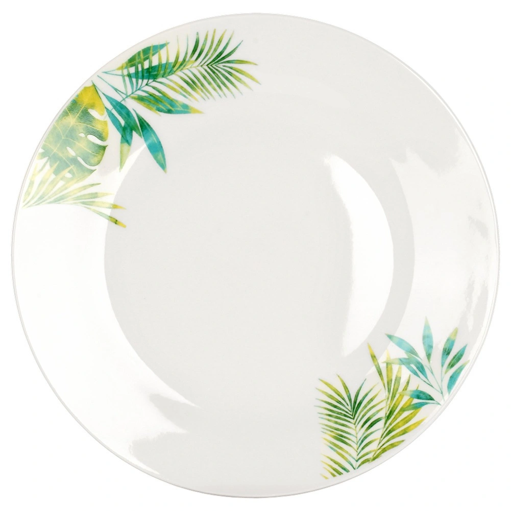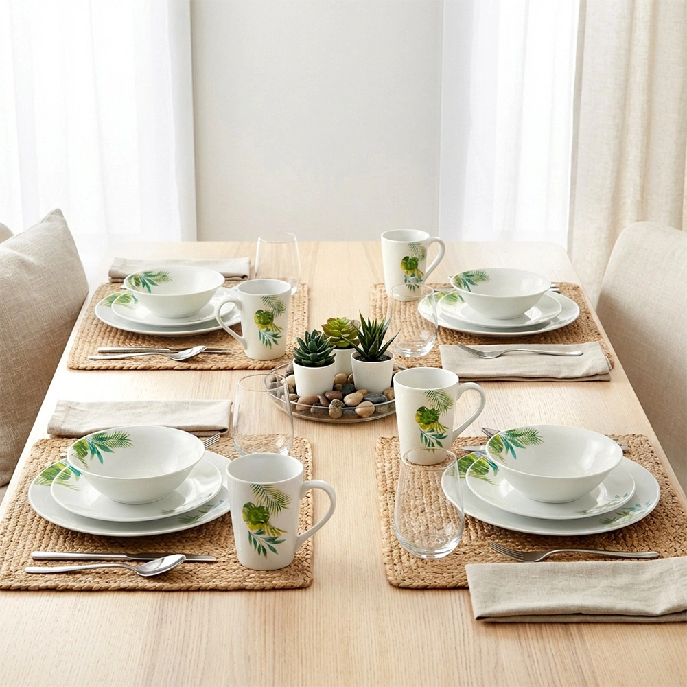 Acest set din porțelan cu 16 piese pentru 4 persoane îmbină execuția de calitate, dimensiunile practice și aspectul botanic modern. Fundalul alb cu frunze tropicale oferă mesei un accent proaspăt, în timp ce glazura rezistentă asigură întreținere ușoară și durată lungă de viață.