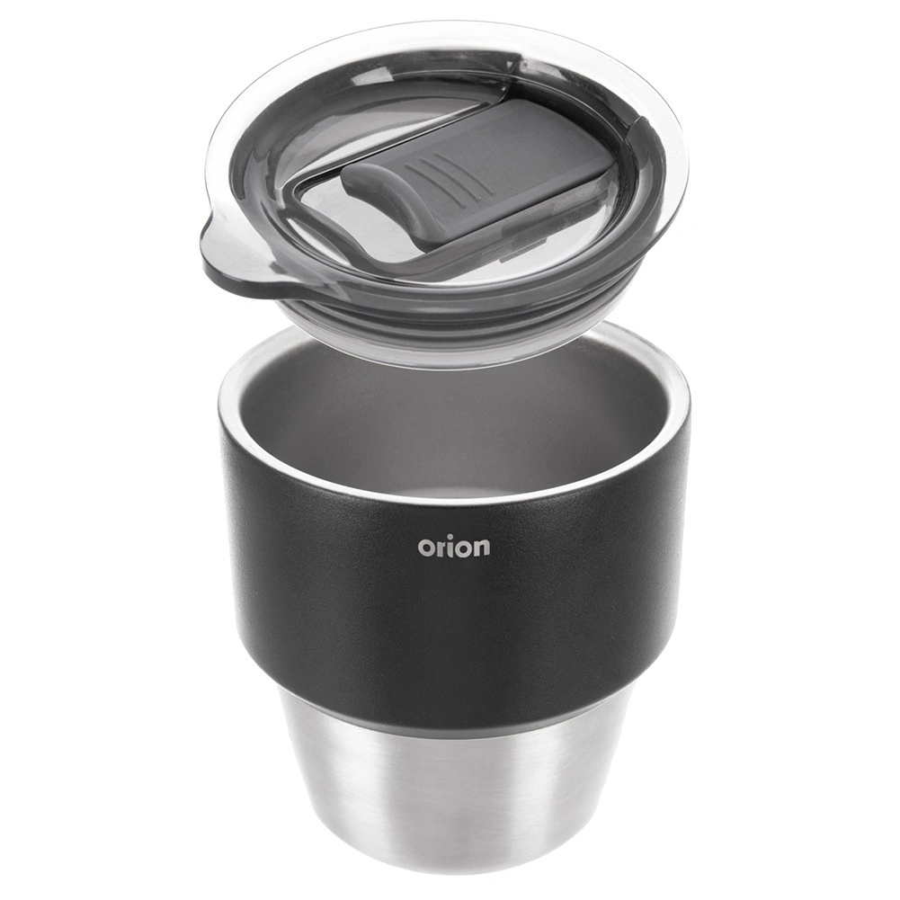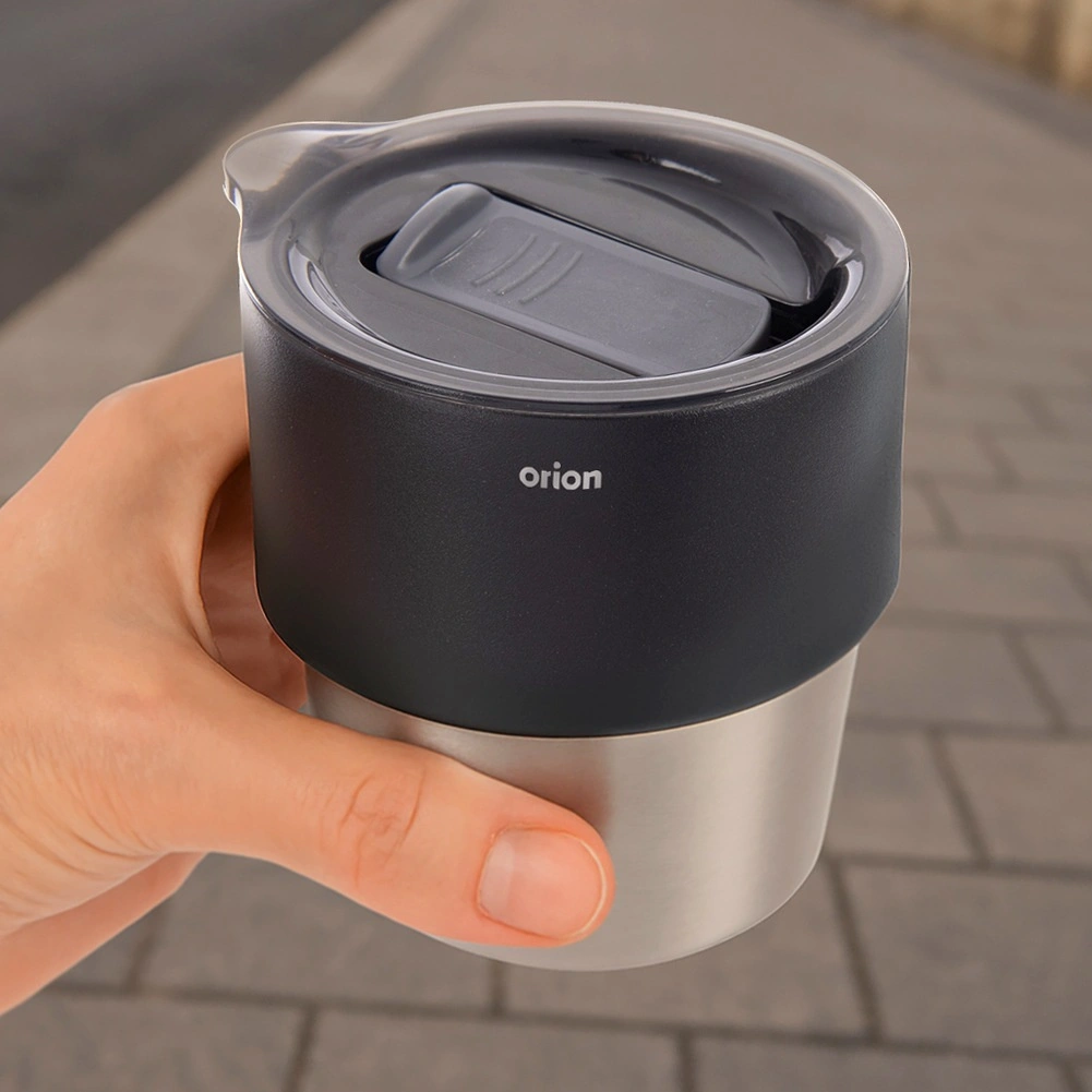 Partea interioară este realizată din oțel inoxidabil de calitate, iar exteriorul dintr-o combinație de oțel inoxidabil și plastic rezistent, de culoare neagră. Capacul cu deschidere glisantă permite sorbirea comodă și minimizează riscul de vărsare – ideal în mașină și în aglomerația urbană. Pentru cele mai bune rezultate, preîncălziți cana cu apă fierbinte (pentru băuturi calde) sau răciți-o cu apă rece (pentru băuturi reci) înainte de utilizare.