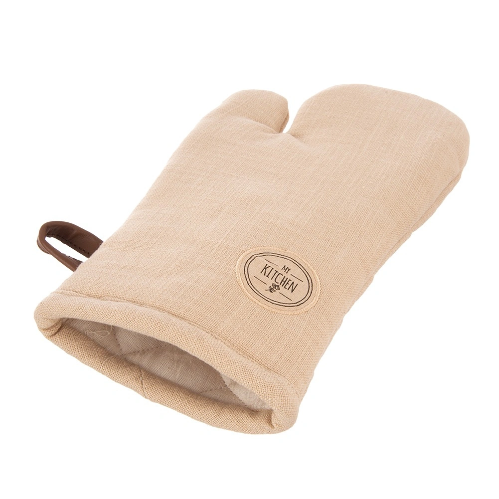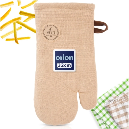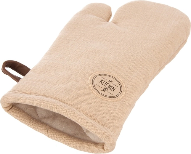 Mănușă de bucătărie bej, practică, din 100% bumbac, cu magnet integrat și agățătoare pentru suspendare. Mărimea universală 17,5 × 32 cm se potrivește atât pe mâna dreaptă, cât și pe cea stângă și oferă protecție fiabilă împotriva căldurii la gătit și copt. Poate fi spălată la 30 °C.