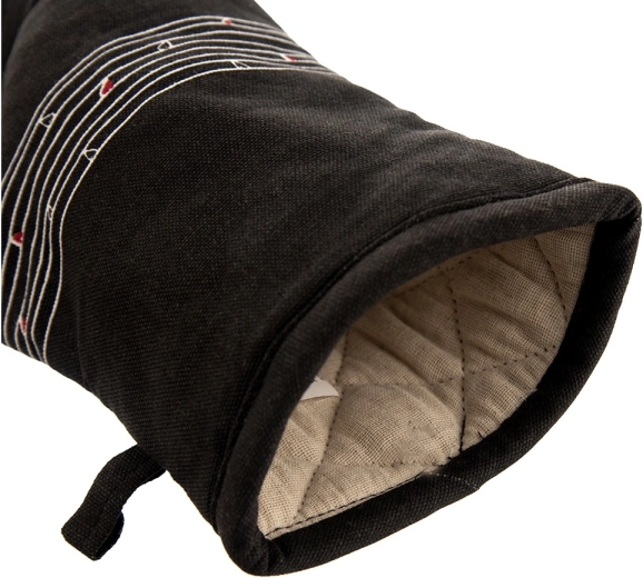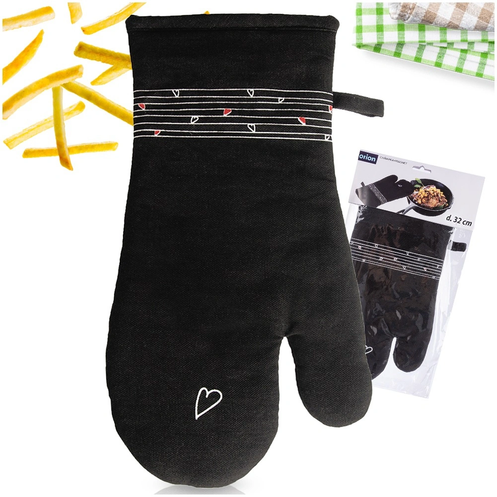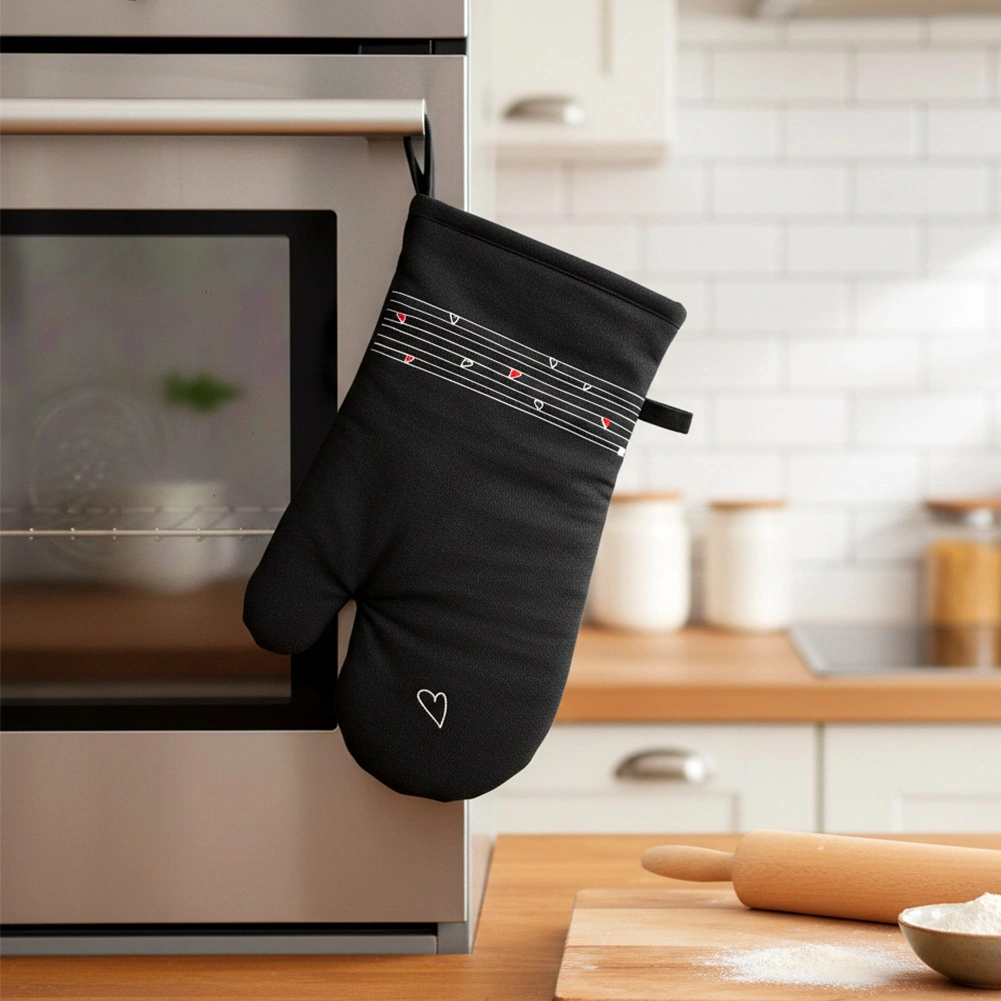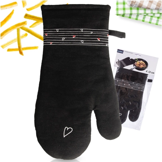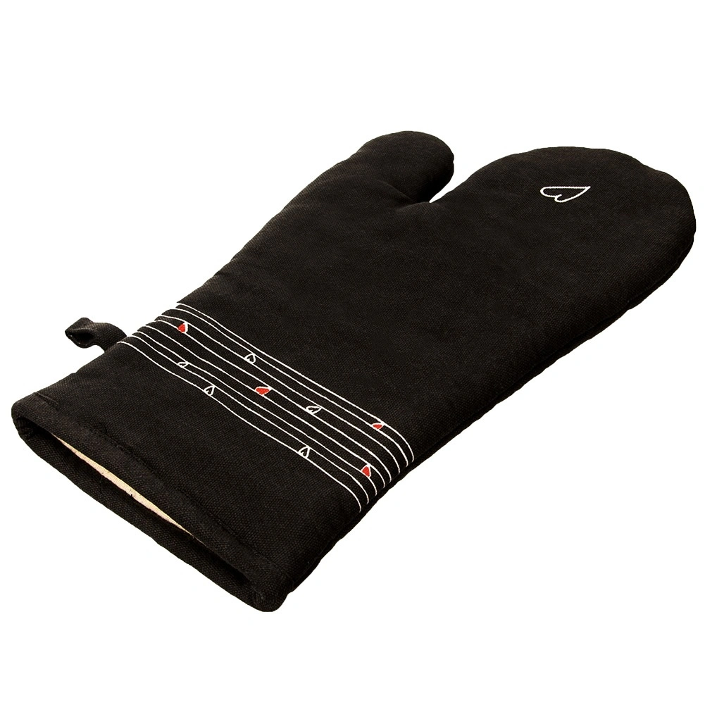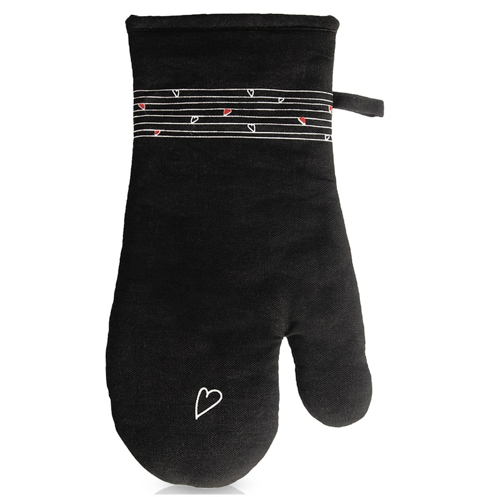 Această mănușă rezistentă din bumbac este un ajutor indispensabil la gătit și copt. Datorită matlasării de calitate și umpluturii moi, oferă protecție termică de încredere și se așază plăcut pe mână. Designul negru elegant, cu motiv discret de inimioare, se potrivește în orice bucătărie.