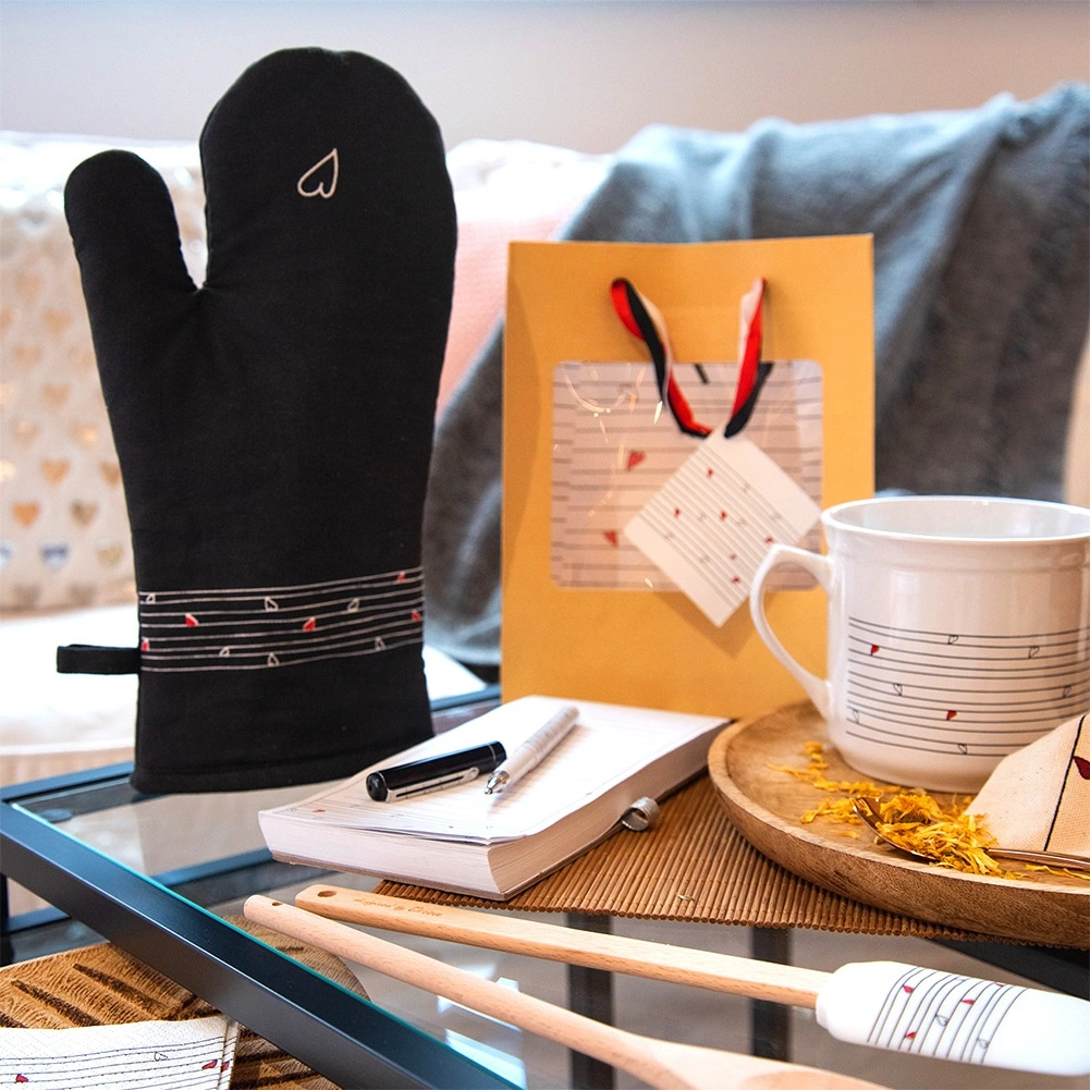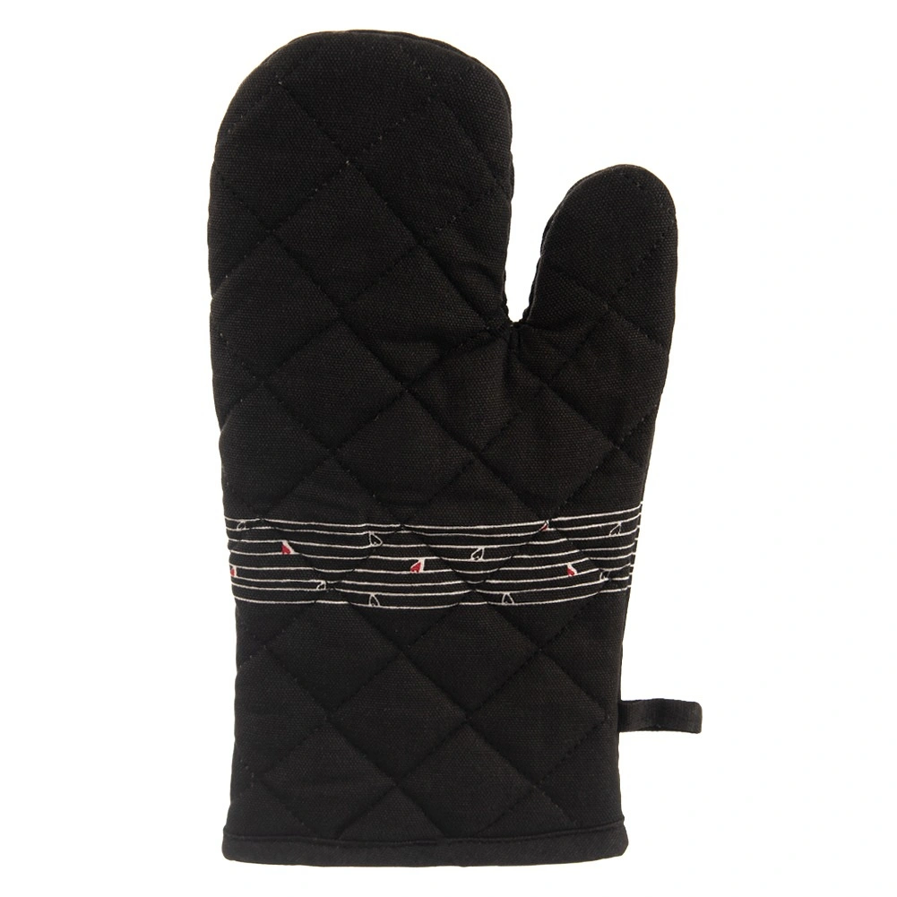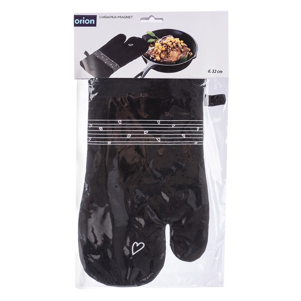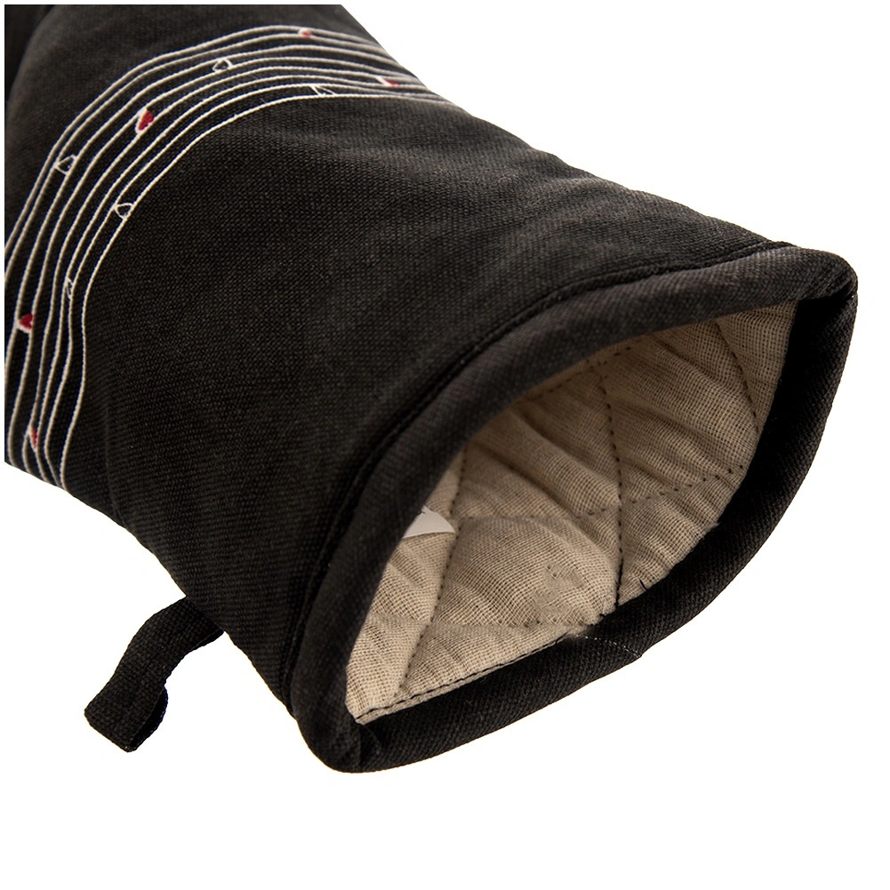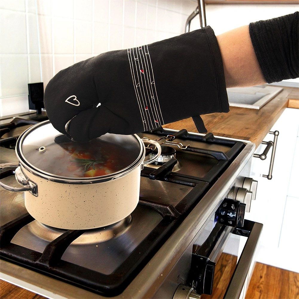 Această mănușă rezistentă din bumbac este un ajutor indispensabil la gătit și copt. Datorită matlasării de calitate și umpluturii moi, oferă protecție termică de încredere și se așază plăcut pe mână. Designul negru elegant, cu motiv discret de inimioare, se potrivește în orice bucătărie.