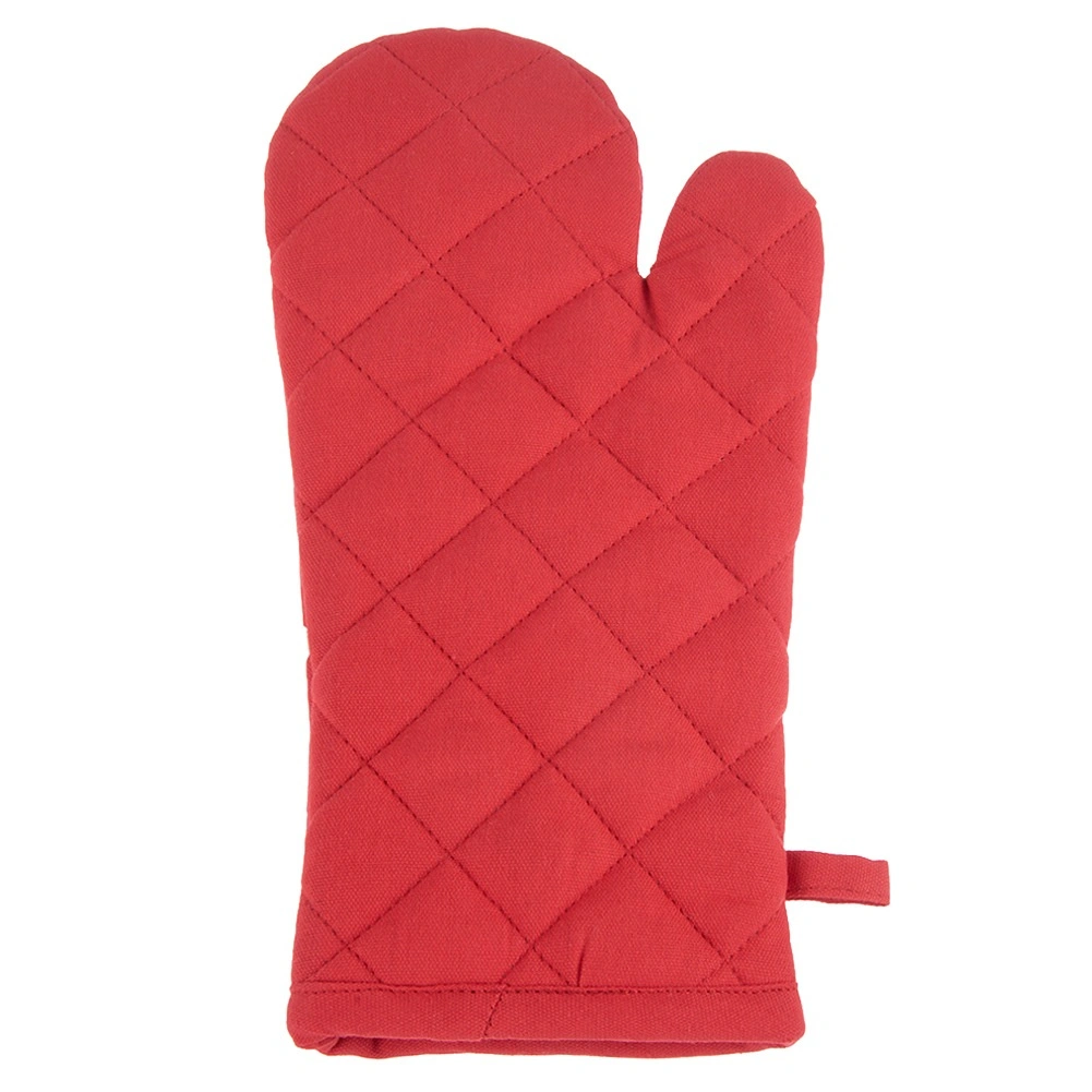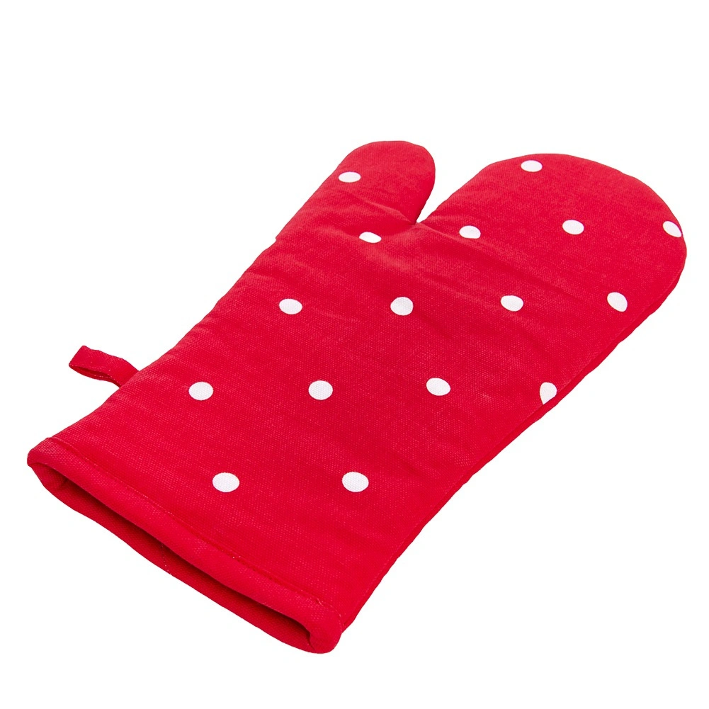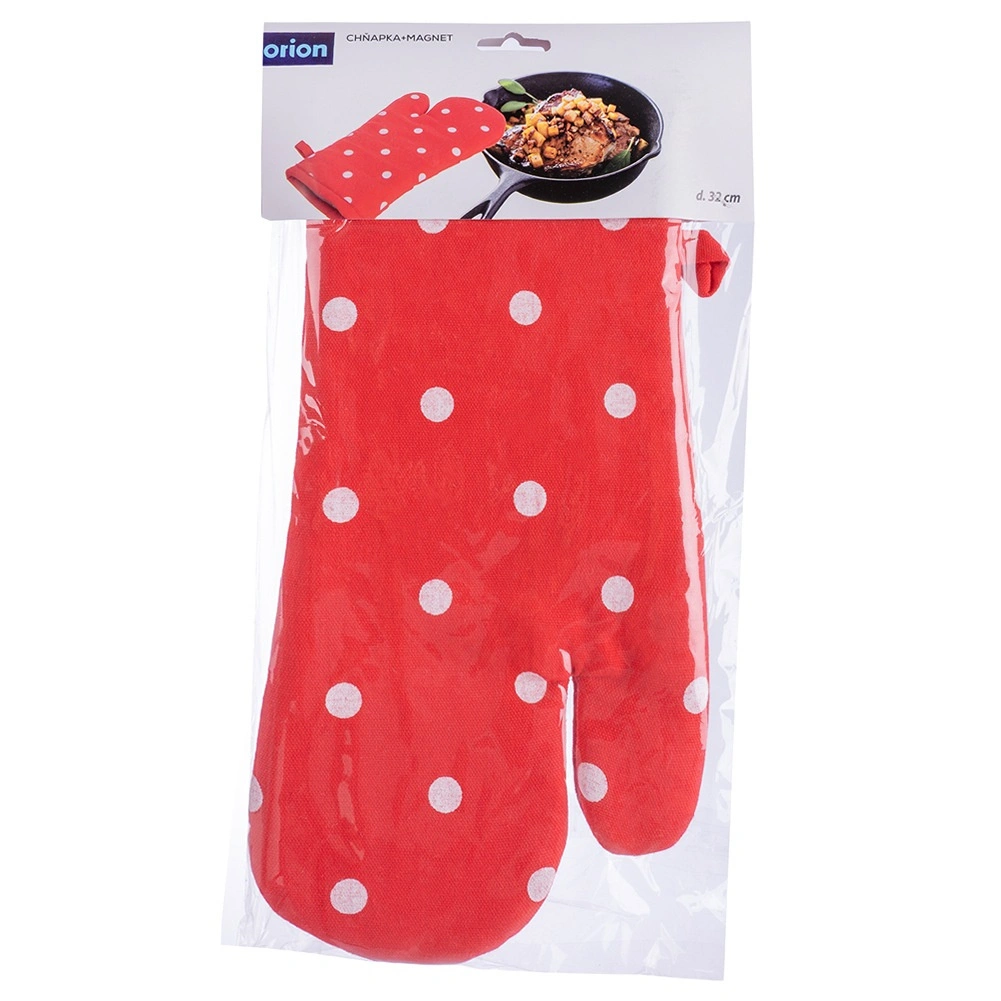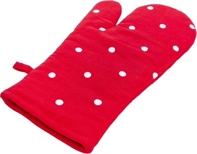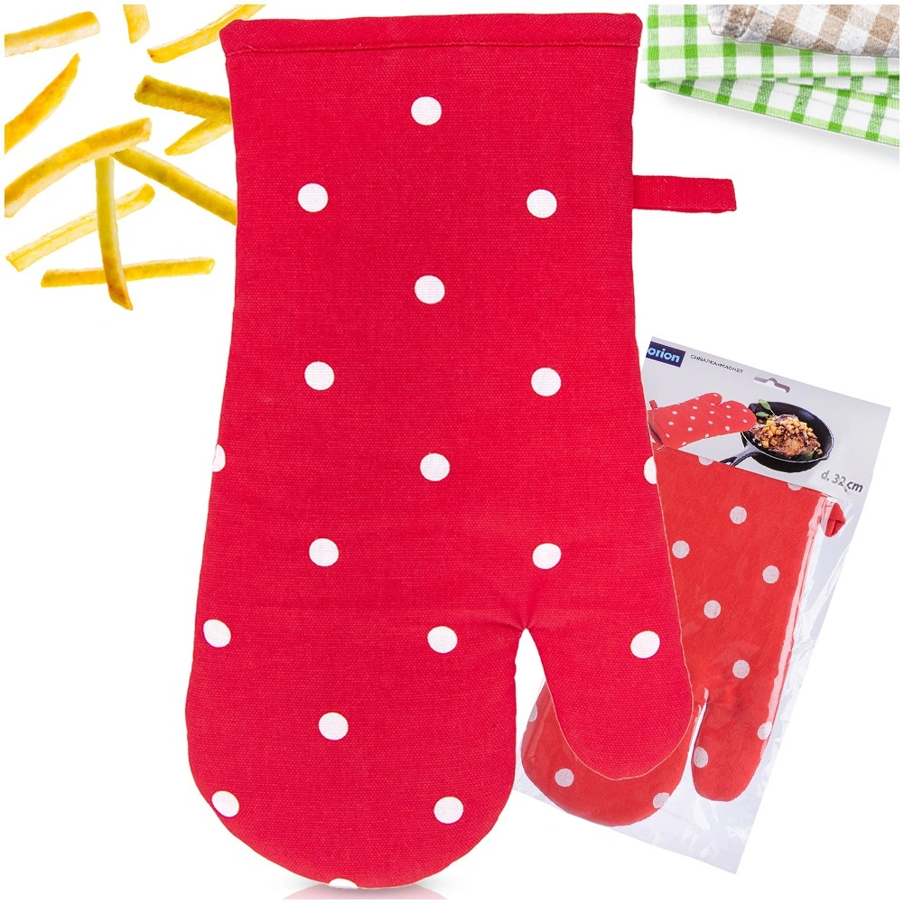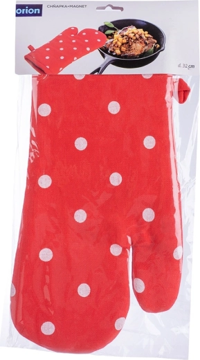 Această mănușă stilată, în culoare roșie cu buline albe, este realizată din 100% bumbac de calitate și oferă protecție termică sigură la manipularea tăvilor, vaselor de copt și a recipientelor fierbinți. Datorită dimensiunilor universale, se potrivește confortabil pe mâna dreaptă și pe cea stângă, iar prinderea sigură este asigurată de construcția matlasată, moale, cu căptușeală.