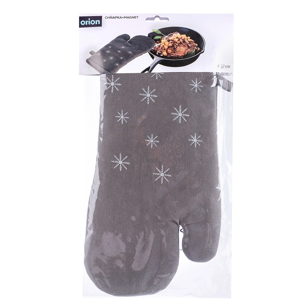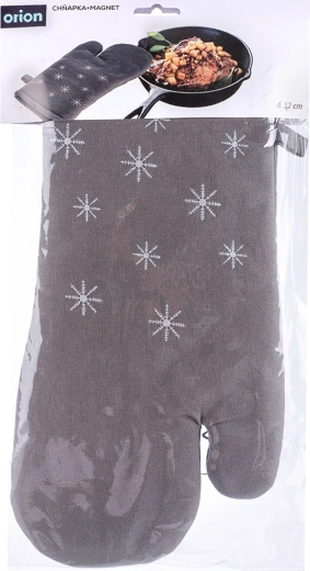 Mănușa de bucătărie practică din 100% bumbac, în culoare gri elegantă cu motiv de iarnă, asigură protecție fiabilă împotriva căldurii la gătit și copt. Datorită mărimii universale 17,5 × 32 cm se potrivește atât pe mâna dreaptă, cât și pe cea stângă, are magnet încorporat și agățătoare pentru atârnare și depozitare ușoară. Poate fi spălată la 30 °C. Calitate verificată marca ORION.
