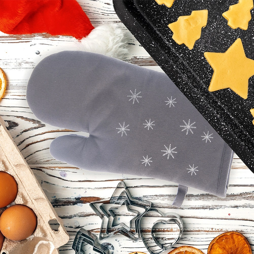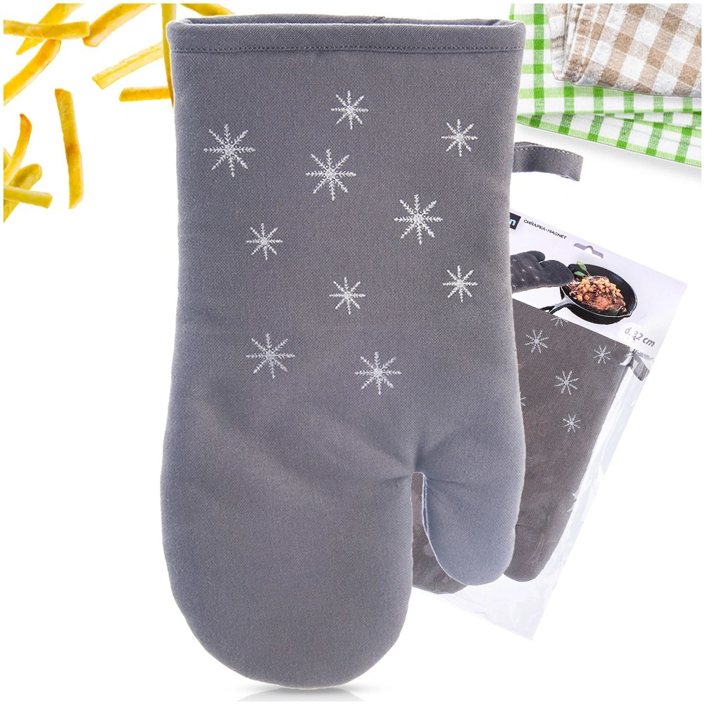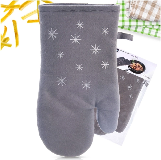 Mănușă din bumbac, stilată și funcțională, cu model discret de fulgi de zăpadă, protejează mâinile la manipularea vaselor și tăvilor fierbinți. Căptușeala moale și acoperirea completă a mâinii asigură prindere sigură și confort la gătitul de zi cu zi.