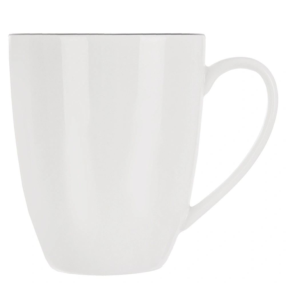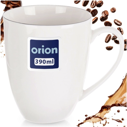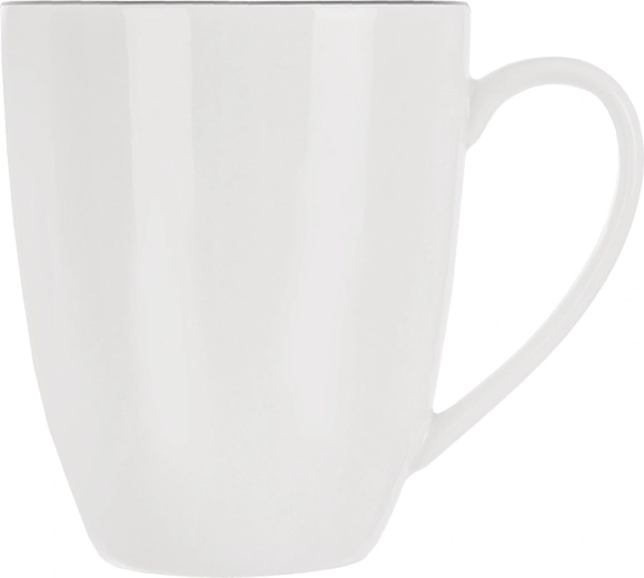 Cană elegantă din porțelan alb DECORA cu un volum de 390 ml, ideală pentru cafea, ceai și cacao. Are un design clasic cu o linie subțire neagră, toartă confortabilă și este potrivită pentru mașina de spălat vase și cuptorul cu microunde – perfectă pentru utilizare zilnică acasă și la birou.