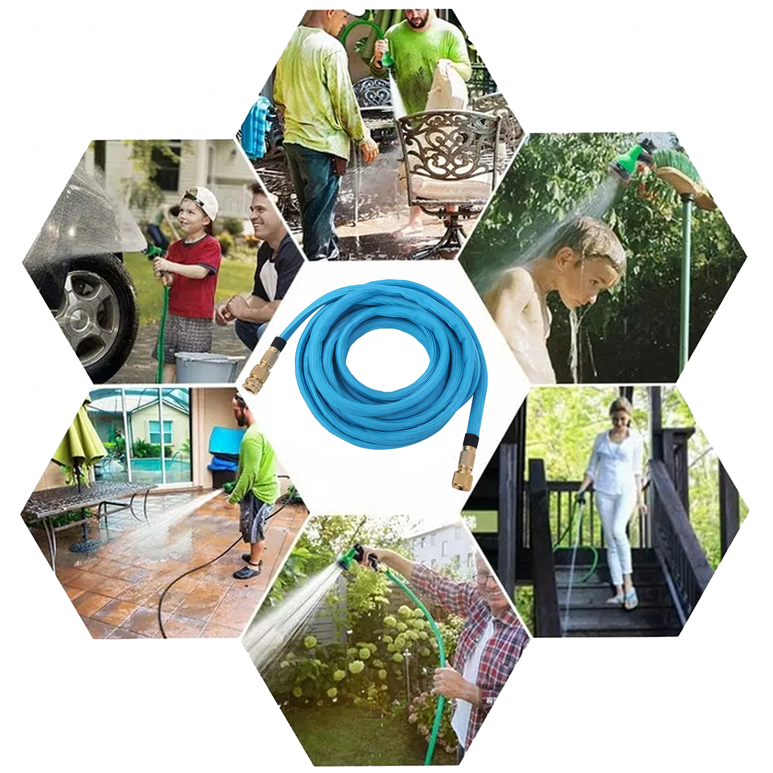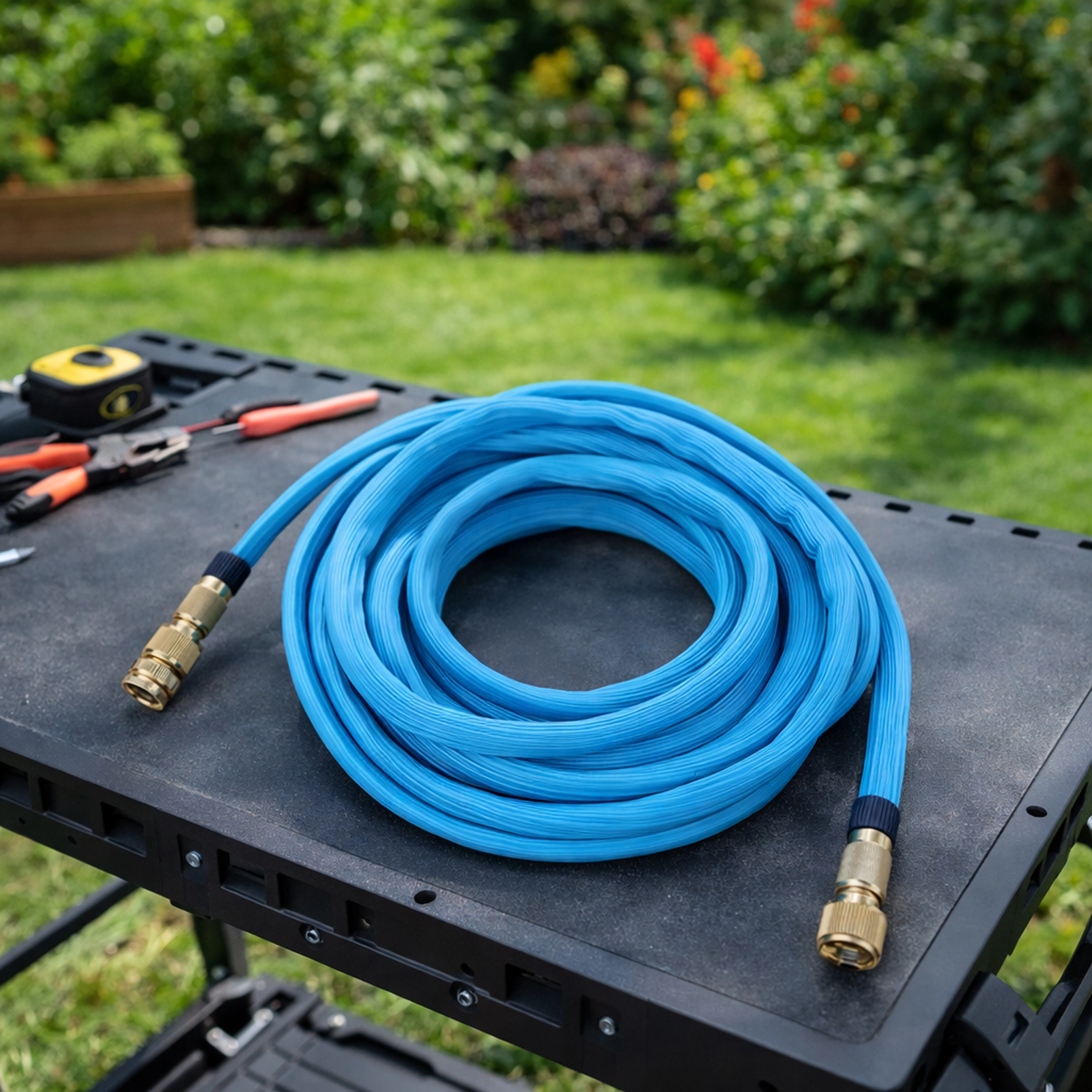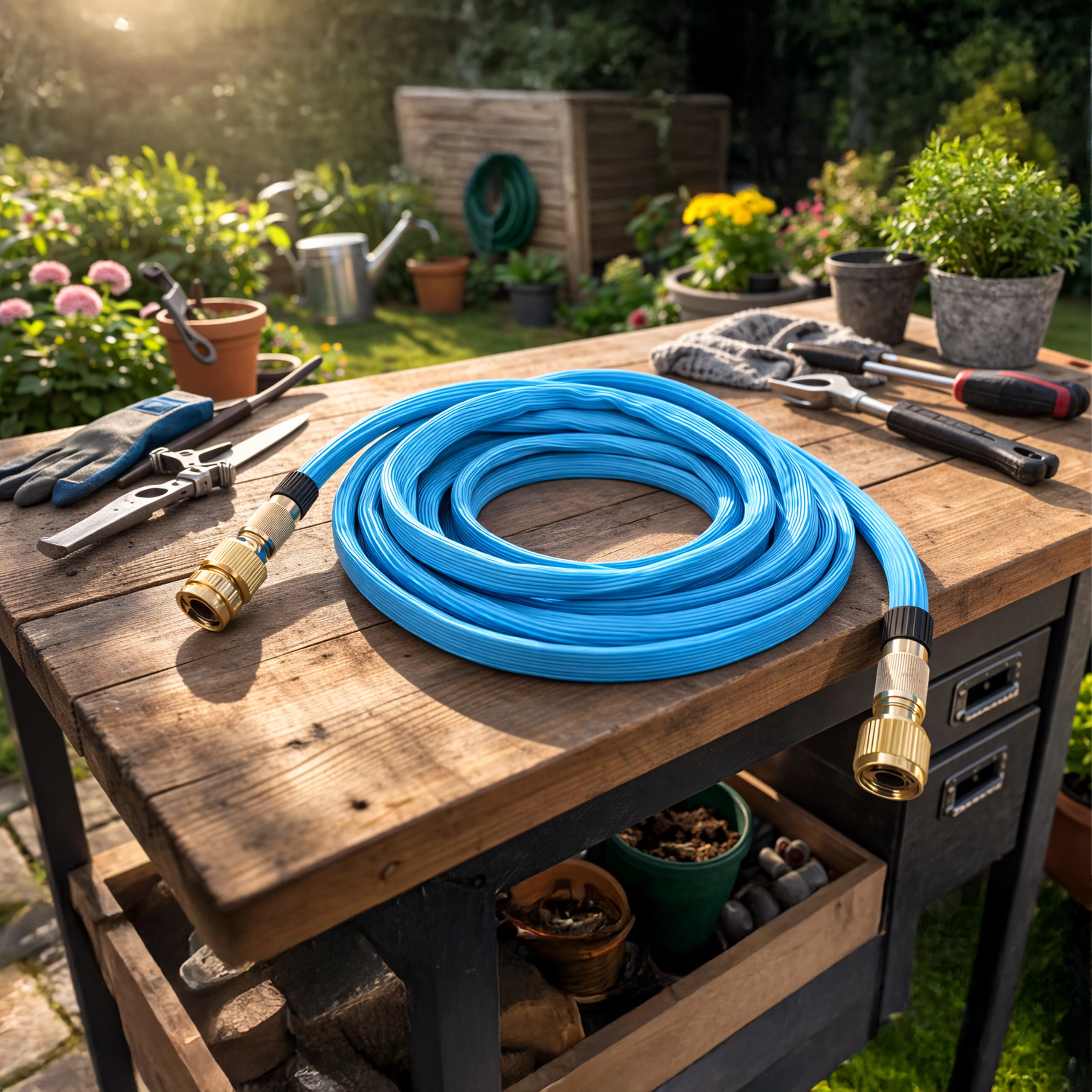 Utilizare versatilă în grădină, pe terasă și în jurul casei: udați comod straturile, spălați mașina, uneltele și mobilierul de grădină. Datorită greutății reduse și flexibilității, lucrul cu furtunul este rapid și fără efort. Compatibilitatea cu racorduri de 1/2" și 3/4" acoperă instalațiile casnice obișnuite.