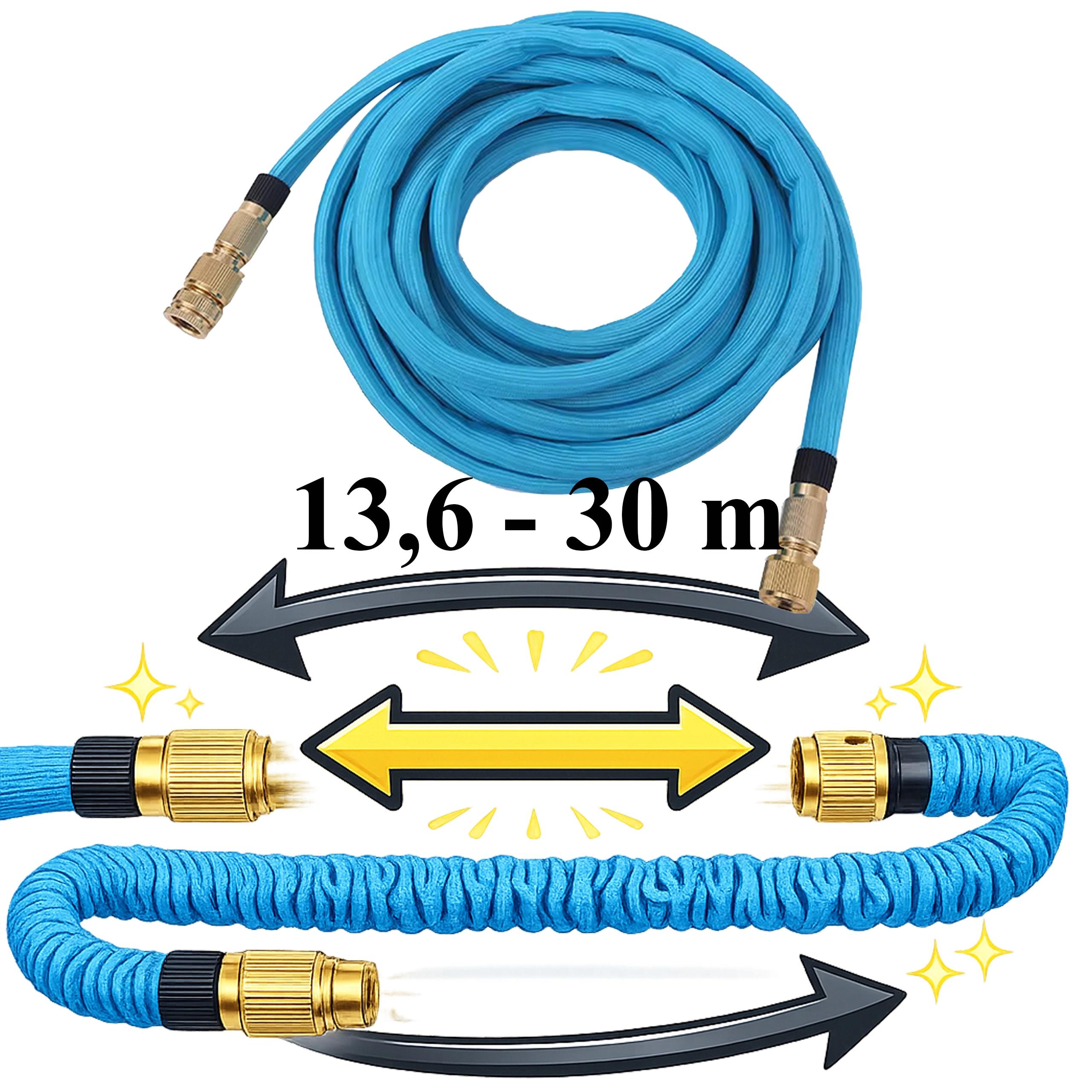 Furtunul se prelungește la presiunea apei de la 13,6 m până la 30 m și după utilizare se contractă singur. Ușor de transportat și depozitat fără dezordine.