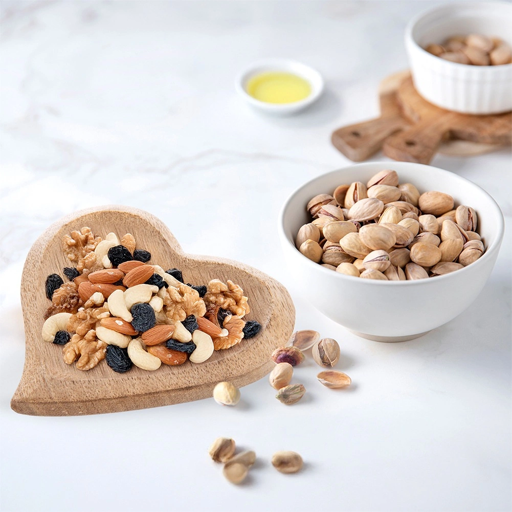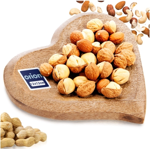 Designul în formă de inimă evidențiază prezentarea nucilor, măslinelor sau pralinelor și oferă mesei o atmosferă plăcută.