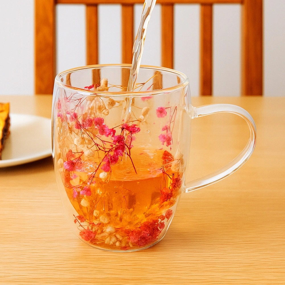 Cană elegantă din sticlă cu perete dublu, volum 360 ml, pentru cafeaua și ceaiul de zi cu zi. Datorită sticlei borosilicate, izolează excelent atât căldura, cât și frigul. Între pereți sunt amplasate flori uscate, care creează un design original. Peretele dublu menține băutura caldă sau rece mai mult timp, iar suprafața exterioară rămâne plăcută la atingere. Urechea confortabilă asigură o prindere comodă.